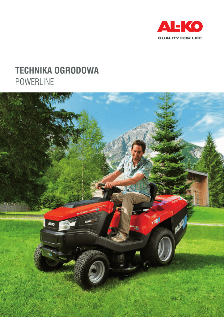 Technika ogrodowa Powerline Technika ogrodowa Najprzyjemniej odpoczywa się w pięknym ogrodzie – przede wszystkim, gdy trawa jest perfekcyjnie przystrzyżona, a ogród zadbany. Aby osiągnąć ten efekt, wystarczy kilka zręcznych ruchów i naturalnie właściwe urządzenia: Strona Traktorki do koszenia trawy .................................... 10 – 17 Roboty do koszenia Robolinho© . ........................... 18 – 23 Kosiarki spalinowe ................................................. 24 – 35 Kosiarki elektryczne ............................................... 36 – 41 Kosy spalinowe....................................................... 42 – 43 Kosiarki listwowe.................................................... 44 – 45 Urządzenia kombi.................................................... 46 – 47 Rozdrabniarki ......................................................... 48 – 49 Odkurzacze do liści................................................. 50 – 51 AL‑KO dla dzieci..................................................... 52 – 53 2I 3 Przeszłość i teraźniejszość Spółka AL‑KO KOBER SE, którą w 1931 r. zało‑ żył Alois Kober jako małą ślusarnię w miejsco‑ wości Großkötz położonej w Szwabii w Bawarii niedaleko Günzburg, posiada dziś łącznie 50 za‑ kładów i zatrudnia 4200 pracowników na całym świecie i jest zaliczana do wiodących dostaw‑ ców dla sektora techniki motoryzacyjnej, urzą‑ dzeń ogrodowych i techniki powietrznej. Aktu‑ alnie w trzecim pokoleniu właścicieli rodzinna firma jest zarządzana nadal zgodnie z zasadami przyświecającymi jej założycielowi – stałe dąże‑ nie do jakości, innowacyjności i przemyślanej funkcjonalności, idące w parze z nowoczesnym wzornictwem, komfortem i niezawodnością. www.al-ko.com/garden Zarząd spółki AL‑KO KOBER SE (od lewej): Roland, Stefan i Harald Kober więcej RAdOści w OGROdzie Od ponad 40 lat opracowujemy i produkujemy innowacyjne urządzenia ogrodowe, spełniają‑ ce najróżniejsze wymagania i przeznaczone do najróżniejszych obszarów. Nasze wieloletnie doświadczenie przejawia się nie tylko w rozwią‑ zaniach technicznych i funkcjach naszych urzą‑ dzeń – wyznaczamy nowe horyzonty także pod względem wzornictwa. Lecz czym byłyby nasze innowacje bez naszych Klientów, bez Państwa? To dopiero Klienci przyczyniają się do sukcesu naszych urządzeń ogrodowych. dlatego staramy się zafascynować Państwa – aby mogli Państwo każdego dnia stanąć w swoim ogrodowym raju i powiedzieć: „idealnie!”. Poznaj świat AL‑KO i nasze wysokiej jakości produkty – z pewnością znajdzie się wśród nich urządzenie odpowiednie do Państwa wymagań. życzymy wiele przyjemności podczas przeglą‑ dania katalogu i poznawania asortymentu – i naturalnie podczas pracy z użyciem urządzeń ogrodowych AL‑KO. Antonio de filippo członek zarządu wolfgang hergeth członek zarządu Zarząd spółki AL‑KO GERÄTE GMBH (od lewej): Wolfgang Hergeth i Antonio De Filippo. życie dLA jAKOści od wiejskiej kUŹni do światowego koncernU 4I 5 Wśród zieleni w zakładzie w Obdach w Austrii powstają kosiarki spalinowe Powerline. Przekonująca jakość AL‑KO – kosiarki do trawy „made in Austria”. Dokładnie tutaj, w spokojnej miejscowości Obdach w Styrii, od 1966 roku produkujemy wysokiej jakości urządzenia ogrodowe. Rodzin‑ na firma działająca elastycznie i niezawodnie, by zawsze spełniać życzenia swoich partnerów handlowych i klientów. AL‑KO od wewnątrz SKONSTRUOWANO W NIEMCZECH – WYPRODUKOWANO W AUSTRII www.al-ko.com/garden Stale o krok naprzód AL‑KO – urządzenia ogrodowe skonstruowa‑ ne w Niemczech – „engineered in Germany”. Niedaleko miejscowości Günzburg położonej w Szwabii w Bawarii od ponad 40 lat konstru‑ ujemy i opracowujemy urządzenia ogrodnicze, które łączą w sobie innowacyjność, najwyższą jakość i najnowszą technikę. Stale w poszuki‑ waniu najlepszych rozwiązań, zawsze z zamia‑ rem stworzenia urządzeń przyszłościowych. Od surowców do gotowego produktu – kosiarki benzynowe do trawy Powerline są produkowane stopniowo z zamiłowaniem do szczegółów 6I 7 Jaka kosiarka do jakiego ogrodu? Z nami znajdą Państwo właściwą kosiarkę, spełniającą Państwa wymagania Jak długo chcą Państwo kosić? W zależności od powierzchni zaleca się wybór mniejszej lub większej kosiarki. Decydujące znaczenie dla czasu trwania koszenia ma szerokość koszenia. Zasadniczo obowiązuje zasada: im większa szerokość kosze‑ nia, tym szybciej ukończy się koszenie. Ponadto mniejsza jest częstotli‑ wość opróżniania kosza, ponieważ w przypadku szerszych kosiarek kosz na trawę jest zazwyczaj większy. W przeciwieństwie do robota do kosze‑ nia na kosiarce można się wygodnie oprzeć. Chcą Państwo funkcję mulczowa‑ nia lub wyrzutu bocznego? Spalinowe kosiarki AL‑KO to mistrzowie w swoim fachu – także w dzie‑ dzinie mulczowania i wyrzutu bocznego. Wiele modeli można błyska‑ wicznie przebudować bez użycia narzędzi przez zamontowanie klina do mulczowania lub wyrzutu bocznego. Należy zwrócić przy tym uwagę na funkcje 3inONE lub 4inONE. Jak ukształtowany jest Państwa ogród? Mały z niewielką powierzchnią trawnika, średniej wielkości z rabatami i wzniesieniami lub duży i rozległy – niezależnie od wyglądu Państwa ogrodu i Państwa wymagań w zakresie komfortu znajdziemy zawsze wła‑ ściwe rozwiązanie: od małej kosiarki elektrycznej z szerokością koszenia 33 cm, poprzez kosiarkę spalinową z bezstopniowo regulowanym napę‑ dem kół, po traktorek do koszenia trawy z szerokością koszenia 125 cm lub robot do koszenia. www.al-ko.com/garden Szerokość koszenia 125 cm 105 cm 3 minuty, 1 – 2-krotne opróżnianie 95 cm 51 cm 4 minuty, 1 – 2-krotne opróżnianie 46 cm 42 cm 40 cm 6 minut, 1 – 2-krotne opróżnianie 38 cm 33 cm 