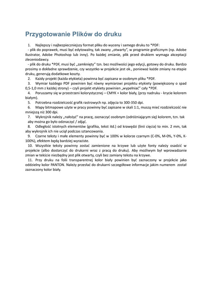 Przygotowanie Plików do druku 1. Najlepszy i najbezpieczniejszy format pliku do wyceny i samego druku to *PDF: - plik do poprawek, musi być edytowalny, tak zwany „otwarty”, w programie graficznym (np. Adobe Ilustrator, Adobe Photoshop lub inny). Po każdej zmianie, plik przed drukiem wymaga akceptacji zleceniodawcy. - plik do druku *PDF, musi być „zamknięty” tzn. bez możliwości jego edycji, gotowy do druku. Bardzo prosimy o dokładne sprawdzenie, czy wszystko w projekcie jest ok., ponieważ każde zmiany na etapie druku, generują dodatkowe koszty. 2. Każdy projekt (każda etykieta) powinna być zapisana w osobnym pliku *PDF. 3. Wymiar każdego PDF powinien być równy wymiarowi projektu etykiety (powiększony o spad 0,5-1,0 mm z każdej strony) – czyli projekt etykiety powinien „wypełniać” cały *PDF. 4. Poruszamy się w przestrzeni kolorystycznej – CMYK + kolor biały, (przy nadruku - krycie kolorem białym). 5. Potrzebna rozdzielczość grafik rastrowych np. zdjęcia to 300-350 dpi. 6. Mapy bitmapowe użyte w pracy powinny być zapisane w skali 1:1, muszą mieć rozdzielczość nie mniejszą niż 300 dpi. 7. Wykrojnik należy „nałożyć” na pracę, zaznaczyć osobnym (odróżniającym się) kolorem, tzn. tak aby można go było odznaczyć / zdjąć. 8. Odległość istotnych elementów (grafika, tekst itd.) od krawędzi (linii cięcia) to min. 2 mm, tak aby wykrojnik ich nie uciął podczas sztancowania. 9. Czarne teksty i małe elementy powinny być w 100% w kolorze czarnym (C-0%, M-0%, Y-0%, K100%), efektem będą bardziej wyraziste. 10. Wszystkie teksty powinny zostać zamienione na krzywe lub użyte fonty należy osadzić w projekcie (albo dostarczyć do drukarni wraz z pracą do druku). Aby możliwym był wprowadzanie zmian w tekście niezbędny jest plik otwarty, czyli bez zamiany tekstu na krzywe. 11. Przy druku na folii transparentnej kolor biały powinien być zaznaczony w projekcie jako oddzielny kolor PANTON. Należy przesłać do drukarni szczegółowe informacje jakim numerem został zaznaczony kolor biały.
