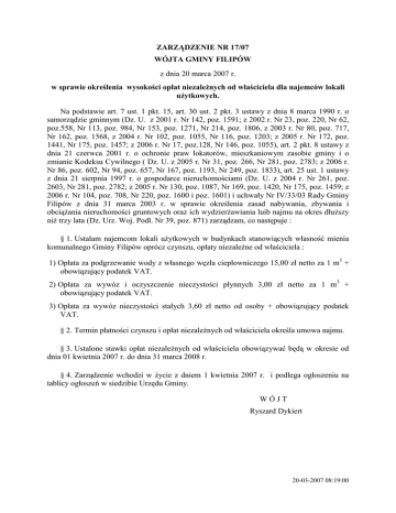 ZARZĄDZENIE NR 17/07 WÓJTA GMINY FILIPÓW z dnia 20 marca 2007 r. w sprawie określenia wysokości opłat niezaleŜnych od właściciela dla najemców lokali uŜytkowych. Na podstawie art. 7 ust. 1 pkt. 15, art. 30 ust. 2 pkt. 3 ustawy z dnia 8 marca 1990 r. o samorządzie gminnym (Dz. U. z 2001 r. Nr 142, poz. 1591; z 2002 r. Nr 23, poz. 220, Nr 62, poz.558, Nr 113, poz. 984, Nr 153, poz. 1271, Nr 214, poz. 1806, z 2003 r. Nr 80, poz. 717, Nr 162, poz. 1568, z 2004 r. Nr 102, poz. 1055, Nr 116, poz. 1203; z 2005 r. Nr 172, poz. 1441, Nr 175, poz. 1457; z 2006 r. Nr 17, poz.128, Nr 146, poz. 1055), art. 2 pkt. 8 ustawy z dnia 21 czerwca 2001 r. o ochronie praw lokatorów, mieszkaniowym zasobie gminy i o zmianie Kodeksu Cywilnego ( Dz. U. z 2005 r. Nr 31, poz. 266, Nr 281, poz. 2783; z 2006 r. Nr 86, poz. 602, Nr 94, poz. 657, Nr 167, poz. 1193, Nr 249, poz. 1833), art. 25 ust. 1 ustawy z dnia 21 sierpnia 1997 r. o gospodarce nieruchomościami (Dz. U. z 2004 r. Nr 261, poz. 2603, Nr 281, poz. 2782; z 2005 r. Nr 130, poz. 1087, Nr 169, poz. 1420, Nr 175, poz. 1459; z 2006 r. Nr 104, poz. 708, Nr 220, poz. 1600 i poz. 1601) i uchwały Nr IV/33/03 Rady Gminy Filipów z dnia 31 marca 2003 r. w sprawie określenia zasad nabywania, zbywania i obciąŜania nieruchomości gruntowych oraz ich wydzierŜawiania luib najmu na okres dłuŜszy niŜ trzy lata (Dz. Urz. Woj. Podl. Nr 39, poz. 871) zarządzam, co następuje : § 1. Ustalam najemcom lokali uŜytkowych w budynkach stanowiących własność mienia komunalnego Gminy Filipów oprócz czynszu, opłaty niezaleŜne od właściciela : 1) Opłata za podgrzewanie wody z własnego węzła ciepłowniczego 15,00 zł netto za 1 m3 + obowiązujący podatek VAT. 2) Opłata za wywóz i oczyszczenie nieczystości płynnych 3,00 zł netto za 1 m3 + obowiązujący podatek VAT. 3) Opłata za wywóz nieczystości stałych 3,60 zł netto od osoby + obowiązujący podatek VAT. § 2. Termin płatności czynszu i opłat niezaleŜnych od właściciela określa umowa najmu. § 3. Ustalone stawki opłat niezaleŜnych od właściciela obowiązywać będą w okresie od dnia 01 kwietnia 2007 r. do dnia 31 marca 2008 r. § 4. Zarządzenie wchodzi w Ŝycie z dniem 1 kwietnia 2007 r. i podlega ogłoszeniu na tablicy ogłoszeń w siedzibie Urzędu Gminy. WÓJT Ryszard Dykiert 20-03-2007 08:19:00