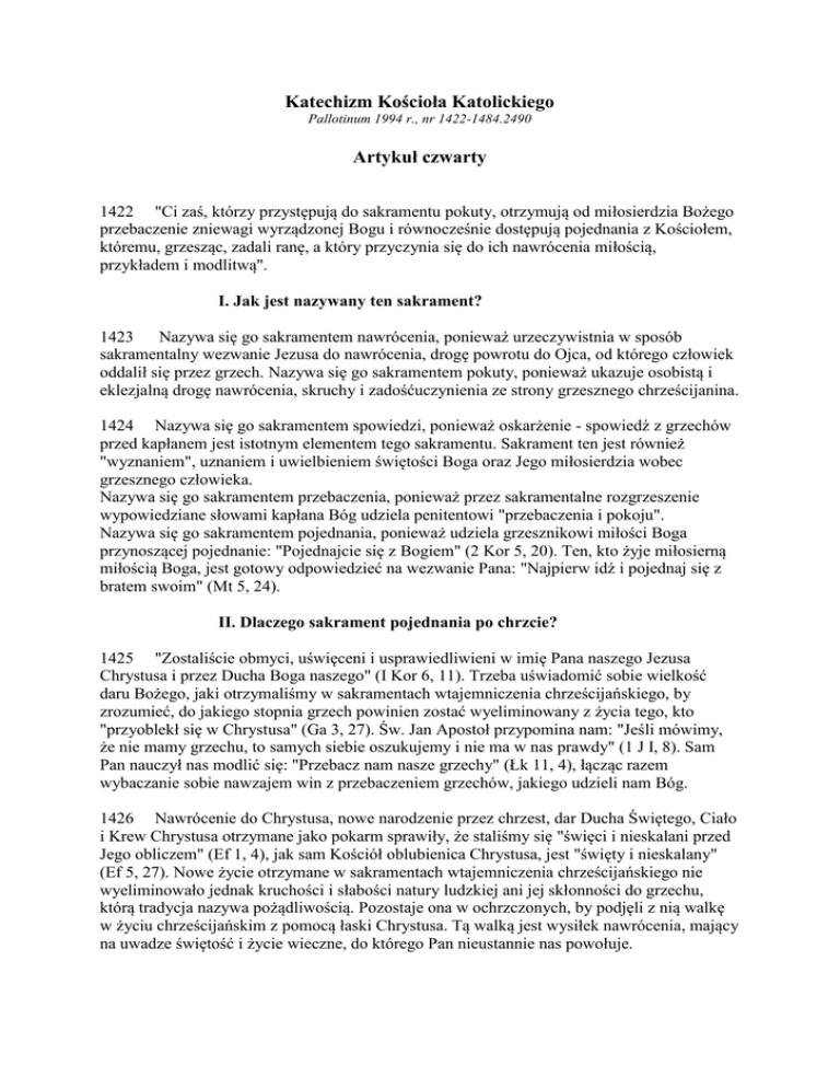Katechizm Kościoła Katolickiego Pallotinum 1994 r., nr 1422-1484.2490 Artykuł czwarty 1422 "Ci zaś, którzy przystępują do sakramentu pokuty, otrzymują od miłosierdzia Bożego przebaczenie zniewagi wyrządzonej Bogu i równocześnie dostępują pojednania z Kościołem, któremu, grzesząc, zadali ranę, a który przyczynia się do ich nawrócenia miłością, przykładem i modlitwą". I. Jak jest nazywany ten sakrament? 1423 Nazywa się go sakramentem nawrócenia, ponieważ urzeczywistnia w sposób sakramentalny wezwanie Jezusa do nawrócenia, drogę powrotu do Ojca, od którego człowiek oddalił się przez grzech. Nazywa się go sakramentem pokuty, ponieważ ukazuje osobistą i eklezjalną drogę nawrócenia, skruchy i zadośćuczynienia ze strony grzesznego chrześcijanina. 1424 Nazywa się go sakramentem spowiedzi, ponieważ oskarżenie - spowiedź z grzechów przed kapłanem jest istotnym elementem tego sakramentu. Sakrament ten jest również "wyznaniem", uznaniem i uwielbieniem świętości Boga oraz Jego miłosierdzia wobec grzesznego człowieka. Nazywa się go sakramentem przebaczenia, ponieważ przez sakramentalne rozgrzeszenie wypowiedziane słowami kapłana Bóg udziela penitentowi "przebaczenia i pokoju". Nazywa się go sakramentem pojednania, ponieważ udziela grzesznikowi miłości Boga przynoszącej pojednanie: "Pojednajcie się z Bogiem" (2 Kor 5, 20). Ten, kto żyje miłosierną miłością Boga, jest gotowy odpowiedzieć na wezwanie Pana: "Najpierw idź i pojednaj się z bratem swoim" (Mt 5, 24). II. Dlaczego sakrament pojednania po chrzcie? 1425 "Zostaliście obmyci, uświęceni i usprawiedliwieni w imię Pana naszego Jezusa Chrystusa i przez Ducha Boga naszego" (I Kor 6, 11). Trzeba uświadomić sobie wielkość daru Bożego, jaki otrzymaliśmy w sakramentach wtajemniczenia chrześcijańskiego, by zrozumieć, do jakiego stopnia grzech powinien zostać wyeliminowany z życia tego, kto "przyoblekł się w Chrystusa" (Ga 3, 27). Św. Jan Apostoł przypomina nam: "Jeśli mówimy, że nie mamy grzechu, to samych siebie oszukujemy i nie ma w nas prawdy" (1 J I, 8). Sam Pan nauczył nas modlić się: "Przebacz nam nasze grzechy" (Łk 11, 4), łącząc razem wybaczanie sobie nawzajem win z przebaczeniem grzechów, jakiego udzieli nam Bóg. 1426 Nawrócenie do Chrystusa, nowe narodzenie przez chrzest, dar Ducha Świętego, Ciało i Krew Chrystusa otrzymane jako pokarm sprawiły, że staliśmy się "święci i nieskalani przed Jego obliczem" (Ef 1, 4), jak sam Kościół oblubienica Chrystusa, jest "święty i nieskalany" (Ef 5, 27). Nowe życie otrzymane w sakramentach wtajemniczenia chrześcijańskiego nie wyeliminowało jednak kruchości i słabości natury ludzkiej ani jej skłonności do grzechu, którą tradycja nazywa pożądliwością. Pozostaje ona w ochrzczonych, by podjęli z nią walkę w życiu chrześcijańskim z pomocą łaski Chrystusa. Tą walką jest wysiłek nawrócenia, mający na uwadze świętość i życie wieczne, do którego Pan nieustannie nas powołuje. III. Nawrócenie ochrzczonych 1427 Jezus wzywa do nawrócenia. To wezwanie jest istotnym elementem głoszenia Królestwa: "Czas się wypełnił i bliskie jest Królestwo Boże. Nawracajcie się i wierzcie w Ewangelię!" (Mk 1,15). W przepowiadaniu Kościoła to wezwanie jest skierowane najpierw do tych, którzy nie znają jeszcze Chrystusa i Jego Ewangelii. W ten sposób chrzest jest głównym miejscem pierwszego i podstawowego nawrócenia. Przez wiarę w Dobrą Nowinę i przez chrzest człowiek wyrzeka się zła i uzyskuje zbawienie, to znaczy odpuszczenie wszystkich grzechów i dar nowego życia. 1428 Wezwanie Chrystusa do nawrócenia nadal jednak rozbrzmiewa w życiu chrześcijan. To drugie nawrócenie jest nieustannym zadaniem dla całego Kościoła, który obejmuje "w łonie swoim grzeszników" i który będąc "święty i zarazem ciągle potrzebujący oczyszczenia, podejmuje ustawicznie pokutę i odnowienie swoje". Ten wysiłek nawrócenia nie jest jedynie dziełem ludzkim. Jest on poruszeniem "skruszonego serca" (Ps 51, 19), pociągniętego i dotkniętego łaską, pobudzającą do odpowiedzi na miłosierną miłość Boga, który pierwszy nas umiłował. 1429 Świadczy o tym nawrócenie św. Piotra po jego trzykrotnym zaparciu się Nauczyciela. Pełne nieskończonego miłosierdzia spojrzenie Jezusa wywołuje u niego łzy skruchy (Łk 22, 61-62), a po zmartwychwstaniu Pana trzykrotnie wyznaje, że Go kocha. Drugie nawrócenie ma także wymiar wspólnotowy. Jest to widoczne w wezwaniu Pana skierowanym do całego Kościoła: "Nawróć się!" (Ap 2, 5. 16). Święty Ambroży mówi o dwóch rodzajach nawrócenia w Kościele: "Kościół ma wodę i łzy: wodę chrztu i łzy pokuty". IV. Pokuta wewnętrzna 1430 Podobnie jak u Proroków, wezwanie Jezusa do nawrócenia i pokuty nie ma na celu najpierw czynów zewnętrznych, "wora pokutnego i popiołu", postów i umartwień, lecz nawrócenie serca, pokutę wewnętrzną. Bez niej czyny pokutne pozostają bezowocne i kłamliwe. Przeciwnie, nawrócenie wewnętrzne skłania do uzewnętrznienia tej postawy przez znaki widzialne, gesty i czyny pokutne. 1431 Pokuta wewnętrzna jest radykalną przemianą całego życia, powrotem, nawróceniem się do Boga całym sercem, zerwaniem z grzechem, odwróceniem się od zła z odrazą do popełnionych przez nas złych czynów. Pokuta wewnętrzna zawiera równocześnie pragnienie i postanowienie zmiany życia oraz nadzieję na miłosierdzie Boże i ufność w pomoc Jego łaski. Temu nawróceniu serca towarzyszy zbawienny ból i smutek, który Ojcowie Kościoła nazywali smutkiem duszy (animi cruciatus) i skruchą serca (compunctio cordis). 1432 Serce człowieka jest ociężałe i zatwardziałe. Trzeba, by Bóg dał człowiekowi serce nowe. Nawrócenie jest najpierw dziełem łaski Boga, który sprawia, że nasze serca wracają do Niego: "Nawróć nas, Panie, do Ciebie wrócimy" (Lm 5, 21). Bóg daje nam siłę z
