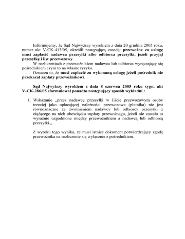 Informujemy, że Sąd Najwyższy wyrokiem z dnia 20 grudnia 2005 roku, numer akt V-CK-413/05, określił następującą zasadę: przewoźne za usługę musi zapłacić nadawca przesyłki albo odbiorca przesyłki, jeżeli przyjął przesyłkę i list przewozowy. W rozliczeniach z przewoźnikiem nadawca lub odbiorca wyręczający się pośrednikiem czyni to na własne ryzyko. Oznacza to, że musi zapłacić za wykonaną usługę jeżeli pośrednik nie przekazał zapłaty przewoźnikowi. Sąd Najwyższy wyrokiem z dnia 8 czerwca 2005 roku sygn. akt V-CK-286/05 sformułował ponadto następujący sposób wykładni : 1. Wskazanie „przez nadawcę przesyłki w liście przewozowym osoby trzeciej jako opłacającej należności przewozowe (płatnika) nie jest równoznaczne ze zwolnieniem nadawcy lub odbiorcy przesyłki z ciążącego na nich obowiązku zapłaty przewoźnego, jeżeli nie zostało to wyraźnie uzgodnione między przewoźnikiem a nadawcą lub odbiorcą przesyłki.„ Z wyroku tego wynika, że musi istnieć dokument potwierdzający zgodę przewoźnika na rozliczenie się wyłącznie z pośrednikiem.
