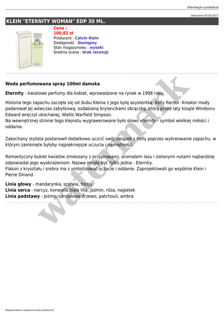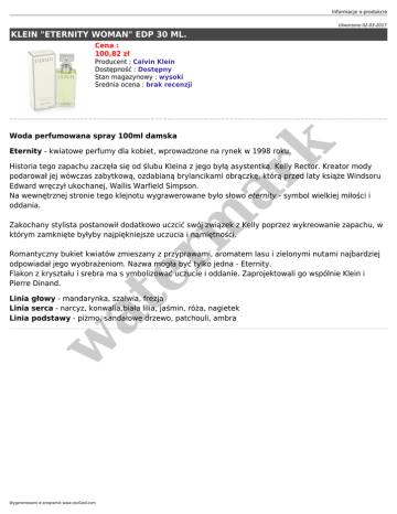 Informacje o produkcie Utworzono 02-03-2017 KLEIN "ETERNITY WOMAN" EDP 30 ML. Cena : 100,82 zł Producent : Calvin Klein Dostępność : Dostępny Stan magazynowy : wysoki Średnia ocena : brak recenzji er m ar k Woda perfumowana spray 100ml damska Eternity - kwiatowe perfumy dla kobiet, wprowadzone na rynek w 1998 roku. Historia tego zapachu zaczęła się od ślubu Kleina z jego byłą asystentką, Kelly Rector. Kreator mody podarował jej wówczas zabytkową, ozdabianą brylancikami obrączkę, którą przed laty książe Windsoru Edward wręczył ukochanej, Wallis Warfield Simpson. Na wewnętrznej stronie tego klejnotu wygrawerowane było słowo eternity - symbol wielkiej miłości i oddania. Zakochany stylista postanowił dodatkowo uczcić swój związek z Kelly poprzez wykreowanie zapachu, w którym zamknięte byłyby najpiękniejsze uczucia i namiętności. Romantyczny bukiet kwiatów zmieszany z przyprawami, aromatem lasu i zielonymi nutami najbardziej odpowiadał jego wyobrażeniom. Nazwa mogła być tylko jedna - Eternity. Flakon z kryształu i srebra ma s ymbolizować uczucie i oddanie. Zaprojektowali go wspólnie Klein i Pierre Dinand. w at Linia głowy - mandarynka, szałwia, frezja Linia serca - narcyz, konwalia,biała lilia, jaśmin, róża, nagietek Linia podstawy - piżmo, sandałowe drzewo, patchouli, ambra Wygenerowano w programie www.oscGold.com