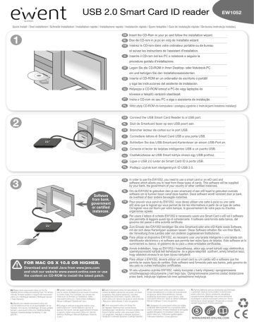 USB 2.0 Smart Card ID reader EW1052 Quick Install | Snel installeren | Schnelle Installation | Installation rapide | Installazione rapida | Instalación rápida | Gyors telepítés | Guia de instalação rápida | Skrócona instrukcja instalacj EN NL FR IT DE ES Włóż płytę CD-ROM do komputera i postępuj zgodnie z instrukcjami kreatora instalacji EN Connect the USB Smart Card Reader to a USB port. NL Sluit de Smartcard lezer op een USB poort aan. FR Brancher lecteur de cartes sur le port USB. IT Connettere lettore di Smart Card USB a una porta USB. DE Schließen Sie das USB-Smartcard-Kartenleser an einem USB-Port an. ES Conecte el lector de tarjetas inteligentes USB a un puerto USB. Csatlakoztassa az USB Smart kártya olvasó egy USB-porthoz. Ligue o USB 2.0 Leitor de Smart Card ID à porta USB. Podłącz czytnik kart inteligentnych ID USB 2.0. 3 EN In order to use the EW1052, you need to use a smart card or an eID card and software which allows you to read from these types of cards. This software will be supplied by your bank, the government of your country or other certified instances. Om de EW1052 te gebruiken dien je een smartcard of een eID kaart te gebruiken evenals software om te kunnen lezen vanaf deze kaarten. Deze software wordt verstrekt door je bank, de overheid of door andere bevoegde instanties. FR Pour pouvoir vous servir du EW1052, vous devez utiliser une carte à puce ou une carte eID ainsi que le logiciel qui vous permet de lire les informations à partir de ce type de cartes. Ce logiciel vous est fourni par votre banque, le gouvernement de votre pays ou d’autres organismes agréés. IT Per usare il lettore di schede EW1052 è necessario usare una Smart Card o eID ed il software che permette di leggere questi tipi di schede/carte. Il software sarà fornito dalla banca, dal governo del paese o altra autorità certificata. DE Zum Einsatz des EW1052 benötigen Sie eine Smartcard oder eine eID-Karte sowie Software, mit der sich diese Kartentypen auslesen lassen. Diese Software erhalten Sie von Ihrer Bank, der Verwaltung Ihres Landes oder von anderen zugelassenen Institutionen. ES Para utilizar el dispositivo EW1052, es necesario usar una tarjeta inteligente o una tarjeta con identificador electrónico y el software que permita leer estos tipos de tarjetas. Este software se lo suministrará su banco, el gobierno de su país u otras entidades certificadas. Annak érdekében, hogy az EW1052-t használhassa, akkor egy smart kártyát vagy elektronikus személyazonosító kártyát kell behelyeznie és a gépre telepített szoftvert, amely lehetővé teszi, hogy adatokat olvassa le az ilyen típusú kártyákról. Para utilizar o EW1052, deverá utilizar um smart card ou um cartão eID e software que lhe permita ler esses tipos de cartões. Este software será fornecido pelo seu banco, pelo governo do seu país ou outras instituições certificadas. W celu używania czytnika EW1052, należy korzystać z karty chipowej i oprogramowania umożliwiającego odczytywanie z kart tego typu. Oprogramowanie powinno zostać dostarczone przez bank, instytucje rządowe lub inne upoważnione instytucje. NL Software from bank, government or certified instances. FOR MAC OS X 10.8 OR HIGHER. Download and install Java from www.java.com and visit our website www.ewent-online.com or use the content on CD-ROM to install the latest patch. EN Please check www.ewent-online.com for the helpdesk phone number and opening hours. For service, manuals, firmware updates or support visit www.ewentonline.com | Multilingual helpdesk | Multilingual manual | 5 Years Warranty | NL Bezoek onze website www.ewent-online.com voor het telefoonnummer en de openingstijden van de helpdesk. Voor service, handleidingen, firmware updates bezoekt u www.ewent-online.com | Nederlandstalige helpdesk | Nederlandstalige handleiding | 5 Jaar garantie | FR Veuillez consulter www.ewent-online.com pour le numéro de téléphone et les heures d’ouverture du centre d’aide. Pour l’entretien, les manuels, les mises à jour du firmware ou l’assistance, visitez www.ewent-online.com. Centre d’aide multilingue | Manuel multilingue | Garantie de 5 ans | ES Visite www.ewent-online.com para obtener el número de teléfono del servicio de ayuda y el horario de apertura. Para obtener asistencia, manuales, actualizaciones de firmware o soporte, visite www. ewent-online.com. Servicio de ayuda en varios idiomas | Manual en varios idiomas | 5 años de garantía | PT Visite www.ewent-online.com para consultar o número de telefone do e o horário de funcionamento do apoio ao cliente. Para assistência, manuais, atualizações de firmware ou apoio técnico, visite www.ewent-online.com. Apoio ao cliente multilingue | Manual multilingue | 5 anos de garantia | IT Si prega di verificare al seguente indirizzo www. ewent-online.com i numeri telefonici e gli orari di apertura. Per servizi, manuali, aggiornamento firmware e supporto visitare www.ewent-online.com. Servizio telefonico Multilingua | Manuali Multilingua | Garanzia 5 anni | DE Unter www.ewent-online.com finden Sie die Helpdesk-Telefonnummer und die Büroze. Dienstleistungen, Handbücher, Firmware-Updates oder Support-Dienste werden unter www.ewent-online. com angeboten. Helpdesk in mehreren Sprachen | Handbuch in mehreren Sprachen | 5-jährige Garantie | HU Látogasson el a www.ewent-online.com oldalra a helpdesk telefonszámáért és a nyitvatartási időért. Szerviz, kézikönyek, firmware-frissítések és támogatás ügyében látogasson el a következő oldalra: www. ewent-online.com. Többnyelvű ügyfélszolgálat | Többnyelvű kézikönyv | 5 éves garancia | PL Numery telefonów pomocy technicznej oraz informacje o godzinach otwarcia można znaleźć na stronie www. ewent-online.com. Serwis, podręczniki, aktualizacje oprogramowania układowego oraz pomoc techniczna są dostępne w witrynie www.ewent-online.com. Pomoc techniczna w różnych językach | Podręczniki w ró
