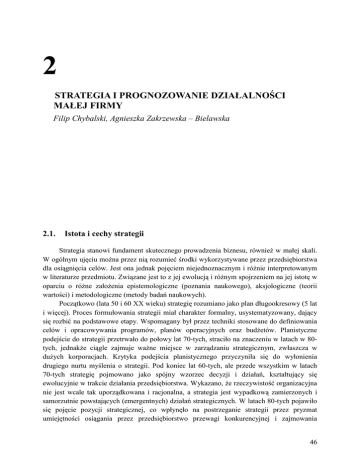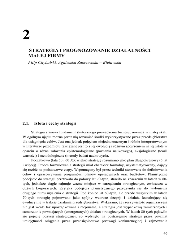 2 STRATEGIA I PROGNOZOWANIE DZIAŁALNOŚCI MAŁEJ FIRMY Filip Chybalski, Agnieszka Zakrzewska – Bielawska 2.1. Istota i cechy strategii Strategia stanowi fundament skutecznego prowadzenia biznesu, również w małej skali. W ogólnym ujęciu można przez nią rozumieć środki wykorzystywane przez przedsiębiorstwa dla osiągnięcia celów. Jest ona jednak pojęciem niejednoznacznym i różnie interpretowanym w literaturze przedmiotu. Związane jest to z jej ewolucją i różnym spojrzeniem na jej istotę w oparciu o różne założenia epistemologiczne (poznania naukowego), aksjologiczne (teorii wartości) i metodologiczne (metody badań naukowych). Początkowo (lata 50 i 60 XX wieku) strategię rozumiano jako plan długookresowy (5 lat i więcej). Proces formułowania strategii miał charakter formalny, usystematyzowany, dający się rozbić na podstawowe etapy. Wspomagany był przez techniki stosowane do definiowania celów i opracowywania programów, planów operacyjnych oraz budżetów. Planistyczne podejście do strategii przetrwało do połowy lat 70-tych, straciło na znaczeniu w latach w 80tych, jednakże ciągle zajmuje ważne miejsce w zarządzaniu strategicznym, zwłaszcza w dużych korporacjach. Krytyka podejścia planistycznego przyczyniła się do wyłonienia drugiego nurtu myślenia o strategii. Pod koniec lat 60-tych, ale przede wszystkim w latach 70-tych strategię pojmowano jako spójny wzorzec decyzji i działań, kształtujący się ewolucyjnie w trakcie działania przedsiębiorstwa. Wykazano, że rzeczywistość organizacyjna nie jest wcale tak uporządkowana i racjonalna, a strategia jest wypadkową zamierzonych i samorzutnie powstających (emergentnych) działań strategicznych. W latach 80-tych pojawiło się pojęcie pozycji strategicznej, co wpłynęło na postrzeganie strategii przez pryzmat umiejętności osiągania przez przedsiębiorstwo przewagi konkurencyjnej i zajmowania 46 odpowiednich pozycji konkurencyjnych na rynku. Istotą strategii stała się zatem walka z konkurencją. W latach 90-tych w centrum uwagi znalazły się dwie podstawowe koncepcje: rdzenia umiejętności i konkurowania na podstawie zdolności. Organizacje zaczęto postrzegać przede wszystkim jako zbiór aktywów (zasobów) i umiejętności, a ich konfiguracja w kluczowe kompetencje oraz sposób ich najlepszego wykorzystania stały się istotą strategii. Kluczowe znaczenie zaczęto przypisywać maksymalizacji wartości dla akcjonariuszy poprzez tworzenie modeli działalności firmy skupiających swoją uwagę na kliencie oraz wykorzystujących posiadane przez przedsiębiorstwo zasoby i umiejętności. Koncentracja na strategicznych zasobach oraz ich niedobór w innych obszarach skłoniły przedsiębiorstwa do strategicznej współpracy poprzez zawiązywanie różnorodnych aliansów. Natomiast nacisk na efektywność skłonił przedsiębiorstwa do poszukiwania przewagi konkurencyjnej poprzez podejmowanie działań restrukturyzacyjnych i inżynierię procesów. Rys. 2.1. Dominujące motywy w ewolucji strategii Budżetowanie finansowe • budżetowanie kapitałowe oparte na zdyskontowanych przepływach pieniężnych • kontrola finansowa 1950 Strategiadla dlanowej nowej Strategia ekonomii ekonomii innowacje • •innowacje strategiczne strategiczne nowemodele modele • •nowe biznesowe biznesowe przełomowe • •przełomowe technologie technologie 2000 Strategia w nowym tysiącleciu • • etyka i społeczna odpowiedzialność biznesu • rywalizacja o standardy • strategie globalne 2010 Planowanie Planowanierozwoju rozwoju •• prognozy prognozy ekonomiczne ekonomiczne •• formalne formalne planowanie planowanierozwoju rozwoju •• tworzenie tworzeniedziałów działów planowania planowaniarozwoju rozwoju 1960 Strategia Strategiajako jakowzorzec wzorzec •• wypadkowa wypadkowa zamierzonych zamierzonychi i samorzutnie samorzutnie powstających powstającychdziałań działań strategicznych strategicznych •• spójny spójnyi ipowielany powielanyww czasie czasiewzorzec wzorzec 1970 Poszukiwanie Poszukiwanieprzewagi przewagi konkurencyjnej konkurencyjnej • analiza analizazasobów zasobówiiumiejętności • umiejętności maksymalizacja wartości dla • maksymalizacja akcjonariuszy wartości dla akcjonariuszy • restrukturyzacja i reinżynierię •• restrukturyzacja i reinżynieria alianse • alianse 1990 Strategia Strategiajako jako pozycjonowanie pozycjonowanie •• analiza analizasektora sektora •• walka walkazzkonkurencją konkurencją •• budowanie budowanieprzewagi przewagi konkurencyjnej konkurencyjnejna narynku rynku (minimalizacja kosztów, (minimalizacja kosztów, zróżnicowanie) zróżnicowanie) 1980 Dalsza ewolucja strategii nowe koncepcje i idee kolejne lata XXI wieku Źródło: Opracowanie własne na podstawie A. Sigismund Huff, S.W. Floyd, H.D. Herman, S. Terjesen, Zarządzanie strategiczne. Podejście zasobowe, Oficyna a Wolters Kluwer business, Warszawa 2011, s. 32. 47 Początek XXI wieku wymusił nowe spojrzenie na strategię. Szybkie tempo zmian zachodzących w otoczeniu, globalizacja, postęp techniczno – technologiczny, przyspieszony rozwój wiedzy spowodowały, że strategia zindywidualizowanego przedsiębiorstwa w nowym modelu ekonomii to działania mające na celu innowację wartości. Ponadto strategia powinna uwzględniać także etykę i społeczną odpowiedzialność biznesu.1 Dominujące motywy w poszczególnych etapach ewolucji koncepcji strategii przedstawiono syntetycznie na rys. 2.1, a przegląd różnych definicji strategii w ujęciu wybranych autorów prezentuje tabela 2.1. Tabela 2.1. Definicje strategii w ujęciu wybranych autorów. Autor Definicja 1 2 M. Romanowska2 Strategia to dynamiczny proces pokonywania trudności, jakie przedsiębiorstwo napotyka na drodze swojego rozwoju, a jej celem jest utrzymanie potencjału rozwojowego i konkurencyjnego przedsiębiorstwa w długiej perspektywie czasowej. E. Urba