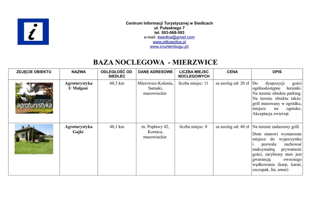 Centrum Informacji Turystycznej w Siedlcach ul. Pułaskiego 7 tel. 503-068-593 e-mail: [email protected] www.pttksiedlce.pl www.znurtembugu.pl\ BAZA NOCLEGOWA - MIERZWICE ZDJĘCIE OBIEKTU NAZWA ODLEGŁOŚĆ OD SIEDLEC DANE ADRESOWE LICZBA MIEJSC NOCLEGOWYCH CENA OPIS Agroturystyka U Małgosi 60,3 km Mierzwice-Kolonia, Sarnaki, mazowieckie liczba miejsc: 11 za nocleg od: 20 zł Do dyspozycji gości ogólnodostępne łazienki. Na terenie obiektu parking. Na terenie obiektu także: grill murowany w ogródku, miejsce na ognisko. Akceptacja zwierząt. Agroturystyka Gajki 48,1 km m. Popławy 42, Kornica, mazowieckie liczba miejsc: 8 za nocleg od: 40 zł Na terenie zadaszony grill. Dom stanowi wymarzone miejsce do wypoczynku i pozwala zachować maksymalną prywatność gości, zarybiony staw jest gwarancją owocnego wędkowania (karp, karaś, szczupak, lin, amur) Agroturystyka Nad Bugiem 48,1 km Zabuże 41, Mielnik, mazowieckie liczba miejsc: 20 za nocleg od: 35 zł -I miejsce w konkursie "Bezpieczeństwo żywności i żywienia w gospodarstwie agroturystycznym 2011", - III miejsce w konkursie "Najpiękniejsze gospodarstwo agroturystyczne 2008", - Wyróżnienie w konkursie "Specjalność kulinarna gospodarstwa agroturystycznego 2011" ( wyrób własny masła czosnkowego i sera białego), Gościniec Wygoda Pałac w Korczewie 130 km Wygoda 2, Janów Podlaski, lubelskie liczba miejsc: 51 za nocleg od: 47 zł Do dyspozycji gości salon z TV DVD. Na terenie obiektu także miejsce na ognisko. Na terenie obiektu: wypożyczalnia rowerów, parking. Akceptacja zwierząt. Sklepik z pamiątkami. 32,6 km ul. ks. Brzuski 3a, Korczew , mazowieckie liczba miejsc: 4 za nocleg od: 125 zł XVIII-wieczny zespół pałacowo-parkowy w Korczewie jest jednym z nielicznych obiektów prywatnych udostępnianych do zwiedzania. Zapraszamy turystów 7 dni w tygodniu w godz. 8.00-18.00 (kwiecień wrzesień) 8.00-16.00 (październik - marzec). Dwór w Zabużu 63,2 km Zabuże 40, Hołowczyce, mazowieckie liczba miejsc: 50 za nocleg od: 92 zł DOMEK OGRODNIKA Domek 6-osobowy. Na parterze: salon z kominkiem, aneks kuchenny, łazienka. Na piętrze: 3 sypialnie. W domku: dostęp do internetu, TV. Taras z widokiem na Bug. 10 m od brzegu rzeki. Agroturystyka w Zabużu 48,1 km Zabuże 42, Hołowczyce, mazowieckie liczba miejsc: 14 za nocleg od: 35 zł Na terenie obiektu także: możliwość grillowania, miejsce na ognisko. Agroturystyka Odpocznij w Zabużu 48,1 km Zabuże 36, Hołowczyce, mazowieckie liczba miejsc: 8 za nocleg od: 30 zł Na terenie obiektu miejsce na ognisko lub grilla (grill, stolik i krzesełka dostępne na miejscu). Ośrodek Wypoczynkowy Pod Sosną 60,3 km Wólka Nadbużna, Siemiatycze, podlaskie liczba miejsc: 120 za nocleg od: 35 zł Gwarantujemy Państwu unikalny mikroklimat Podlaskiego Przełomu Bugu, a także prawdziwy relaks w nieskażonym środowisku "Zielonych Płuc Polski" Przystań nad Bugiem 59,9 km al. Jaćwieży 17, Drohiczyn, podlaskie liczba miejsc: 16 za nocleg od: 25 zł NASZE GOSPODARSTWO znajduje się w małej urokliwej nadbużańskiej wsi. Jest to teren Parku Krajobrazowego "Podlaski Przełom Bugu" w obszarze chronionym "NATURA 2000". Dom Gościnny k. Janowa Podlaskiego Hryciukowie 64,9 km m. Bubel-Granna 22a, Janów Podlaski, lubelskie liczba miejsc: 10 za nocleg od: 40 zł W pokojach: TV, radio. Cena noclegu 40-60 PLN od osoby. Dodatkowe informacje: ceny zależne od długości pobytu. Noclegi Pokoje Gościnne 54,3 km m. Rzewuszki 11, Sarnaki, mazowieckie liczba miejsc: 20 za nocleg od: 30 zł Dom/Domek o powierzchni 64 m2. Na domek składa się: pokój dzienny, wpełni wyposażona kuchnia, łazienka, 2 sypialnie. W domku kominek. Dom jest wyłącznie do dyspozycji Gości. Można go wynająć w całości. Agroturystyka Nad Sarenką 48,1 km m. Franopol 2, Sarnaki, mazowieckie liczba miejsc: 10 za nocleg od: 35 zł Samodzielny domek (część gospodarstwa agroturystycznego) przeznaczony wyłącznie dla gości.Dom/Domek 10osobowy. Na domek składa się: w pełni wyposażona kuchnia, 2 łazienki, 4 sypialnie. Leśniczówka U Agnieszki 62,8 km Zabuże 27a, Hołowczyce, mazowieckie liczba miejsc: 8 za nocleg od: 35 zł Oferujemy do wynajęcia wygodny dom na dużej, ogrodzonej działce. Do dyspozycji gości: salon z kominkiem i TV, kuchnia z pełnym wyposażeniem, jadalnia, 2 łazienki, taras. Na terenie obiektu: parking, zadaszone miejsce na ognisko, możliwość grillowania. Dworek Łukowiska 65,0 km m. BubelŁukowiska 29, Janów Podlaski, lubelskie liczba miejsc: 45 za nocleg od: 80 zł Do dyspozycji gości sala kominkowa. Do dyspozycji gości również salon myśliwski. Zajazd U Kmicica 61,1 km ul. 11 Listopada 192, Siemiatycze, podlaskie liczba miejsc: 29 za nocleg od: 40 zł Do dyspozycji gości 2 zamykane parkingi. W pokojach: radio, TV. 2 pokoje z własną łazienką, pozostałe pokoje w formie segmentów studio (2 + 3 + łazienka). Agroturystyka Dom Na Skarpie 60,2 km ul. Piłsudskiego 37, Drohiczyn, podlaskie liczba miejsc: 26 za nocleg od: 25 zł Obiekt czynny sezonowo. Przyjmujemy Gości w okresie wiosennym i letnim. Ekoturystyka w Raju 52,2 km ul. Spokojna 4, Sarnaki, mazowieckie liczba miejsc: 20 za nocleg od: 15 zł Obsługa w języku: angielskim, rosyjskim. Do dyspozycji gości dostęp do internetu. Na terenie obiektu parking. Na terenie obiektu także: miejsce na ognisko, możliwość grillowania. Akceptacja zwierząt. Gościniec Stary Rynek 64,9 km pl. Jana Pawła II 41, Siemiatycze, podlaskie liczba miejsc: 14 za nocleg od: 50 zł Obsługa w języku: rosyjskim. Do dyspozycji gości dostęp do internetu. Na terenie obiektu parking oświetlony i monitorowany. Agroturystyka Chata za Wsią 47,5 km Chłopków 16, Platerów, mazowieckie liczba miejsc: 10 za nocleg od: 30 zł Obsługa angielskim, rosyjskim. wjęzyku: hiszpańskim, W domu może wypoczywać rodzina lub grupa przyjaciół (do 10 osób), które chciałyby spędzić urlop w ciszy i w bliskim z przyrodą. kontakcie Na terenie obi