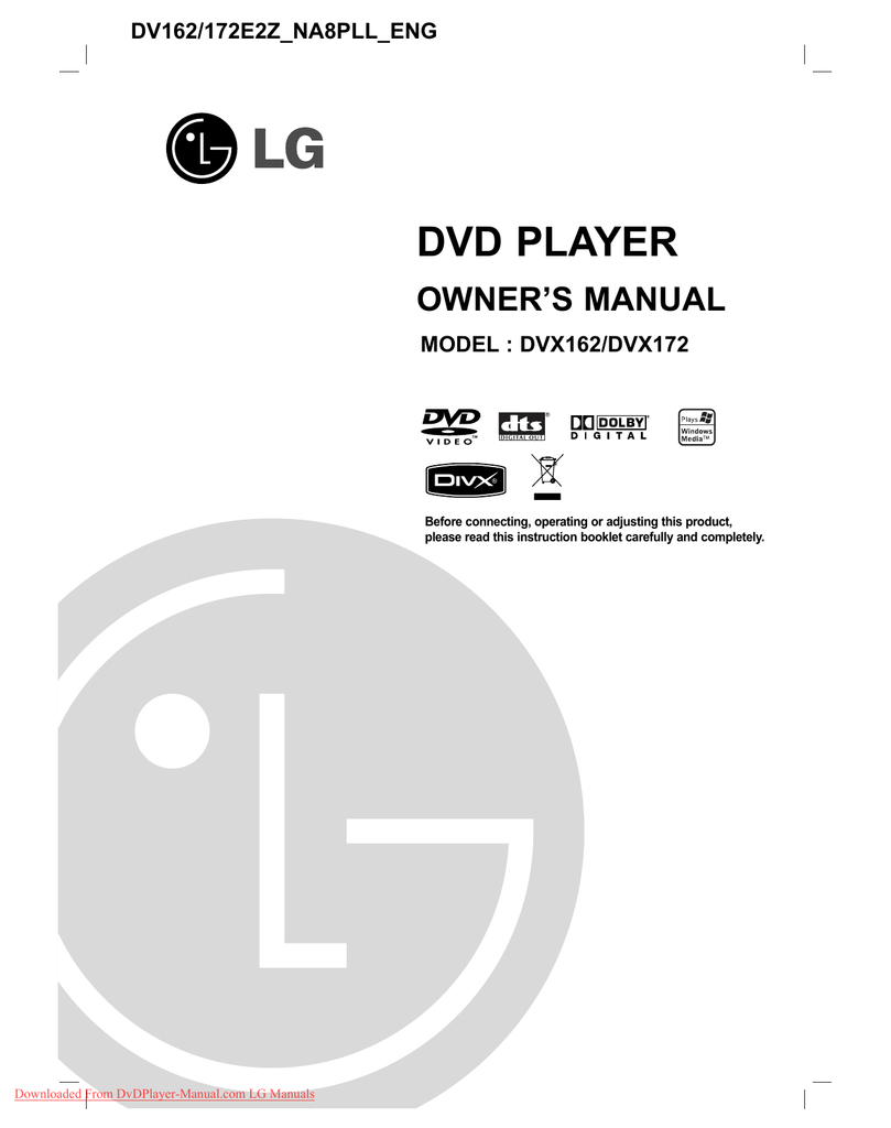 DV162/172E2Z_NA8PLL_ENG DVD PLAYER OWNER’S MANUAL MODEL : DVX162/DVX172 Before connecting, operating or adjusting this product, please read this instruction booklet carefully and completely. Downloaded From DvDPlayer-Manual.com LG Manuals CAUTION RISK OF ELECTRIC SHOCK DO NOT OPEN CAUTION: The apparatus should not be exposed to water (dripping or splashing) and no objects filled with liquids, such as vases, should be placed on the apparatus. CAUTION concerning the Power Cord CAUTION: TO REDUCE THE RISK OF ELECTRIC SHOCK DO NOT REMOVE COVER (OR BACK) NO USER-SERVICEABLE PARTS INSIDE REFER SERVICING TO QUALIFIED SERVICE PERSONNEL. This lightning flash with arrowhead symbol within an equilateral triangle is intended to alert the user to the presence of uninsulated dangerous voltage within the product’s enclosure that may be of sufficient magnitude to constitute a risk of electric shock to persons. The exclamation point within an equilateral triangle is intended to alert the user to the presence of important operating and maintenance (servicing) instructions in the literature accompanying the product. WARNING: TO PREVENT FIRE OR ELECTRIC SHOCK HAZARD, DO NOT EXPOSE THIS PRODUCT TO RAIN OR MOISTURE. CAUTION: Do not block any ventilation openings. Install in accordance with the manufacturer's instructions. Slots and openings in the cabinet are provided for ventilation and to ensure reliable operation of the product and to protect it from over heating. The openings should be never be blocked by placing the product on a bed, sofa, rug or other similar surface. This product should not be placed in a built-in installation such as a bookcase or rack unless proper ventilation is provided or the manufacturer's instruction have been adhered to. CAUTION: VISIBLE AND INVISIBLE LASER RADIATION WHEN OPEN AND INTERLOCKS DEFEATED. CAUTION: This product employs a Laser System. To ensure proper use of this product, please read this owner’s manual carefully and retain it for future reference. Should the unit require maintenance, contact an authorized service center. Use of controls, adjustments or the performance of procedures other than those specified herein may result in hazardous radiation exposure. To prevent direct exposure to laser beam, do not try to open the enclosure. Visible laser radiation when open. DO NOT STARE INTO BEAM. 2 Downloaded From DvDPlayer-Manual.com LG Manuals Most appliances recommend they be placed upon a dedicated circuit; That is, a single outlet circuit which powers only that appliance and has no additional outlets or branch circuits. Check the specification page of this owner's manual to be certain. Do not overload wall outlets. Overloaded wall outlets, loose or damaged wall outlets, extension cords, frayed power cords, or damaged or cracked wire insulation are dangerous. Any of these conditions could result in electric shock or fire. Periodically examine the cord of your appliance, and if its appearance indicates damage or deterioration, unplug it, discontinue use of the appliance, and have the cord replaced with an exact replacement part by an authorized servicer. Protect the power cord from physical or mechanical abuse, such as being twisted, kinked, pinched, closed in a door, or walked upon. Pay particular attention to plugs, wall outlets, and the point where the cord exits the appliance. To disconnect power from the mains, pull out the mains cord plug. When installing the product, ensure that the plug is easily accessible. Disposal of your old appliance 1. When this crossed-out wheeled bin symbol is attached to a product it means the product is covered by the European Directive 2002/96/EC. 2. All electrical and electronic products should be disposed of separately from the municipal waste stream via designated collection facilities appointed by the government or the local authorities. 3. The correct disposal of your old appliance will help prevent potential negative consequences for the environment and human health. 4. For more detailed information about disposal of your old appliance, please contact your city office, waste disposal service or the shop where you purchased the product. This product is manufactured to comply with the radio interference requirements of EEC DIRECTIVE 89/336/EEC, 93/68/EEC and 73/23/EEC. Contents . . . . . . . . . . . . . . . . . . . . . . . . . . . . . . . . . . . . . . . . . . . . . . . . .4 .4 .4 .4 .4 .4 .5 .5 .6 .7 .7 .7 Installation and Setup . . . . . . . . .8-13 Setting up the Player . . . . . . . . . . . . . . . . . . . .8 DVD Player Connections . . . . . . . . . . . . . . . . .8 Video and Audio Connections to Your TV . . .8 Audio Connection to Optional Equipment . . .9 Displaying Disc Information on-screen . . . .10 Initial Settings . . . . . . . . . . . . . . . . . . . . . . . .10 General Operation . . . . . . . . . . . . . . . . . . .10 LANGUAGE . . . . . . . . . . . . . . . . . . . . . . . .11 • Menu Language . . . . . . . . . . . . . . . . . . .11 • Disc Audio / Subtitle / Menu . . . . . . . . . . .11 DISPLAY . . . . . . . . . . . . . . . . . . . . . . . . . .11 • TV Aspect . . . . . . . . . . . . . . . . . . . . . . . .11 • Display Mode . . . . . . . . . . . . . . . . . . . . .11 • Progressive Scan . . . . . . . . . . . . . . . . . .11 • TV Output Select . . . . . . . . . . . . . . . . . . .11 AUDIO . . . . . . . . . . . . . . . . . . . . . . . . . . . .12 • Dolby Digital / DTS / MPEG . . . . . . . . . .12 • Sample Freq. (Frequency) . . . . . . . . . . . .12 • Dynamic Range Control (DRC) . . . . . . . .12 • Vocal . . . . . . . . . . . . . . . . . . . . . . . . . . .12 LOCK (Parental Control) . . . . . . . . . . . . . .12 • Rating . . . . . . . . . . . . . . . . . . . . . . . . . . .12 • Password . . . . . . . . . . . . . . . . . . . . . . . .12 • Area Code . . . . . . . . . . . . . . . . . . . . . . .13 OTHERS . . . . . . . . . . . . . . . . . . . . . . . . . .13 • PBC . . . . . . . . . . . . . . . 