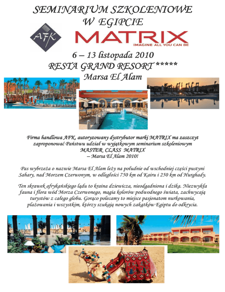 SEMINARIUM SZKOLENIOWE W EGIPCIE 6 – 13 listopada 2010 RESTA GRAND RESORT ***** Marsa El Alam Nowoc Firma handlowa AFK, AFK, autoryzowany dystrybutor marki MATRIX ma zaszczyt zaproponować Państwu udział w wyjątkowym seminarium szkoleniowym MASTER MASTER CLASS MATRIX – Marsa El Alam 2010! Pas wybrzeża o nazwie Marsa El Alam leży na południe od wschodniej części pustyni Sahary, nad Morzem Czerwonym, w odległości 750 km od Kairu i 250 km od Hurghady. Ten skrawek afrykańskiego lądu to kraina dziewicza, nieodgadniona i dzika. Niezwykła fauna i flora wód Morza Czerwonego, magia kolorów podwodnego świata, zachwycają turystów z całego globu. Gorąco polecamy to miejsce pasjonatom nurkowania, plażowania i wszystkim, którzy szukają nowych zakątków Egiptu do odkrycia. Hotel RESTA GRAND RESORT *****, w którym Państwo zamieszkają, to otwarty w kwietniu 2009 roku kompleks z piaszczystą plażą hotelową. W niedalekiej odległości od brzegu znajduje się przepiękna rafa koralowa. Hotel posiada aż trzy bas baseny, eny, przy których mogą Państwo korzystać z bezpłatnych leżaków i parasoli. Ponadto w obiekcie można grać w tenisa stołowego, siatkówkę plażową, rzutki, bule, korzystać z siłowni, a za dodatkową opłatą również z centrum wellness (łaźnia parowa, sauna, pokoje do masażu,…), a także kortów tenisowych i bilarda. Pokoje są duże, dwuosobowe. dwuosobowe. Posiadają indywidualnie sterowaną klimatyzację, telefon, telewizję satelitarną wraz z polskim kanałem, sejf, zestaw do kawy/herbaty oraz wyposażoną łazienkę. W cenie wyjazdu : -przelot na trasie Katowice – Marsa El Alam – Katowice - obowiązkowa opłata lotniskowa (300 zł) - obowiązkowa opłata paliwowa (100 zł) - zakwaterowanie : 7 noclegów w 5* Hotelu Resta Grand Resort, pokoje 2 osobowe, typu standard - wyżywienie : all inclusive/ zgodne z ofertą i opisem hotelu - transfery lotnisko – hotel – lotnisko, klimatyzowanym autokarem - opieka polskiego pilota (z grupą) i polskiego rezydenta (w hotelu) - ubezpieczenie KL i NW 15.000 euro / os Ceny nie zawierają: - obowiązkowej wizy płatnej na lotnisku Marsa El Alam (około 15 USD) - wycieczek lokalnych - dodatkowych atrakcji na miejscu - wydatków własnych SERDECZNIE ZAPRASZAMY !!! Szczegółowe informacje u przedstawicieli handlowych marki MATRIX.