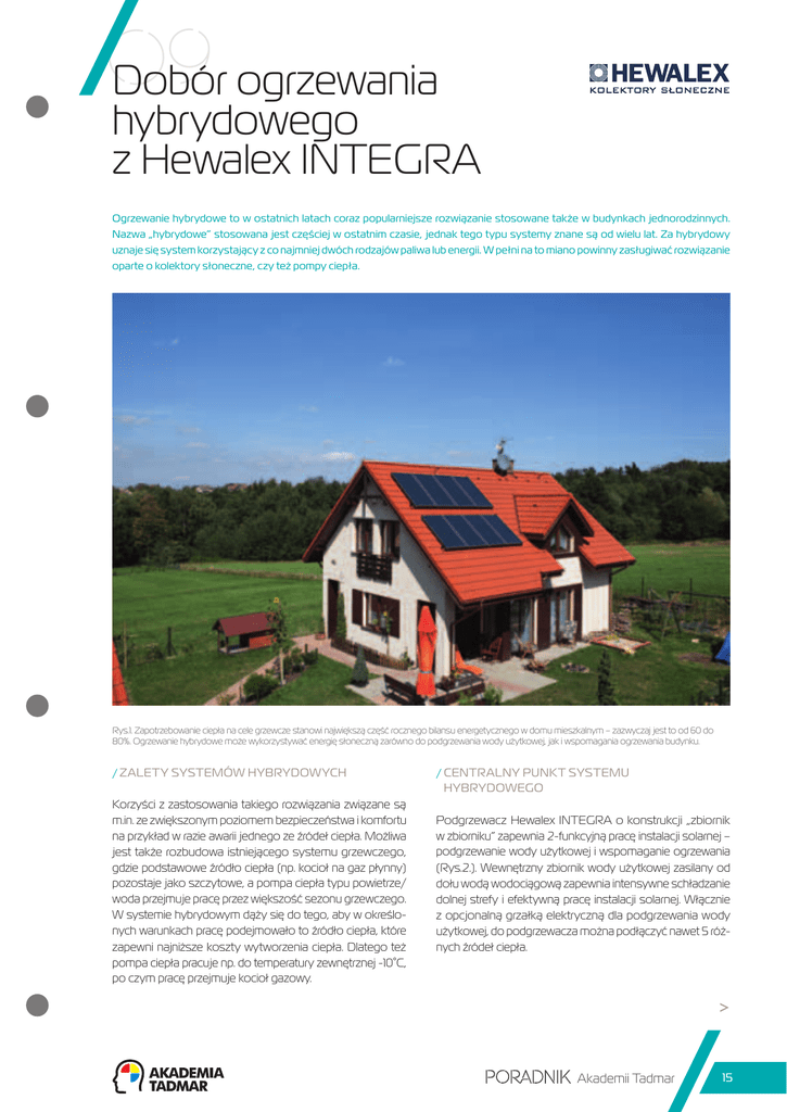 09 Dobór ogrzewania hybrydowego z Hewalex INTEGRA Ogrzewanie hybrydowe to w ostatnich latach coraz popularniejsze rozwiązanie stosowane także w budynkach jednorodzinnych. Nazwa „hybrydowe” stosowana jest częściej w ostatnim czasie, jednak tego typu systemy znane są od wielu lat. Za hybrydowy uznaje się system korzystający z co najmniej dwóch rodzajów paliwa lub energii. W pełni na to miano powinny zasługiwać rozwiązanie oparte o kolektory słoneczne, czy też pompy ciepła. Rys.1. Zapotrzebowanie ciepła na cele grzewcze stanowi największą część rocznego bilansu energetycznego w domu mieszkalnym – zazwyczaj jest to od 60 do 80%. Ogrzewanie hybrydowe może wykorzystywać energię słoneczną zarówno do podgrzewania wody użytkowej, jak i wspomagania ogrzewania budynku. //Zalety systemów hybrydowych //Centralny punkt systemu hybrydowego Korzyści z zastosowania takiego rozwiązania związane są m.in. ze zwiększonym poziomem bezpieczeństwa i komfortu na przykład w razie awarii jednego ze źródeł ciepła. Możliwa jest także rozbudowa istniejącego systemu grzewczego, gdzie podstawowe źródło ciepła (np. kocioł na gaz płynny) pozostaje jako szczytowe, a pompa ciepła typu powietrze/ woda przejmuje pracę przez większość sezonu grzewczego. W systemie hybrydowym dąży się do tego, aby w określonych warunkach pracę podejmowało to źródło ciepła, które zapewni najniższe koszty wytworzenia ciepła. Dlatego też pompa ciepła pracuje np. do temperatury zewnętrznej -10˚C, po czym pracę przejmuje kocioł gazowy. Podgrzewacz Hewalex INTEGRA o konstrukcji „zbiornik w zbiorniku” zapewnia 2-funkcyjną pracę instalacji solarnej – podgrzewanie wody użytkowej i wspomaganie ogrzewania (Rys.2.). Wewnętrzny zbiornik wody użytkowej zasilany od dołu wodą wodociągową zapewnia intensywne schładzanie dolnej strefy i efektywną pracę instalacji solarnej. Włącznie z opcjonalną grzałką elektryczną dla podgrzewania wody użytkowej, do podgrzewacza można podłączyć nawet 5 różnych źródeł ciepła. > Akademii Tadmar 15 1 CWU P/CWU SOL t CO/G CO/P ZT KG PDG/U M 4 EKONTROL 230V/~50Hz 3 ZB KS NW/S P/SOL 2 P/PDG ZPS NW/W ZB WZ Rys.2. Przykładowy schemat hybrydowego systemu grzewczego z podgrzewaczem uniwersalnym INTEGRA i 3 źródłami ciepła: kotłem gazowym (KG), kotłem stałopalnym (KS) oraz instalacją solarną (SOL). //Dobór układu hybrydowego. Dobór mocy grzewczej głównego źródła ciepła uzależniony jest od standardu energetycznego i wielkości budynku decydującego o maksymalnym zapotrzebowaniu ciepła (kW). Z kolei instalację solarną wspomagającą pracę układu hybrydowego, należy dobrać tak, aby uzyskać jak najwyższe pokrycie potrzeb ciepła, a jednocześnie zabezpieczyć się przed negatywnymi skutkami zmniejszonego odbioru ciepła poza sezonem grzewczym. Obecny stan techniki pozwala budować tzw. „solarne” domy jednorodzinne, gdzie pokrycie potrzeb energetycznych sięga nawet 80 do 100%. Częściej jednak praktyczne zastosowanie znajdują instalacje solarne pokrywające od 15 do 35% rocznych potrzeb ciepła. Dobór instalacji 2-funkcyjnej (CWU + CO) powinien być prowadzony za pomocą komputerowych programów symulacyjnych, ze względu na dużą ilość danych obliczeniowych koniecznych do uwzględnienia. Dla pewnych standardowych założeń wstępnych, możliwy jest dobór wielkości 2-funkcyjnej instalacji solarnej za pomocą nomogramu (Rys.3.). Rys.3. Nomogram doboru powierzchni apertury (czynnej) kolektorów płaskich Hewalex dla 2-systemowej instalacji solarnej. Warunki graniczne dla doboru: zużycie wody użytkowej CWU < 200 l/dzień, temperatura 45°C, nasłonecznienie standardowe dla Polski 1030 kWh/m² rok, III strefa klimatyczna, system ogrzewania podłogowego 35/27°C, warunki zabudowy kolektora słonecznego: kierunek południe (±45°), nachylenie 30÷45°. Zielony obszar określa zakres standardowych zestawów solarnych oferowanych przez firmę Hewalex. 16 Akademii Tadmar Przykładowo dla domu energooszczędnego o powierzchni 160 m2 (Rys.1.), zastosowano zestaw solarny 8 SLP-INTEGRA800 złożony z 8 kolektorów KS2000 SLP i podgrzewacza INTEGRA 800/200. Efektem jest pokrycie potrzeb ciepła na poziomie około 21% rocznie. (Rys. 4.). Rys.4. Bilans rocznych potrzeb cieplnych domu 1-rodzinnego (Rys.1.) o maksymalnym zapotrzebowaniu ciepła 9,6 kW, zużyciu wody użytkowej 150 litrów/dzień. Nadwyżka ciepła poza sezonem grzewczym jest wykorzystywana do podgrzewania wody w basenie sezonowym. Opłacalność inwestycji. Wspomaganie ogrzewania budynku poprzez pracę instalacji solarnej, w takich krajach jak np. Niemcy, Austria czy Szwecja, stosowane jest w nowych domach częściej niż standardowe układy pracujące na podgrzewanie ciepłej wody użytkowej. Instalacje solarne do wspomagania ogrzewania są mniej efektywne od innych (uzysk ciepła kWh/m² rok), ale niższy jest dla nich jednostkowy koszt inwestycji (zł/m2). Dlatego opłacalność inwestycji jest porównywalna ze standardowymi instalacjami solarnymi podgrzewającymi wodę użytkową. W zależności od rodzaju podstawowego paliwa i zakresu prac budowlanych oraz montażowych, okres zwrotu kosztów może wynosić od około 6 do 12 lat.