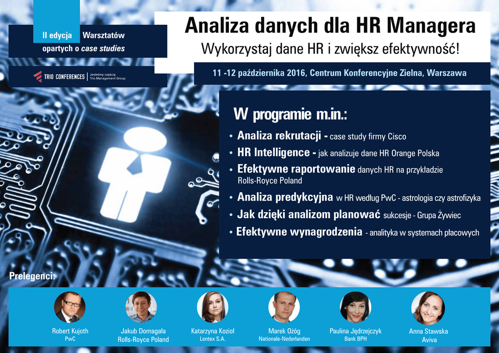 II edycja Warsztatów opartych o case studies Analiza danych dla HR Managera Wykorzystaj dane HR i zwiększ efektywność! 11 -12 października 2016, Centrum Konferencyjne Zielna, Warszawa W programie m.in.: • • • Analiza rekrutacji - case study firmy Cisco HR Intelligence - jak analizuje dane HR Orange Polska Efektywne raportowanie danych HR na przykładzie Rolls-Royce Poland Analiza predykcyjna w HR według PwC - astrologia czy astrofizyka • Jak dzięki analizom planować sukcesje - Grupa Żywiec • Efektywne wynagrodzenia - analityka w systemach płacowych • Prelegenci: Robert Kujoth PwC Jakub Domagała Rolls-Royce Poland Katarzyna Kozioł Lentex S.A. Marek Ożóg Nationale-Nederlanden Paulina Jędrzejczyk Bank BPH Anna Stawska Aviva II Analiza danych dla HR Managera Warsztaty oparte o case studies Analizuj i wykorzystuj dane HR zwiększając efektywność Twojej organizacji! 11 -12 października 2016, Centrum Konferencyjne Zielna, Warszawa Z przyjemnością zapraszamy do udziału w drugiej edycji warsztatów poświęconych analizie danych na potrzeby pracy HR Managera. Wykorzystanie potencjału posiadanych informacji, zastosowanie do tego rozwiązań analitycznych to działania niezbędne do określenia ról i umiejętności potrzebnych do trwałego rozwoju nowoczesnej organizacji. „Analiza danych dla HR Managera” to: · Warsztaty z obszaru analityki HR, ukazujące korzyści dla całej organizacji · Okazja do poznania najlepszych praktyk w obszarze analiz HR · Niepowtarzalna okazja, by dowiedzieć się jak i jakie dane są analizowane przez działy HR w takich organizacjach jak m.in.: BPH, AVIVA, Lentex,PwC, Nationale-Nederlanden, Trio Advisory, Great Digital, Rolls-Royce Poland Grupa Żywiec, Orange Polska, Cisco, Antal i wiele innych ... Obecność obowiązkowa! Bez względu na to, czy stawiasz pierwsze kroki czy prowadzisz zaawansowane analizy danych HR w Twojej firmie. Pierwsza edycja zgromadziła grono wiodących ekspertów HR i analityków kapitału ludzkiego, zapewniając doskonałą Zmiany i dynamika rynku wymagają Twojej obecności na tym wydarzeniu, gdzie w jednym miejscu spotkają się przedstawiciele firm wielu branż liczących się na rynku krajowym i międzynarodowym. platformę do dzielenia się doświadczeniami i innowacjami. To niepowtarzalna okazja do nawiązania wartościowych kontaktów biznesowych! W kolejnej edycji stawiamy zatem, na zaprezentowanie nowych Do udziału gorąco zachęcamy osoby związane z tematem analiz w HR! pomysłów i case studies, chcąc zainspirować do zastosowania zdobytej podczas warsztatów wiedzy w codziennej praktyce. Marcin Ślepowroński Project Manager M. +48 505 133 469 [email protected] www.trioconferences.pl 11 października 2016, wtorek 9.30 Poranna kawa i rejestracja użytkowników 9.50 Powitanie uczestników i rozpoczęcie 1 dnia warsztatów 10.00 10.40 12.20 Efektywne raportowanie: Wizualizacja wyników analiz które mają różnorodną publiczność • Analizy HR czytelne i atrakcyjne dla innych działów • Dopasowanie danych analitycznych HR do potrzeb działów i poziomów organizacyjnych • Jak uwypuklić dane które są najbardziej wartościowe • Sposób prezentacji danych Jakub Domagała, HR Analytics Team Leader, Rolls-Royce Poland HR Intelligence – niezbędne narzędzia i procesy • Jak gromadzić i z jakich obszarów dane analityczne HR • Instrumenty i narzędzia do prowadzenia analiz HR wraz z obszarami zastosowania • Skillset – jakie zestaw cech powinien mieć analityk HR • Insight HR - przetłumacz dane na konkretne działania i rozwiązania Wojciech Kłoda, Kierownik Wydziału Efektywności Zasobów Ludzkich, Orange 13.00 Lunch Analiza wynagrodzeń i benefitów – co oferuje działom HR i biznesowi 14.00 • Jak badać efektywność wynagrodzeń; gdzie szukać benchmarków • Jak analizować ankiety dotyczące wynagrodzeń, by zapewnić konkurencyjność pakietów • Jak zapewnić zewnętrzną i wewnętrzną spójność wynagrodzeń • Analityczne wartościowanie stanowisk • Jak wykorzystać analitykę w procesie podwyżkowym Marek Ożóg, Analityk HR, Nationale-Nederlanden Jak stawiać pierwsze kroki w analityce HR i się przy tym nie potknąć • Od kontrollingu HR do HR Analytics – jak zaprojektować kulturę analityczną efektywności kapitału ludzkiego • Jakie problemy i pułapki może napotkać HR podczas podróży analitycznej • Jakie korzyści analityka HR może zaoferować biznesowi Anna Stawska, Reward and MI Partner, Aviva 11.20 Przerwa na kawę 11.40 Analiza predykcyjna w HR - astrologia czy astrofizyka • Czy próba przewidywania przyszłych zdarzeń ma w HR sens • Czy to zadanie HR, czy HR może sobie z tym sam poradzić • Jak się do tego zabrać - od czego należy zacząć i przede wszystkim CO przewidywać Robert Kujoth, Menedżer, Lider zespołu HR Consulting, PwC 14.40 Jak często i dlaczego pracownicy decydują się na odejście z organizacji • Wskaźnik attrition i wyzwania z nim związane dla działów HR • Poziom attrition w firmach w Polsce – wyniki raportu Antal • Powody odejść pracowników z firm • Jak organizacje przeciwdziałają rosnącym wskaźnikom attrition Agnieszka Wójcik, Market Research Manager, Antal 15.20 Zakończenie I dnia warsztatów www.trioconferences.pl 12 października 2016, środa 9.30 Poranna kawa i rejestracja 10.00 Sukcesja – klucz do stabilnego przywództwa 12:20 Jak analizować poziom fluktuacji pracowników i jak ją obniżyć • Przyczyny fluktuacji kadr • Jak pro-aktywnie planować sukcesję w organizacji w perspektywie: 1,2,3 lat • Jak przeciwdziałać zbyt wysokiej fluktuacji kadr • Jakie znaczenie ma dla biznesu efektywny transfer wiedzy • Jak wykorzystując dane analityczne HR - obliczyć poziom fluktuacji Paulina Jędrzejczyk, Compensation & Benefits Analyst, Bank BPH • Planowanie sukcesji wykorzystując dane z analizy talentów w organizacji Andrzej Borczyk, HR Director, Gr