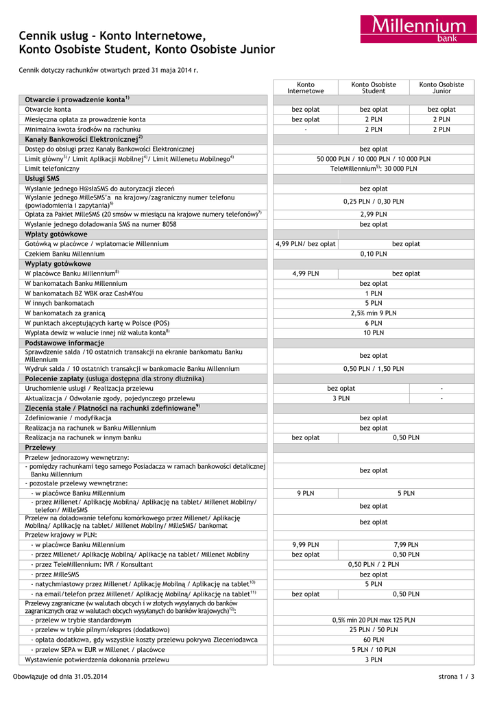 Cennik usług - Konto Internetowe, Konto Osobiste Student, Konto Osobiste Junior Cennik dotyczy rachunków otwartych przed 31 maja 2014 r. 1) Konto Internetowe Konto Osobiste Student Konto Osobiste Junior bez opłat bez opłat - bez opłat 2 PLN 2 PLN bez opłat 2 PLN 2 PLN Otwarcie i prowadzenie konta Otwarcie konta Miesięczna opłata za prowadzenie konta Minimalna kwota środków na rachunku Kanały Bankowości Elektronicznej2) Dostęp do obsługi przez Kanały Bankowości Elektronicznej Limit główny3)/ Limit Aplikacji Mobilnej4)/ Limit Millenetu Mobilnego4) Limit telefoniczny bez opłat 50 000 PLN / 10 000 PLN / 10 000 PLN TeleMillennium5): 30 000 PLN Usługi SMS Wysłanie jednego H@słaSMS do autoryzacji zleceń Wysłanie jednego MilleSMS’a na krajowy/zagraniczny numer telefonu (powiadomienia i zapytania)6) Opłata za Pakiet MilleSMS (20 smsów w miesiącu na krajowe numery telefonów)7) Wysłanie jednego doładowania SMS na numer 8058 bez opłat 0,25 PLN / 0,30 PLN 2,99 PLN bez opłat Wpłaty gotówkowe Gotówką w placówce / wpłatomacie Millennium Czekiem Banku Millennium 4,99 PLN/ bez opłat bez opłat 0,10 PLN Wypłaty gotówkowe W placówce Banku Millennium8) W bankomatach Banku Millennium W bankomatach BZ WBK oraz Cash4You W innych bankomatach W bankomatach za granicą W punktach akceptujących kartę w Polsce (POS) Wypłata dewiz w walucie innej niż waluta konta8) 4,99 PLN bez opłat bez opłat 1 PLN 5 PLN 2,5% min 9 PLN 6 PLN 10 PLN Podstawowe informacje Sprawdzenie salda /10 ostatnich transakcji na ekranie bankomatu Banku Millennium Wydruk salda / 10 ostatnich transakcji w bankomacie Banku Millennium bez opłat 0,50 PLN / 1,50 PLN Polecenie zapłaty (usługa dostępna dla strony dłużnika) Uruchomienie usługi / Realizacja przelewu Aktualizacja / Odwołanie zgody, pojedynczego przelewu bez opłat 3 PLN - Zlecenia stałe / Płatności na rachunki zdefiniowane9) Zdefiniowanie / modyfikacja Realizacja na rachunek w Banku Millennium Realizacja na rachunek w innym banku bez opłat bez opłat bez opłat 0,50 PLN Przelewy Przelew jednorazowy wewnętrzny: - pomiędzy rachunkami tego samego Posiadacza w ramach bankowości detalicznej Banku Millennium - pozostałe przelewy wewnętrzne: - w placówce Banku Millennium - przez Millenet/ Aplikację Mobilną/ Aplikację na tablet/ Millenet Mobilny/ telefon/ MilleSMS Przelew na doładowanie telefonu komórkowego przez Millenet/ Aplikację Mobilną/ Aplikację na tablet/ Millenet Mobilny/ MilleSMS/ bankomat Przelew krajowy w PLN: - w placówce Banku Millennium - przez Millenet/ Aplikację Mobilną/ Aplikację na tablet/ Millenet Mobilny - przez TeleMillennium: IVR / Konsultant - przez MilleSMS - natychmiastowy przez Millenet/ Aplikację Mobilną / Aplikację na tablet10) - na email/telefon przez Millenet/ Aplikację Mobilną/ Aplikację na tablet11) Przelewy zagraniczne (w walutach obcych i w złotych wysyłanych do banków zagranicznych oraz w walutach obcych wysyłanych do banków krajowych)12): - przelew w trybie standardowym - przelew w trybie pilnym/ekspres (dodatkowo) - opłata dodatkowa, gdy wszystkie koszty przelewu pokrywa Zleceniodawca - przelew SEPA w EUR w Millenet / placówce Wystawienie potwierdzenia dokonania przelewu Obowiązuje od dnia 31.05.2014 bez opłat 9 PLN 5 PLN bez opłat bez opłat 9,99 PLN bez opłat bez opłat 7,99 PLN 0,50 PLN 0,50 PLN / 2 PLN bez opłat 5 PLN 0,50 PLN 0,5% min 20 PLN max 125 PLN 25 PLN / 50 PLN 60 PLN 5 PLN / 10 PLN 3 PLN strona 1 / 3 Wyciągi / zestawienia Wyciąg miesięczny w formie elektronicznej Wyciąg miesięczny w formie papierowej Duplikat wyciągu miesięcznego: w placówce / przez telefon / poprzez Millenet Wyciąg dzienny / tygodniowy / dwutygodniowy (wysyłany pocztą) Zestawienie transakcji: w placówce / wysyłane pocztą bez opłat bez opłat 15 PLN / 10 PLN / 10 PLN 3 PLN / 4 PLN / 6 PLN 5 PLN / 8 PLN Czeki w obrocie krajowym Zamówienie 3 blankietów czekowych przez telefon / w placówce (odbiór w placówce) Zwrot czeku zdeponowanego (opłata pobierana od podawcy czeku) Skup czeków Banku Millennium Za czek Banku Millennium (opłata pobierana od wystawcy czeku Banku Millennium w przypadku braku środków na rachunku na realizację czeku) Potwierdzenie czeku Zastrzeżenie czeku krajowego łącznie / bez dokumentu tożsamości Inkaso czeku 4,50 / 7,50 PLN 10 PLN 0,50% 30 PLN 30 PLN 30 / 20 PLN 0,5% (min 10 PLN max 200 PLN) Czeki w obrocie zagranicznym13) Zastrzeżenie utraconych czeków wystawionych / sprzedawanych za granicą Skup czeków rentowych Zwrot czeków nieopłaconych przez banki zagraniczne (za każdy czek) Sprzedaż czeków bankierskich płatnych za granicą (za każdy czek) Inkaso czeku 15 PLN (za każdy czek) 2% (min 20 PLN max 100 PLN) 20 PLN 0,5% (min 20 PLN max 300 PLN) 0,5% (min 50 PLN max 200 PLN) Usługi Wydanie zaświadczenia (za każdy produkt, o ile opłata nie jest określona w szczegółowym cenniku dotyczącym danego produktu) Opłata za opatrzenie umowy zabezpieczenia datą pewną (za stronę) Przyjmowanie i przekazywanie zleceń do Millennium Domu Maklerskiego 14) oraz zleceń w zakresie funduszy inwestycyjnych Wymiana gotówki - wymiana nominałów w PLN na inne nominały w PLN Wpłaty na rachunek w innym banku (pozostałe płatności) Wydanie archiwalnej kopii dokumentu (za jeden dokument) Przyjęcie / zmiana / odwołanie dyspozycji na wypadek śmierci Ubezpieczenie MilleZdrowie15) (opłata miesięczna płatna z ROR) Opłata miesięczna za korzystanie ze skrytki sejfowej (usługa dostępna w wybranych placówkach Banku) 6 PLN 4 PLN bez opłat 2% min 20 PLN 1% min 30 PLN 30 PLN bez opłat 1,99 PLN 30 PLN Pozostałe Opłata za nieodebranie gotówki zamówionej do wypłaty8) Opłaty za czynności monitujące w przypadku zadłużenia przeterminowanego w formie: SMS/ telefonu/ listu/ wezwania do zapłaty (max. łączna kwota opłat z tytułu czynności monitujących podjętych w okresach każdych kolejnych 30 dni zadłużenia przeterminowanego t