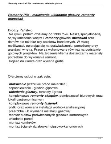 Remonty mieszkań Piła - malowanie, układanie glazury Remonty Piła - malowanie, układanie glazury, remonty mieszkań Drodzy Państwo Na rynku pilskim działamy od 1998 roku. Naszą specjalnością są wykończenia wnętrz i remonty głównie mieszkań oraz domów ale też biur czy obiektów handlowych. W miarę możliwości, opierając się na doświadczeniu, pomożemy przy aranżacji wnętrz. Prace są wykonywane również na podstawie gotowych projektów. Na życzenie klienta dostarczamy materiały potrzebne do wykonania remontu. Dojazd do klienta oraz wycena gratis. Oferujemy usługi w zakresie: malowanie (wszelkie prace malarskie ) szpachlowanie - gładzie gipsowe układanie glazury, terakoty i gresu kompleksowe remonty sklepów, pomieszczeń biurowych oraz lokali gastronomicznych kompleksowe remonty łazienek płytki oraz wymiana instalacji wodno-kanalizacyjnej przeróbka lub wymiana instalacji gazowej montaż sufitów podwieszanych gipsowo-kartonowych układanie paneli montaż kominków montaż ścianek działowych gipsowo-kartonowych 1/3 Remonty mieszkań Piła - malowanie, układanie glazury dekoracyjne zabudowy z płyt karton-gips malowanie elewacji centralne ogrzewanie - podłogowe tynki dekoracyjne ( tynk retro ) montaż drzwi i parapetów wraz z obróbką inne prace remontowe (montażowe i wykończeniowe ) Mamy nadzieję. że decydując się na nasze usługi będziecie Państwo usatysfakcjonowani. Z naszej strony dołożymy wszelkich starań aby Państwa wybór był trafny, a współpraca z nami pozostawiła miłe wspomnienia. W celu uzyskania szczegółowych informacji dotyczących naszych usług prosimy o kontakt. Z wyrazami szacunku Marek Kiedrowski 2/3 Remonty mieszkań Piła - malowanie, układanie glazury Jesteśmy najlepszą firmą wykonującą remonty w Pile malowanie, układanie glazury (kompleksowe usługi remontowe) ZAPRASZAMY 3/3