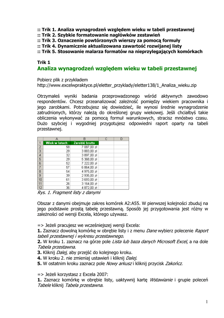 :: Trik 1. Analiza wynagrodzeń względem wieku w tabeli przestawnej :: Trik 2. Szybkie formatowanie nagłówków zestawień :: Trik 3. Oznaczenie powtórzonych wierszy za pomocą formuły :: Trik 4. Dynamicznie aktualizowana zawartość rozwijanej listy :: Trik 5. Stosowanie malarza formatów na nieprzylegających komórkach Trik 1 Analiza wynagrodzeń względem wieku w tabeli przestawnej Pobierz plik z przykładem http://www.excelwpraktyce.pl/eletter_przyklady/eletter138/1_Analiza_wieku.zip Otrzymałeś wyniki badania przeprowadzonego wśród aktywnych zawodowo respondentów. Chcesz przeanalizować zaleŜność pomiędzy wiekiem pracownika i jego zarobkami. Potrzebujesz się dowiedzieć, ile wynosi średnie wynagrodzenie zatrudnionych, którzy naleŜą do określonej grupy wiekowej. Jeśli chciałbyś takie obliczenia wykonywać za pomocą formuł warunkowych, stracisz mnóstwo czasu. DuŜo szybciej i wygodniej przygotujesz odpowiedni raport oparty na tabeli przestawnej. Rys. 1. Fragment listy z danymi Obszar z danymi obejmuje zakres komórek A2:A55. W pierwszej kolejności zbuduj na jego podstawie prostą tabelę przestawną. Sposób jej przygotowania jest róŜny w zaleŜności od wersji Excela, którego uŜywasz. => JeŜeli pracujesz we wcześniejszej wersji Excela: 1. Zaznacz dowolną komórkę w obrębie listy i z menu Dane wybierz polecenie Raport tabeli przestawnej i wykresu przestawnego. 2. W kroku 1. zaznacz na górze pole Lista lub baza danych Microsoft Excel, a na dole Tabela przestawna. 3. Kliknij Dalej, aby przejść do kolejnego kroku. 4. W kroku 2. nie zmieniaj ustawień i kliknij Dalej. 5. W ostatnim kroku zaznacz pole Nowy arkusz i kliknij przycisk Zakończ. => JeŜeli korzystasz z Excela 2007: 1. Zaznacz komórkę w obrębie listy, uaktywnij kartę Wstawianie i grupie poleceń Tabele kliknij Tabela przestawna. 1 2. W wyświetlonym oknie upewnij się, czy Excel poprawnie rozpoznał zakres danych źródłowych. 3. U dołu zaznacz opcję Nowy arkusz i kliknij OK. Zostanie wyświetlony projekt tabeli przestawnej jak na rysunku 2. Rys. 2. Projekt tabeli przestawnej 6. Chwyć myszą pole Wiek w latach i przeciągnij je nad obszar nazwany Upuść pola wierszy tutaj. 7. Pole Zarobki brutto umieść w obszarze Upuść elementy danych tutaj. Tabela przestawna jest gotowa. Teraz w kolumnie Wiek w latach utwórz grupy wiekowe. => W tym celu: 1. Prawym przyciskiem myszy kliknij dowolną liczbę w kolumnie A. 2. Z menu podręcznego, które się pojawiło, wybierz polecenie Grupuj i pokaŜ szczegóły/Grupuj (w Excelu 2007: Grupuj). 3. W polach Początek i Koniec wpisz odpowiednio 20 i 60, a w polu według wprowadź 10. Rys. 3. Opcje grupowania 4. Zatwierdź, klikając OK. 2 Lata zostały ujęte w grupy wiekowe. Pozostała Ci na koniec zamiana podsumowań na wartości średnie. => Aby to zrobić: 1. Prawym przyciskiem myszy kliknij dowolną sumę w kolumnie B i z menu podręcznego wybierz polecenie Ustawienia pola. 2. W polu Podsumowanie według zaznacz Średnia i kliknij OK. 3. Otrzymanym wartościom nadaj format walutowy Rys. 4. Gotowy raport Wskazówka W tak zbudowanym raporcie bardzo szybko moŜesz np. sprawdzić, jakie są najwyŜsze zarobki w obrębie grupy wiekowej. W tym celu dostosuj rodzaj obliczeń za pomocą polecenia Ustawienia pola. 3 Trik 2 Szybkie formatowanie nagłówków zestawień Pobierz plik z przykładem http://www.excelwpraktyce.pl/eletter_przyklady/eletter138/2_Naglowki_zestawien.zip Znaczna część uŜytkowników Excela rozpoczyna budowanie swoich zestawień od sformatowania wiersza nagłówkowego, w którym znajdą się oznaczenia kategorii danych dla kaŜdej kolumny. W związku z tym naleŜy uruchomić wiele opcji formatowania (wypełnienie tła, obramowanie, pogrubienie czcionki itd.). Ty od teraz nie musisz na to tracić czasu, jeśli zastosujesz poniŜszy sposób oparty na formatowaniu warunkowym. Przyjmijmy, Ŝe będziesz budował podobne zestawienia w róŜnych arkuszach pustego skoroszytu. Aby uniknąć kaŜdorazowego formatowania wierszy nagłówkowych, w pierwszej kolejności zgrupuj arkusze. => W tym celu: 1. Zaznacz zakładkę pierwszego arkusza, wciśnij klawisz Shift i kliknij zakładkę ostatniego. 2. Teraz przejdź do pierwszego arkusza i zaznacz cały pierwszy wiersz, klikając jego etykietę z numerem. Rys. 1. Zgrupowane arkusze i zaznaczony pierwszy wiersz 3. Z menu Format wybierz polecenie Formatowanie warunkowe (w Excelu 2007: uaktywnij kartę Narzędzia główne i wskaŜ Formatowanie warunkowe/Nowa reguła). 4. Z pierwszej rozwijanej listy wybierz pozycję Formuła jest (w Excelu 2007: uaktywnij opcję UŜyj formuły do określenia komórek, które naleŜy sformatować), a w pole edycji wpisz taką formułę: =NIE(CZY.PUSTA(A$1)) 5. Kliknij przycisk Formatuj i określ sposób formatowania wiersza nagłówkowego zestawień. 4 Rys. 2. Poprawnie zdefiniowany warunek formatowania 6. Na koniec zatwierdź, klikając OK. Gdy będziesz chciał wpisać kolejną nazwę kategorii danych do pierwszego wiersza, nagłówek zostanie odpowiednio wyróŜniony. Rys. 3. Format nadawany po wpisaniu nazwy kategorii danych w nagłówku 5 Trik 3 Oznaczenie powtórzonych wierszy za pomocą formuły Pobierz plik z przykładem http://www.excelwpraktyce.pl/eletter_przyklady/eletter138/3_Wielokrotne_wystapienia.zip ZałóŜmy, Ŝe w arkuszu rejestrujesz dane wszystkich klientów. Nazwy firm wpisujesz do zestawienia na podstawie wystawianych dokumentów. Niestety w trakcie przeglądania arkusza zauwaŜasz, Ŝe niektóre nazwy się powtarzają. Aby pozbyć się wielokrotnych wpisów, naleŜałoby je odszukać i ręcznie usunąć całe wiersze. W jaki sposób to szybko zrobić? PosłuŜ się sprytną formułą! Przykładowe dane przedstawia rysunek 1. Rys. 1. Rejestr zawierający powtórzone wpisy => Aby oznaczyć identyfikatory klientów, które występują wielokrotnie: 1. W komórce C2 wprowadź następującą formułę: =JEśELI(LICZ.JEśELI($B$2:$B$8; B2)>1;"Wi