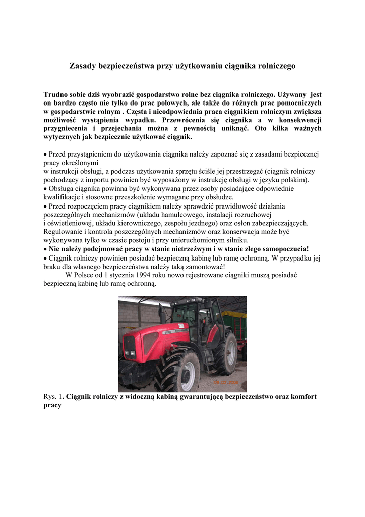 Zasady bezpieczeństwa przy użytkowaniu ciągnika rolniczego Trudno sobie dziś wyobrazić gospodarstwo rolne bez ciągnika rolniczego. Używany jest on bardzo często nie tylko do prac polowych, ale także do różnych prac pomocniczych w gospodarstwie rolnym . Częsta i nieodpowiednia praca ciągnikiem rolniczym zwiększa możliwość wystąpienia wypadku. Przewrócenia się ciągnika a w konsekwencji przygniecenia i przejechania można z pewnością uniknąć. Oto kilka ważnych wytycznych jak bezpiecznie użytkować ciągnik. • Przed przystąpieniem do użytkowania ciągnika należy zapoznać się z zasadami bezpiecznej pracy określonymi w instrukcji obsługi, a podczas użytkowania sprzętu ściśle jej przestrzegać (ciągnik rolniczy pochodzący z importu powinien być wyposażony w instrukcję obsługi w języku polskim). • Obsługa ciągnika powinna być wykonywana przez osoby posiadające odpowiednie kwalifikacje i stosowne przeszkolenie wymagane przy obsłudze. • Przed rozpoczęciem pracy ciągnikiem należy sprawdzić prawidłowość działania poszczególnych mechanizmów (układu hamulcowego, instalacji rozruchowej i oświetleniowej, układu kierowniczego, zespołu jezdnego) oraz osłon zabezpieczających. Regulowanie i kontrola poszczególnych mechanizmów oraz konserwacja może być wykonywana tylko w czasie postoju i przy unieruchomionym silniku. • Nie należy podejmować pracy w stanie nietrzeźwym i w stanie złego samopoczucia! • Ciągnik rolniczy powinien posiadać bezpieczną kabinę lub ramę ochronną. W przypadku jej braku dla własnego bezpieczeństwa należy taką zamontować! W Polsce od 1 stycznia 1994 roku nowo rejestrowane ciągniki muszą posiadać bezpieczną kabinę lub ramę ochronną. Rys. 1. Ciągnik rolniczy z widoczną kabiną gwarantującą bezpieczeństwo oraz komfort pracy Rys. 2. Ciągnik bez kabiny i ramy ochronnej • Należy utrzymywać drzwi i sufit kabiny w takim położeniu, aby zabezpieczyć się przed wypadnięciem w czasie wywrotki. • W kabinie ciągnika nie należy przewozić luzem narzędzi ani innych przedmiotów, które mogą być niebezpieczne w czasie wypadku. • W ciągniku podczas pracy może przebywać tylko kierowca, chyba, że ciągnik jest wyposażony w dodatkowe siedzenie, a dokument rejestracyjny przewiduje możliwość przewożenia pasażera. • W czasie eksploatacji ciągnika rolniczego niedopuszczalne jest: - zaczepianie lin, łańcuchów lub haków holowniczych do miejsc konstrukcyjnie nieprzewidzianych do tego celu, - wskakiwanie na sprzęt lub zeskakiwanie z niego w czasie jego ruchu, - sprawdzanie poziomu cieczy chłodzącej w układzie chłodzenia lub otwieranie korka wlewu oleju przy rozgrzanym silniku, - rozłączanie napędu lub zatrzymanie pracy silnika podczas jazdy ze stoków, - uruchamianie sprzętu w pomieszczeniach zamkniętych, pozbawionych systemu odprowadzania spalin na zewnątrz. • Niedopuszczalne jest przebywanie między ciągnikiem a maszyną współpracującą oraz wchodzenie na dysze, zaczepy, ramy i inne części ciągnika, przyczepy, naczepy lub maszyny rolnicze w czasie ich pracy lub transportu. • Podczas przerwy w pracy maszyn współpracujących z ciągnikiem, napęd przekazu mocy ciągnika powinien być wyłączony a silnik unieruchomiony. • Wszelkich napraw sprzętu zawieszonego na ciągniku można dokonywać jedynie po uprzednim opuszczeniu sprzętu na podłoże lub odpowiednią podstawkę. • Należy dbać o odpowiedni stan techniczny schodków wejściowych do kabiny. Rys.3. Schodki i poręcz zmniejszające ryzyko wystąpienia kontuzji spowodowanej upadkiem podczas wchodzenia lub opuszczania kabiny ciągnika Rys. 4. Schodek przeznaczony do natychmiastowej naprawy • Przy parkowaniu ciągnika na pochyłym terenie należy zaciągnąć hamulec ręczny i włączyć odpowiedni bieg przeciwdziałający staczaniu się ciągnika. • Niedopuszczalna jest jazda ciągnikiem po pochyłości przy wyłączonym biegu lub silniku. • Wjeżdżając pod górę: - wybierz odpowiedni bieg, eliminując potrzebę zmiany biegów w czasie podjazdu pod górę, - przy jeździe ciągnikiem np. z podwieszonym opryskiwaczem, podczas jazdy pod górę może nastąpić przewrócenie ciągnika do tyłu lub utrata zdolności kierowania na skutek zbyt małego nacisku na przednie koła, - zawsze zawracaj na szczycie, a nie na boku wzniesienia. • Zjeżdżając z góry: - wybierz odpowiedni bieg, tzn. taki sam jak przy podjeżdżaniu pod górę, zapewni to właściwe hamowanie silnikiem, - zjeżdżaj z góry prosto w dół w miejscu o najmniejszym nachyleniu, a nie na ukos wzniesienia. • Postój ciągnika na wzniesieniu: - wyłącz silnik, - zaciągnij hamulce, - włącz najniższy bieg przeciwny do kierunku staczania się ciągnika, - nigdy nie parkuj ciągnika z ciężkim ładunkiem na stromym zboczu. • Zagrzęźnięcie w błocie: - gdy ciągnik zaczyna grzęznąć próbuj cofnąć, - jeśli to się nie powiedzie nie wykonuj następnych prób, gdyż zapadniesz się głębiej, - nigdy nie próbuj samodzielnie wyciągać ciągnika za pomocą łańcucha zaczepionego do koła i drzewa, gdyż może to spowodować przewrócenie się ciągnika do tyłu. • Ciągnięcie ciągnika za pomocą łańcucha lub liny holowniczej: - liny holowniczej nie zaczepiaj nigdy powyżej osi kół ciągnika – lina zaczepiona zbyt wysoko może być przyczyną przewrócenia się ciągnika do tyłu nawet na równym terenie. • Do pracy ciągnikiem rolniczym ubieraj się w odzież ochronną przylegającą do ciała, aby zabezpieczyć się przed pochwyceniem przez ruchome części. Zdjęcia i tekst Janusz Pawlak Okręgowy Inspektorat Pracy Zielona Góra