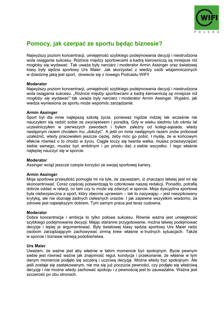 Pomocy, jak czerpać ze sportu będąc biznesie? Najwyższy poziom koncentracji, umiejętność szybkiego podejmowania decyzji i niestrudzona wola osiągania sukcesu. Różnice między sportowcami a kadrą kierowniczą są mniejsze niż mogłoby się wydawać. Tak uważa były narciarz i moderator Armin Assinger oraz światowej klasy były sędzia sportowy Urs Maier. Jak skorzystać z wiedzy osób wtajemniczonych w dziedzinę jaką jest sport, dowiecie się z nowego Podcastu WIFI! Moderator Najwyższy poziom koncentracji, umiejętność szybkiego podejmowania decyzji i niestrudzona wola osiągania sukcesu. „Różnice między sportowcami a kadrą kierowniczą są mniejsze niż mogłoby się wydawać” tak uważa były narciarz i moderator Armin Assinger. Wyjaśni, jak wiedza wyniesiona ze sportu może wspomóc zarządzanie. Armin Assinger Sport był dla mnie najlepszą szkołą życia, ponieważ nigdzie indziej tak wcześnie nie nauczyłem się radzić sobie ze zwycięstwem i porażką. Gdy w wieku siedmiu lub ośmiu lat uczestniczyłem w pierwszych zawodach i byłem zależny od kolegi-sąsiada, wtedy następnym razem chciałem mu „dołożyć”. A jeśli on mnie następnym razem znów próbował uzależnić, wtedy pracowałem jeszcze ciężej, żeby móc go pobić. I myślę, że w końcowym efekcie również o to chodzi w życiu. Ciągle toczy się twarda walka, musisz przezwyciężać siebie samego, musisz być ambitnym i po prostu dać z siebie wszystko. I tego właśnie najlepiej nauczyć się w sporcie. Moderator Assinger wciąż jeszcze czerpie korzyści ze swojej sportowej kariery. Armin Assinger Moja sportowa przeszłość pomogła mi na tyle, że zauważam, iż znacząco łatwiej jest mi się skoncentrować. Coraz częściej potwierdzają to członkowie naszej redakcji. Ponadto, potrafię dobrze oddać w relacji, co tam czy tu może się zdarzyć w sporcie. Moja dyscyplina sportowa była niebezpieczna a sport, który obecnie uprawiam – tak to nazywając – jest naszpikowany krytyką, ale nie doznaję żadnych cielesnych urazów. I jak zapewne wszystkim wiadomo, że zdrowie jest największym dobrem. Tym samym praca jest teraz cudowna. Moderator Dobra koncentracja i ambicja to tylko połowa sukcesu. Równie ważna jest umiejętność szybkiego podejmowania decyzji. Mając staranne przygotowanie, można łatwiej podejmować decyzje i lepiej je argumentować. Były światowej klasy sędzia sportowy Urs Maier radzi osobom zarządzającym zachowywać zimną krew właśnie w trudnych sytuacjach. Także w sporcie i biznesie istnieją podobieństwa. Urs Maier Uważam, że ważne jest aby właśnie w takim momencie być spokojnym. Bycie pewnym siebie jest również ważne jak znajomość reguł, kondycja i przekonanie, że właśnie w tym danym momencie podjęło się szczerą i uczciwą decyzję. Można wtedy być spokojnym. Ale jeśli zostaje się zaatakowanym, nie ma się już poczucia pewności, czy podjęło się właściwą decyzję i nie można wtedy zachować spokoju i z pewnością jest to zauważalne. Ważna jest szczerość po obu stronach. Moderator Błądzić jest rzeczą ludzką. Również kierownictwu zdarza się popełniać czasami błędy. Jednak błędy sędziego są szczególnie złe. Maier zdradza, jak radzi sobie z błędami. Urs Maier Nie ma przedsiębiorstwa, które nie popełniałoby błędów, nie ma szefa, który by nie popełniałby błędów. Trzeba dać tym ludziom pewnego rodzaju ochronę i powiedzieć: Wolno wam popełniać błędy, ale nie wolno wam popełniać tych błędów dwukrotnie. Ważne jest jeszcze i to, aby ludzie również czuli taką ochronę. Moderator Ważną rzeczą jest rekompensowanie błędnych decyzji zrównoważonymi działaniami. Urs Maier W początkowym etapie mojej pracy jako sędziego pracującego w niższych ligach, doświadczyłem kilka razy sytuacji, kiedy trener, Niemiec, powiedział do mnie: „Hej, nie możesz naprawiać swoich błędów, jeśli tego nie zrobisz, popełniasz drugi błąd i obie drużyny są niezadowolone”. I wtedy zauważyłem, że właściwie to się zgadza, gdyż wynik 1 do 1 nie jest żadnym wynikiem, ponieważ nie daje zadowolenia żadnej drużynie. Możesz popełnić jeden błąd, ale potem znów musisz postępować właściwie i gwizdać zgodnie z zasadami piłkarskimi. Wziąłem sobie to do serca i w czasie dalszej mojej kariery nigdy więcej tego nie zrobiłem. Moderator Sport zawodowy promuje samotników, którzy nie mają szacunku do innych – szczególnie ma to miejsce w takich dyscyplinach jak jazda na nartach, pływanie czy tenis. Armin Assinger Jeśli masz sportowca, który wcześniej zajmował się dyscypliną zespołową, to uważam, że taka osoba ma lepsze warunki i przygotowanie, aby łatwiej mu było pracować w zespole niż osoba, która zajmowała się sportem indywidualnym i była odpowiedzialna tylko za siebie. Taka osoba z pewnością będzie miała większe trudności odnalezienia się we właściwym miejscu, podporządkowania się, współpracy i tak dalej. Ale zakładając pewną inteligencję, jestem głęboko przekonany o tym, że sportowcy także Ci indywidualni bardzo dobrze wypadają w efekcie końcowym. Moderator Mimo to, Assinger uważa, że nie wolno wyciągać żadnych negatywnych wniosków. Armin Assinger Uważam, że sport wyczynowy nie jest żadnym negatywnym przykładem bezwzględności. Sport ma może jedną wadę, że sport zawodowy jest medialnie nagłaśniany. Dowiadujesz się wszystkiego o sportowcach, wszystkiego co się wydarzyło. Ale nie wiesz, co dzieje się u tego czy innego menadżera, nie wiesz co dzieje się w tym czy innym dużym przedsiębiorstwie. Sądzę, że to co się tam dzieje, można określić jako bezkompromisową rundę. Kto myśli, że wszędzie tam panuje próżność, pokój, radość, jak pięknie mówią o tym Niemcy, jest w błędzie. Tylko sportowcy mogą dać nam o wiele więcej, niż sama gospodarka.