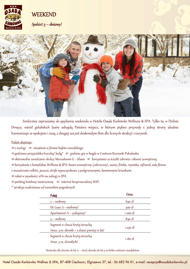 WEEKEND /pakiet 3 – dniowy/ Serdecznie zapraszamy do spędzenia weekendu w Hotelu Osada Karbówko Wellness & SPA. Tylko tu, w Dolinie Drwęcy, wśród golubskich lasów odnajdą Państwo miejsce, w którym piękno przyrody z jednej strony idealnie harmonizuje ze spokojem i ciszą, z drugiej zaś jest doskonałym tłem dla licznych atrakcji i rozrywek. Pakiet obejmuje: • 2 noclegi • śniadanie w formie bufetu szwedzkiego • godzinna przejażdżka bryczką/ kulig* • godzina gry w kręgle w Centrum Rozrywki Pohulanka • ekstremalne zwiedzanie okolicy Mercedesem G – klasse • korzystanie ze ścieżki zdrowia i siłowni zewnętrznej • korzystanie z kompleksu Wellness & SPA: basen wewnętrzny (całoroczny), sauny: fińska, rzymska, infrared, sala fitness z masażerami rolletic, jacuzzi, strefa wypoczynkowa z podgrzewanymi, kamiennymi leżankami • rabat w wysokości 10% na zabiegi w SPA • parking hotelowy niestrzeżony • internet bezprzewodowy WiFi *) atrakcja uzależniona od warunków pogodowych Pokój 2 – osobowy De Luxe /2 –osobowy/ Apartament /2 – pokojowy/ 3 – osobowy Segment w chacie krytej strzechą /max. 3 os. dorosłe + 2 dzieci poniżej 12 lat/ Segment w chacie krytej strzechą /max. 5 os. dorosłych/ Cena 640 zł 920 zł 1 060 zł 840 zł 1 050 zł 1 180 zł *dostawka dla dziecka do lat 12 – 160zł, dziecko do lat 5 na łóżku rodziców nieodpłatnie