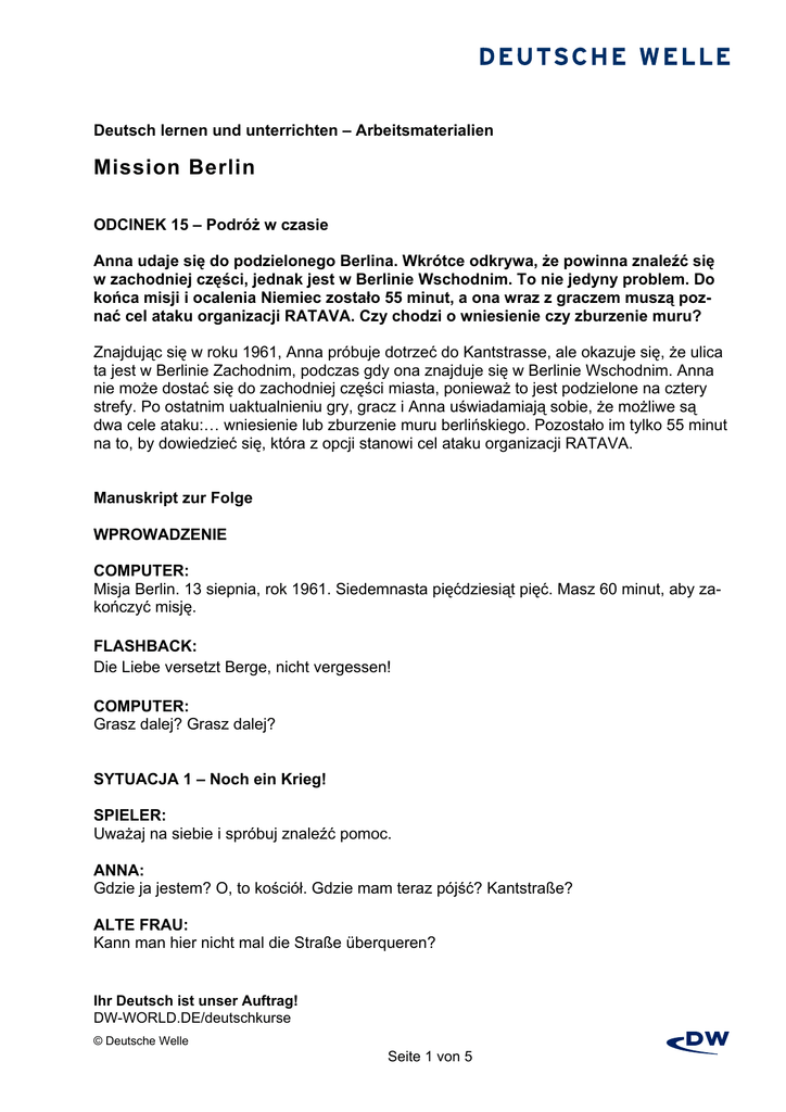 Deutsch lernen und unterrichten – Arbeitsmaterialien Mission Berlin ODCINEK 15 – Podróż w czasie Anna udaje się do podzielonego Berlina. Wkrótce odkrywa, że powinna znaleźć się w zachodniej części, jednak jest w Berlinie Wschodnim. To nie jedyny problem. Do końca misji i ocalenia Niemiec zostało 55 minut, a ona wraz z graczem muszą poznać cel ataku organizacji RATAVA. Czy chodzi o wniesienie czy zburzenie muru? Znajdując się w roku 1961, Anna próbuje dotrzeć do Kantstrasse, ale okazuje się, że ulica ta jest w Berlinie Zachodnim, podczas gdy ona znajduje się w Berlinie Wschodnim. Anna nie może dostać się do zachodniej części miasta, ponieważ to jest podzielone na cztery strefy. Po ostatnim uaktualnieniu gry, gracz i Anna uświadamiają sobie, że możliwe są dwa cele ataku:… wniesienie lub zburzenie muru berlińskiego. Pozostało im tylko 55 minut na to, by dowiedzieć się, która z opcji stanowi cel ataku organizacji RATAVA. Manuskript zur Folge WPROWADZENIE COMPUTER: Misja Berlin. 13 siepnia, rok 1961. Siedemnasta pięćdziesiąt pięć. Masz 60 minut, aby zakończyć misję. FLASHBACK: Die Liebe versetzt Berge, nicht vergessen! COMPUTER: Grasz dalej? Grasz dalej? SYTUACJA 1 – Noch ein Krieg! SPIELER: Uważaj na siebie i spróbuj znaleźć pomoc. ANNA: Gdzie ja jestem? O, to kościół. Gdzie mam teraz pójść? Kantstraße? ALTE FRAU: Kann man hier nicht mal die Straße überqueren? Ihr Deutsch ist unser Auftrag! DW-WORLD.DE/deutschkurse © Deutsche Welle Seite 1 von 5 Deutsch lernen und unterrichten – Arbeitsmaterialien Mission Berlin ANNA: Nie ma nikogo, kto pomógłby tej kobiecie przejść przez ulicę. Eee… Entschuldigung, ee… darf ich Ihnen helfen? ALTE FRAU: Tausend Dank, junge Frau! Das ist sehr freundlich von Ihnen. ANNA: Wo ist die Kantstraße? ALTE FRAU: Die Kantstraße? Mädchen, die ist im Westen, verstehen Sie? Da können Sie jetzt nicht hin. ANNA: Da kann ich nicht … Nie mogę tam pójść? Warum?… ALTE FRAU: Gehen Sie schnell nach Hause! ANNA: Chce mnie zabrać do domu? "Nach Hause"? ALTE FRAU: Ja, nach Hause. Bleiben Sie nicht auf der Straße, hören Sie? Die Soldaten, das bedeutet nichts Gutes. Das bedeutet Krieg! Noch ein Krieg! ROZSZYFROWANIE 1 ANNA: Noch ein Krieg … czy to oznacza kolejną … SPIELER: Kolejną wojnę. Dla tej starszej pani wszyscy żołnierze oznaczają kolejną wojnę. ANNA: Ale ona chyba jest nie w pełni rozumu … Co za wojnę? Ihr Deutsch ist unser Auftrag! DW-WORLD.DE/deutschkurse © Deutsche Welle Seite 2 von 5 Deutsch lernen und unterrichten – Arbeitsmaterialien Mission Berlin SPIELER: Prawdopodobnie w czasie II wojny światowej była w Berlinie, który został obrócony w gruz. Potem Niemcy zostały podzielone: Republika Federalna Niemiec sprzymierzyła się z Zachodem, a Niemiecka Republika Demokratyczna była pod wpływem Związku Radzieckiego. ANNA: A Berlin? SPIELER: Został podzielony na 4 sektory. Każdym z nich zarządzał jeden ze zwycięskich sojuszników. Część wschodnia, administrowana przez Sowietów, stała się stolicą Niemieckiej Republiki Demokratycznej. Trzy pozostałe sektory utworzyły Berlin Zachodni … rodzaj enklawy we wschodnich Niemczech. ANNA: Rozumiem, a Kantstraße znajduje się w sektorze zachodnim … na zachodzie … "im Westen". SPIELER: A ty jesteś w części wschodniej, … dlatego nie możesz tam pójść. SYTUACJA 2 COMPUTER: Potrzebne wspomaganie. Zachowaj zmiany. ANNA: Halo, tak słucham? COMPUTER: Zaktualizuj dane misji. ANNA: Moja misja ma zapobiec katastrofie, której konsekwencje poważnie odczują Niemcy. Paul uruchomił pozytywkę, ale melodia urwała się ponieważ brakowało jednego elementu. FLASHBACK: Der Mechanismus ist nicht komplett, verstehst du? Es fehlt ein Teil. Seit 1961. Ihr Deutsch ist unser Auftrag! DW-WORLD.DE/deutschkurse © Deutsche Welle Seite 3 von 5 Deutsch lernen und unterrichten – Arbeitsmaterialien Mission Berlin ANNA: Po pierwsze. Jest związek między muzyką i rokiem 1961. Organom w Gethsemanekirche brakuje maleńkiej części. To była pozytywka. Kiedy włożyłam ją na miejsce, organy zaczęły same grać. Zapadnia otworzyła się na podziemną salę, w której był wehikuł. Wtedy nadeszła kobieta w czerwieni. FLASHBACK: Hände hoch! Wo ist der Schlüssel? ANNA: Po drugie. Mam klucz, ale nie wiem, jak go użyć. Ksiądz grał najpierw melodię <Nostalgie> Dachfega, potem pokazał mi wehikuł. FLASHBACK: Diese Zeitmaschine ist ein spezielles Modell. Sie reist nur in die Vergangenheit. ANNA: Podróżuje tylko w przeszłość … "in die Vergangenheit". FLASHBACK: Alles, was passiert ist … History, verstehen Sie? Aber eine Bande von Zeitterroristen … ANNA: Terroryści, którzy chcą wymazać całą historię. Myślałam, że to RATAVA. Po trzecie: ksiądz chce, żebym cofnęła się w czasie i dowiedziała się czegoś więcej. Sugeruję rok 1961 i ksiądz się zgadza. Po czwarte: cofam się do roku 1961. Dokładnie do dnia rozpoczęcia budowy muru berlińskiego. Aby wrócić, ksiądz daje mi hasło: FLASHBACK: Die Liebe versetzt Berge. ANNA: "Miłość przenosi góry". Po piąte: wszystko, co musisz zrobić, to wpisać cyfry z daty na klawiaturze. I dostaniesz się tam. COMPUTER: Wspomaganie zakończone. Ihr Deutsch ist unser Auftrag! DW-WORLD.DE/deutschkurse © Deutsche Welle Seite 4 von 5 Deutsch lernen und unterrichten – Arbeitsmaterialien Mission Berlin ROZSZYFROWANIE 2 SPIELER: Podążałaś za muzyką. ANNA: I znalazłam maszynę pozwalającą na podróż w czasie. SPIELER: Do tej pory zetknęliśmy się z dwoma wydarzeniami: budową muru berlińskiego… ANNA: … i jego obaleniem. Ale którym interesuje się RATAVA? WNIOSEK COMPUTER: Runda piętnasta zakończona. Masz 55 minut. Przygotuj się do etapu czwartego. Jakie wydarzenia chce wymazać RATAVA? Kobieta w czerwieni depcze ci po piętach! Grasz dalej? Grasz dalej? Grasz dalej? Koprodukcja Deutsche Welle, Polskiego Radia i Radia France Intern