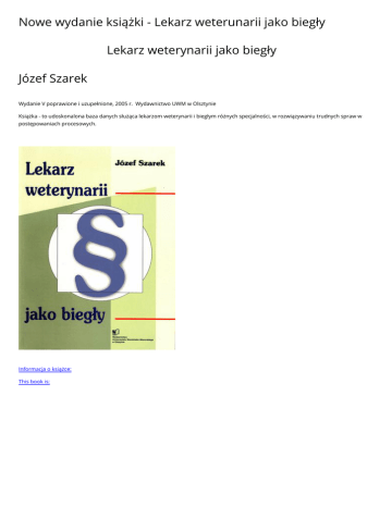 Nowe wydanie książki - Lekarz weterunarii jako biegły Lekarz weterynarii jako biegły Józef Szarek Wydanie V poprawione i uzupełnione, 2005 r. Wydawnictwo UWM w Olsztynie Książka - to udoskonalona baza danych służąca lekarzom weterynarii i biegłym różnych specjalności, w rozwiązywaniu trudnych spraw w postępowaniach procesowych. Informacja o książce: This book is: