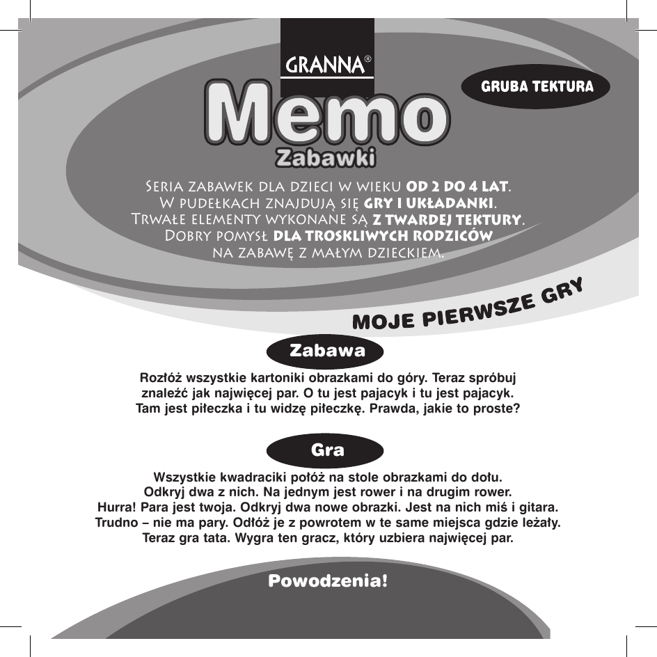 Seria zabawek dla dzieci w wieku od 2 do 4 lat. W pudełkach znajdują się gry i uk¸adanki. Trwałe elementy wykonane są z twardej tektury. Dobry pomysł dla troskliwych rodziców na zabawę z małym dzieckiem. Zabawa Roz∏ó˝ wszystkie kartoniki obrazkami do góry. Teraz spróbuj znaleêç jak najwi´cej par. O tu jest pajacyk i tu jest pajacyk. Tam jest pi∏eczka i tu widz´ pi∏eczk´. Prawda, jakie to proste? Gra Wszystkie kwadraciki po∏ó˝ na stole obrazkami do do∏u. Odkryj dwa z nich. Na jednym jest rower i na drugim rower. Hurra! Para jest twoja. Odkryj dwa nowe obrazki. Jest na nich miÊ i gitara. Trudno – nie ma pary. Od∏ó˝ je z powrotem w te same miejsca gdzie le˝a∏y. Teraz gra tata. Wygra ten gracz, który uzbiera najwi´cej par. Powodzenia! Ilustracje: Anna Wielbut Grafika: Gerard Lepianka www.granna.pl www.superfarmer.pl [email protected] ZawartoÂå pude¸ka 00070/3 24 kwadraty RY PIERWSZE G SERIA MOJE ✄ Drogi kliencie! Nasze gry kompletowane sà ze szczególnà starannoÊcià. JeÊli jednak zdarzà si´ jakieÊ braki (za co z góry serdecznie przepraszamy) prosimy wype∏niç ten kupon i wys∏aç pod adresem: GRANNA, ul. Ksi´cia Ziemowita 47, 03-788 Warszawa Miejsce zakupu: Data zakupu: Brakujàce elementy: Imi´ i nazwisko, adres: