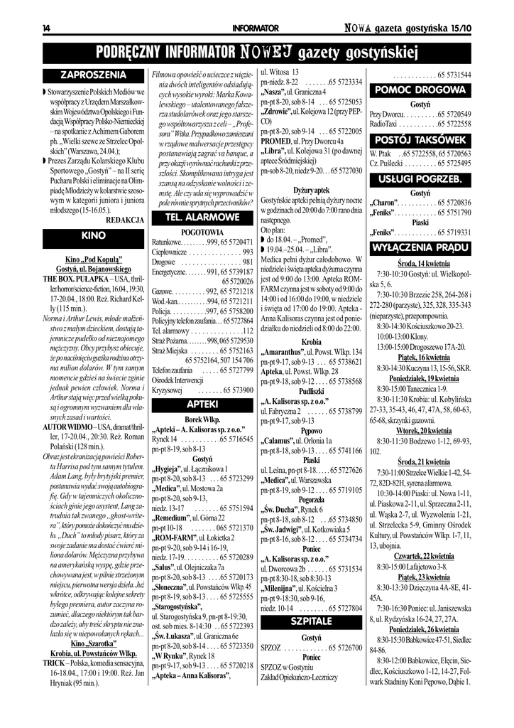 14 INFORMATOR NOWA gazeta gostyñska 15/10 PODRÊCZNY INFORMATOR NOWEJ gazety gostyñskiej ZAPROSZENIA w Stowarzyszenie Polskich Mediów we wspó³pracy z Urzêdem Marsza³kowskim Województwa Opolskiego i Fundacj¹ Wspó³pracy Polsko-Niemieckiej na spotkanie z Achimem Gaborem ph. Wielki szewc ze Strzelec Opolskich (Warszawa, 24.04.); w Prezes Zarz¹du Kolarskiego Klubu Sportowego Gostyñ na II seriê Pucharu Polski i eliminacje na Olimpiadê M³odzie¿y w kolarstwie szosowym w kategorii juniora i juniora m³odszego (15-16.05.). REDAKCJA KINO Kino Pod Kopu³¹ Gostyñ, ul. Bojanowskiego THE BOX. PU£APKA USA, thriller/horror/science-fiction, 16.04., 19:30, 17-20.04., 18:00. Re¿. Richard Kelly (115 min.). Norma i Arthur Lewis, m³ode ma³¿eñstwo z ma³ym dzieckiem, dostaj¹ tajemnicze pude³ko od nieznajomego mê¿czyzny. Obcy przybysz obiecuje, ¿e po naciniêciu guzika rodzina otrzyma milion dolarów. W tym samym momencie gdzie na wiecie zginie jednak pewien cz³owiek. Norma i Arthur staj¹ wiêc przed wielk¹ pokus¹ i ogromnym wyzwaniem dla w³asnych zasad i wartoci. AUTOR WIDMO USA, dramat/thriller, 17-20.04., 20:30. Re¿. Roman Polañski (128 min.). Obraz jest ekranizacj¹ powieci Roberta Harrisa pod tym samym tytu³em. Adam Lang, by³y brytyjski premier, postanawia wydaæ swoj¹ autobiografiê. Gdy w tajemniczych okolicznociach ginie jego asystent, Lang zatrudnia tak zwanego ghost-writera, który pomo¿e dokoñczyæ mu dzie³o. Duch to m³ody pisarz, który za swoje zadanie ma dostaæ æwieræ miliona dolarów. Mê¿czyzna przybywa na amerykañsk¹ wyspê, gdzie przechowywana jest, w pilnie strze¿onym miejscu, pierwotna wersja dzie³a. Ju¿ wkrótce, odkrywaj¹c kolejne sekrety by³ego premiera, autor zaczyna rozumieæ, dlaczego niektórym tak bardzo zale¿y, aby treæ skryptu nie znalaz³a siê w niepowo³anych rêkach... Kino Szarotka Krobia, ul. Powstañców Wlkp. TRICK Polska, komedia sensacyjna, 16-18.04., 17:00 i 19:00. Re¿. Jan Hryniak (95 min.). Filmowa opowieæ o ucieczce z wiêzienia dwóch inteligentów odsiaduj¹cych wysokie wyroki: Marka Kowalewskiego utalentowanego fa³szerza studolarówek oraz jego starszego wspó³towarzysza z celi Profesora Witka. Przypadkowo zamieszani w rz¹dowe malwersacje przestêpcy postanawiaj¹ zagraæ va banque, a przy okazji wyrównaæ rachunki z przesz³oci. Skomplikowana intryga jest szans¹ na odzyskanie wolnoci i zemstê. Ale czy uda siê wyprowadziæ w pole równie sprytnych przeciwników? TEL. ALARMOWE POGOTOWIA Ratunkowe. . . . . . . . .999, 65 5720471 Ciep³ownicze . . . . . . . . . . . . . . 993 Drogowe . . . . . . . . . . . . . . . . 981 Energetyczne. . . . . . . 991, 65 5739187 65 5720026 Gazowe. . . . . . . . . . 992, 65 5721218 Wod.-kan.. . . . . . . . . .994, 65 5721211 Policja. . . . . . . . . . .997, 65 5758200 Policyjny telefon zaufania. . . 65 5727864 Tel. alarmowy . . . . . . . . . . . . . .112 Stra¿ Po¿arna. . . . . . . . 998, 065 5729530 Stra¿ Miejska . . . . . . . . 65 5752163 65 5752164, 507 154 706 Telefon zaufania . . . . . 65 5727799 Orodek Interwencji Kryzysowej . . . . . . . 65 573900 APTEKI ul. Witosa 13 pn-niedz. 8-22 . . . . . . .65 5723334 Nasza, ul. Graniczna 4 pn-pt 8-20, sob 8-14 . . . 65 5725053 Zdrowie, ul. Kolejowa 12 (przy PEPCO) pn-pt 8-20, sob 9-14 . . . 65 5722005 PROMED, ul. Przy Dworcu 4a Libra, ul. Kolejowa 31 (po dawnej aptece ródmiejskiej) pn-sob 8-20, niedz 9-20. . . 65 5727030 Dy¿ury aptek Gostyñskie apteki pe³ni¹ dy¿ury nocne w godzinach od 20:00 do 7:00 rano dnia nastêpnego. Oto plan: w do 18.04. Promed, w 19.04.25.04. Libra. Medica pe³ni dy¿ur ca³odobowo. W niedziele i wiêta apteka dy¿urna czynna jest od 9:00 do 13:00. Apteka ROMFARM czynna jest w soboty od 9:00 do 14:00 i od 16:00 do 19:00, w niedziele i wiêta od 17:00 do 19:00. Apteka Anna Kalisoras czynna jest od poniedzia³ku do niedzieli od 8:00 do 22:00. Krobia Amaranthus, ul. Powst. Wlkp. 134 pn-pt 9-17, sob 9-13 . . . 65 5738621 Apteka, ul. Powst. Wlkp. 28 pn-pt 9-18, sob 9-12 . . . . 65 5738568 Pudliszki A. Kalisoras sp. z o.o. ul. Fabryczna 2 . . . . . . 65 5738799 pn-pt 9-17, sob 9-13 Pêpowo Calamus, ul. Or³onia 1a pn-pt 8-18, sob 9-13 . . . . 65 5741166 Piaski ul. Lena, pn-pt 8-18. . . . . 65 5727626 Medica, ul. Warszawska pn-pt 8-19, sob 9-12 . . . . 65 5719105 Pogorzela w. Ducha, Rynek 6 pn-pt 8-18, sob 8-12 . . .65 5734850 w. Jadwigi, ul. Kotkowiaka 5 pn-pt 8-16, sob 8-12 . . . . 65 5734734 Poniec A. Kalisoras sp. z o.o. ul. Dworcowa 2b . . . . . . 65 5731534 pn-pt 8:30-18, sob 8:30-13 Milenijna, ul. Kocielna 3 pn-pt 9-18:30, sob 9-16, niedz. 10-14 . . . . . . . . 65 5727804 Borek Wlkp. Apteki A. Kalisoras sp. z o.o. Rynek 14 . . . . . . . . . . .65 5716545 pn-pt 8-19, sob 8-13 Gostyñ Hygieja, ul. £¹cznikowa 1 pn-pt 8-20, sob 8-13 . . . 65 5723299 Medica, ul. Mostowa 2a pn-pt 8-20, sob 9-13, niedz. 13-17 . . . . . . . 65 5751594 Remedium, ul. Górna 22 pn-pt 10-18 . . . . . . . 065 5721370 ROM-FARM, ul. £okietka 2 pn-pt 9-20, sob 9-14 i 16-19, niedz. 17-19. . . . . . . . . . 65 5720289 Salus, ul. Olejniczaka 7a pn-pt 8-20, sob 8-13 . . . .65 5720173 S³oneczna, ul. Powstañców Wlkp. 45 pn-pt 8-19, sob 8-13 . . . . 65 5725555 Starogostyñska, ul. Starogostyñska 9, pn-pt 8-19:30, SZPITALE ost. sob mies. 8-14:30 . . 65 5722393 w. £ukasza, ul. Graniczna 6e Gostyñ pn-pt 8-20, sob 8-14 . . . . 65 5723350 SPZOZ . . . . . . . . . . . . 65 5726700 W Rynku, Rynek 18 Poniec pn-pt 9-17, sob 9-13 . . . . 65 5720218 SPZOZ w Gostyniu Apteka Anna Kalisoras, Zak³ad Opiekuñczo-Leczniczy . . . . . . . . . . . . 65 5731544 POMOC DROGOWA Gostyñ Przy Dworcu. . . . . . . . . .65 5720549 RadioTaxi . . . . . . . . . . .65 5722558 POSTÓJ TAKSÓWEK W. Ptak . .65 5722558, 65 5720563 Cz. Pulecki . . . . . . . . . 65 5725495 US£UGI POGRZEB. Gostyñ Charon. . . . . . . . . . . 65 5720836 Feniks. . . . . . . . . . . . 65 5751790 Piaski Feniks. . . . . . . . . . . . 65 5719331 WY£¥CZENIA PR¥DU roda, 14 kwietnia 7:30-