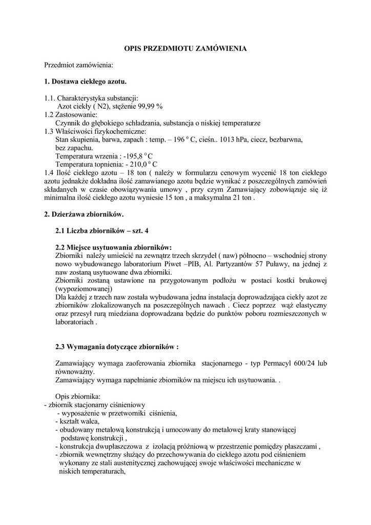 OPIS PRZEDMIOTU ZAMÓWIENIA Przedmiot zamówienia: 1. Dostawa ciekłego azotu. 1.1. Charakterystyka substancji: Azot ciekły ( N2), stężenie 99,99 % 1.2 Zastosowanie: Czynnik do głębokiego schładzania, substancja o niskiej temperaturze 1.3 Właściwości fizykochemiczne: Stan skupienia, barwa, zapach : temp. – 196 0 C, cieśn.. 1013 hPa, ciecz, bezbarwna, bez zapachu. Temperatura wrzenia : -195,8 0 C Temperatura topnienia: - 210,0 0 C 1.4 Ilość ciekłego azotu – 18 ton ( należy w formularzu cenowym wycenić 18 ton ciekłego azotu jednakże dokładna ilość zamawianego azotu będzie wynikać z poszczególnych zamówień składanych w czasie obowiązywania umowy , przy czym Zamawiający zobowiązuje się iż minimalna ilość ciekłego azotu wyniesie 15 ton , a maksymalna 21 ton . 2. Dzierżawa zbiorników. 2.1 Liczba zbiorników – szt. 4 2.2 Miejsce usytuowania zbiorników: Zbiorniki należy umieścić na zewnątrz trzech skrzydeł ( naw) północno – wschodniej strony nowo wybudowanego laboratorium Piwet –PIB, Al. Partyzantów 57 Puławy, na jednej z naw zostaną usytuowane dwa zbiorniki. Zbiorniki zostaną ustawione na przygotowanym podłożu w postaci kostki brukowej (wypoziomowanej) Dla każdej z trzech naw została wybudowana jedna instalacja doprowadzająca ciekły azot ze zbiorników zlokalizowanych na poszczególnych nawach . Ciecz poprzez wąż elastyczny oraz przesył rurą miedziana doprowadzana będzie do punktów poboru rozmieszczonych w laboratoriach . 2.3 Wymagania dotyczące zbiorników : Zamawiający wymaga zaoferowania zbiornika stacjonarnego - typ Permacyl 600/24 lub równoważny. Zamawiający wymaga napełnianie zbiorników na miejscu ich usytuowania. . Opis zbiornika: - zbiornik stacjonarny ciśnieniowy - wyposażenie w przetworniki ciśnienia, - kształt walca, - obudowany metalową konstrukcją i umocowany do metalowej kraty stanowiącej podstawę konstrukcji , - konstrukcja dwupłaszczowa z izolacją próżniową w przestrzenie pomiędzy płaszczami , - zbiornik wewnętrzny służący do przechowywania do ciekłego azotu pod ciśnieniem wykonany ze stali austenitycznej zachowującej swoje właściwości mechaniczne w niskich temperaturach, - połączenia spawane zbiornika wewnętrznego i zewnętrznego podlegają kontroli producenta pod względem wad spawalniczych zgodnie z obowiązującymi przepisami dotyczącymi zbiorników ciśnieniowych , - zbiornik wewnętrzny połączony specjalnym systemem montażowym z płaszczem Zewnętrznym, - przewody wewnętrzne zbiornika wykonane z rur ze stali austenitycznej odznaczającej się niskim przewodnictwem cieplnym , Wymagane wyposażenie zbiornika : - głowica zbiornika : - przetwornik różnicy ciśnień - przetwornik ciśnienia - sygnał wyjściowy prądowy 4/20 miliamper - zawór bezpieczeństwa - pobór gazu i pobór cieczy : 1/2NPT gwint wewnętrzny x 2 do cieczy i do gazu - zawór odbudowy ciśnienia - zawór odcinający na wskaźniku napełnienia Praca zbiorników powinna być całkowicie automatyczna i niezależna od zewnętrznych źródeł zasilania. Zasilania wymagają jedynie przetworniki stanowiące osprzęt zbiorników . Ciśnienie pracy zbiornika winno być regulowane w zależności od potrzeb . Azot ciekły będzie przeznaczony do napełniania zbiorników w postaci dewarów. 2.3 Schemat połączeń zbiornika Wykonawca jest zobowiązany do wykonania podłączenia zbiorników w miejscu wskazanym przez zamawiającego ( pkt. 2.1) , dostosowując zbiorniki do posiadanej przez zamawiającego instalacji. W celu zapoznania się z instalacją stacji zaopatrywania w azot ciekły wykonawcy są zobowiązani przyjechać do siedziby zamawiającego i dokonać stosownych ustaleń w oparciu o posiadaną przez zamawiającego dokumentację techniczną i wizję miejsca instalacji. 2.4 Wymagania dotyczące utrzymania zbiorników w należytym stanie Wykonawca ma obowiązek utrzymania zbiorników w należytym stanie, wykonywania przeglądów, wypełniania obowiązków w zakresie obowiązków dozoru technicznego. 2.5 Odbiór zbiorników Po upływie okresu związania umową wykonawca w terminie uzgodnionym z zamawiającym ma obowiązek odebrania zbiorników i usunięcia ich z terenu należącego do zamawiającego, o ile umowa po okresie trzech lat nie zostanie przedłużona. 3. Transport 3.1 Wymagania dotyczące transportu azotu Zamawiający wymaga realizacji dostaw ciekłego azotu z częstotliwością wynikającą ze zużycia. Przewidywane roczne zużycie ciekłego azotu – 6 ton. Zamawiający poinformuje wykonawcę na piśmie o konieczności realizacji dostawy , nie później niż 5 dni przed terminem żądanej dostawy. 3.2 Wymagania dotyczące transportu zbiorników Zamawiający ma obowiązek dostarczyć zbiorniki do siedziby zamawiającego w terminie do 3 miesięcy od dnia zawarcia umowy.