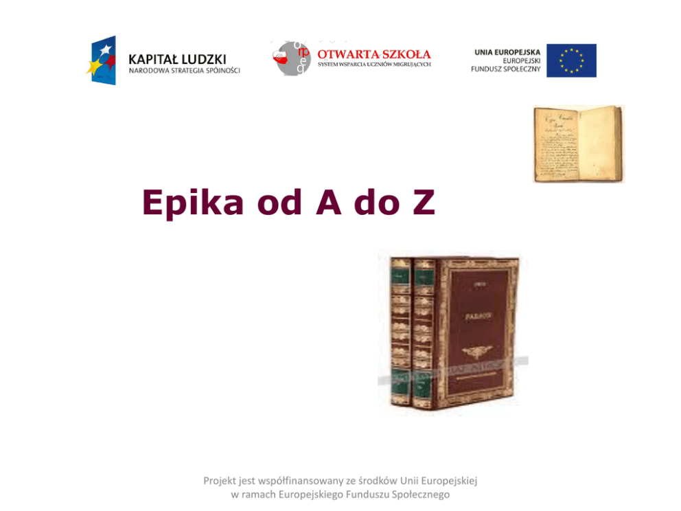 Epika od A do Z Projekt jest współfinansowany ze środków Unii Europejskiej w ramach Europejskiego Funduszu Społecznego Plan 1. Epika - definicja 2. Cechy epiki 3. Gatunki epickie Projekt jest współfinansowany ze środków Unii Europejskiej w ramach Europejskiego Funduszu Społecznego Epika - definicja Epika jest to jeden z trzech rodzajów literackich; Obejmuje utwory pisane przede wszystkim prozą. Pierwsze utwory antyczne powstały w antycznej Grecji i są to eposy: „Iliada” i „Odyseja” Homera. Projekt jest współfinansowany ze środków Unii Europejskiej w ramach Europejskiego Funduszu Społecznego Cechy epickie Bohater literacki jest to postać występująca w utworze, która ma wpływ na przebieg zdarzeń. Przykładowi bohaterowie literaccy z powieści dla dzieci i młodzieży np. Staś i Nel, Harry Potter, Andrzej Kmicic, Pipi. Projekt jest współfinansowany ze środków Unii Europejskiej w ramach Europejskiego Funduszu Społecznego Cechy epickie Świat przedstawiony jest to świat opisany w dziele literackim. Jego elementami to: czas miejsce wydarzeń układ zdarzeń bohaterowie. Projekt jest współfinansowany ze środków Unii Europejskiej w ramach Europejskiego Funduszu Społecznego Cechy epickie Akcja jest to przedstawiony w utworze literackim przebieg zdarzeń, stanowiących spójną całość. Tworzą ją działania bohaterów zmierzające do określonego celu. Akcja składa się z: zawiązania (rozpoczęcia) rozwinięcia rozwiązania (zakończenia) Projekt jest współfinansowany ze środków Unii Europejskiej w ramach Europejskiego Funduszu Społecznego Cechy epickie Narrator to osoba, która przedstawia wydarzenia w tekście prozatorskim. Narrator to osoba, która opowiada zdarzenia. Narrator: wszechwiedzący o ograniczonej wiedzy Projekt jest współfinansowany ze środków Unii Europejskiej w ramach Europejskiego Funduszu Społecznego Cechy epickie Narracja to forma wypowiedzi występująca w utworach literackich, za której pośrednictwem czytelnik poznaje świat przedstawiony dzieła. Celem narracji jest ukazanie zdarzeń w określonym porządku, np. chronologicznym. Rodzaje narracji: pierwszoosobowa trzecioosobowa Projekt jest współfinansowany ze środków Unii Europejskiej w ramach Europejskiego Funduszu Społecznego Cechy epickie Dialog jest to rozmowa między co najmniej dwiema osobami. Wypowiedzi poszczególnych uczestników dialogu zapisuję się następująco: po zdaniu wprowadzającym stawia się dwukropek każdą wypowiedź trzeba zacząć myślnikiem w wypowiedź bohatera mogą być wtrącone słowa narratora – oddziela się je wtedy myślnikami, np.: Na przerwie Kasia podeszła do Ani i zapytała: -Przyjdziesz do mnie dziś po południu? -Bardzo chętnie- powiedziała Ania. -To świetnie –ucieszyła się Kasia –Pokażę Ci moje zdjęcia z Projekt jest współfinansowany ze środków Unii Europejskiej w ramach Europejskiego Funduszu Społecznego Wakacji! Cechy epickie Przesłanie jest to główna myśl zawarta w utworze. literackim, którą autor chciał przekazać odbiorcom. Puenta to krótkie, często dowcipne podsumowanie wypowiedzi lub utworu literackiego. Wątek - w utworze literackim szereg zdarzeń związanych z jednym bohaterem, tworzących ciąg zdarzeń i skutków. Projekt jest współfinansowany ze środków Unii Europejskiej w ramach Europejskiego Funduszu Społecznego Cechy epickie Wydarzenie fantastyczne, inaczej nieprawdopodobne zdarzenia, które nie są spotykane w rzeczywistości. Wydarzenie realistyczne, inaczej prawdopodobne zdarzenia mogące występować w rzeczywistości. Projekt jest współfinansowany ze środków Unii Europejskiej w ramach Europejskiego Funduszu Społecznego Gatunki epickie Rodzaj literacki Rodzaj literacki Epika Gatunki literackie Bajka Baśń Epopeja Legenda Nowela Opowiadanie Powieść Projekt jest współfinansowany ze środków Unii Europejskiej w ramach Europejskiego Funduszu Społecznego Mit Gatunki epickie Tajemnicze i groźne wydarzenia, a przede wszystkim udział w nich osób dość znanych w pewnych kręgach, skłoniły mnie do pominięcia kilku nieistotnych szczegółów z tej pełnej niebezpieczeństw historii. […] Historia ta zaczęła się dla mnie pod koniec lipca, gdy z obozu harcerskiego powrócili do miasta moi trzej młodzi przyjaciele: WilhelmTell, Sokole Oko i Wiewiórka. Z. Nienacki Księga strachów Powieść – dłuższy utwór literacki o rozbudowanej, często wielowątkowej akcji, obejmującej dzieje wielu bohaterów. Projekt jest współfinansowany ze środków Unii Europejskiej w ramach Europejskiego Funduszu Społecznego Gatunki epickie Z tym Rudolfem Cejną sprawa się miała zupełnie inaczej. Od początku czuliśmy, że coś z nim nie jest w porządku. Tak, można było od razu poznać, że Cejna nie jest zwykłym nowym. Pamiętam dokładnie jego wprowadzenie do klasy. Czekaliśmy właśnie na lekcję z języka polskiego, było już kwadrans do dzwonka, a Żwaczek nie przychodził. E. Niziurski Lizus Opowiadanie– niewielki utwór literacki o ograniczonej liczbie wątków i bohaterów. Projekt jest współfinansowany ze środków Unii Europejskiej w ramach Europejskiego Funduszu Społecznego Gatunki epickie A kufer nie był zwyczajny! Wystarczyło nacisnąć zamek, a natychmiast wylatywał w powietrze. Syn kupca nacisnął zamek i hops! Wyleciał przez komin wysoko nad chmury i coraz wyżej i wyżej. Dno kufra trzeszczał, a on bał się nie na żarty, by kufer nie rozleciał się na kawałki, bo wówczas fiknąłby porządnego kozła. […] W ten sposób przyleciał do kraju Turków. Kufer schował w lesie pod suchymi liśćmi i udał się do miasta. H. Ch. Andersen. Latający kufer Baśń – utwór literacki o treści fantastycznej. Opowiada zazwyczaj o cudownych, magicznych wydarzeniach, niezwykłych zjawiskach i istotach. Baśniowe zdarzenia rozgrywają się w bliżej nie określonym miejscu oraz czasie. Kończą się one najczęściej zwycięstwem dob