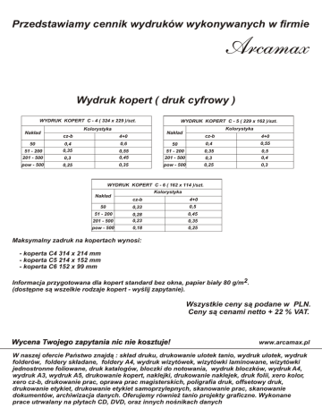 Przedstawiamy cennik wydruków wykonywanych w firmie Wydruk kopert ( druk cyfrowy ) WYDRUK KOPERT C - 4 ( 324 x 229 )/szt. Nak³ad Kolorystyka I Icz-b 4+0 50 0,4 0,6 WYDRUK KOPERT C - 5 ( 229 x 162 )/szt. Kolorystyka Nak³ad I Icz-b 4+0 50 0,4 0,55 51 - 200 0,35 0,35 0,5 0,3 0,55 0,45 51 - 200 201 - 500 201 - 500 0,3 0,4 pow - 500 0,25 0,35 pow - 500 0,25 0,3 WYDRUK KOPERT C - 6 ( 162 x 114 )/szt. Nak³ad Kolorystyka IIcz-b 4+0 0,33 0,5 201 - 500 0,28 0,23 0,45 pow - 500 0,18 0,25 50 51 - 200 0,35 Maksymalny zadruk na kopertach wynosi: - koperta C4 314 x 214 mm - koperta C5 214 x 152 mm - koperta C6 152 x 99 mm Informacja przygotowana dla kopert standard bez okna, papier bia³y 80 g/m2. (dostêpne s¹ wszelkie rodzaje kopert - wyœlij zapytanie). Wszystkie ceny s¹ podane w PLN. Ceny s¹ cenami netto + 22 % VAT. Wycena Twojego zapytania nic nie kosztuje! Wwww.arcamax.pl W naszej ofercie Pañstwo znajd¹ : sk³ad druku, drukowanie ulotek tanio, wydruk ulotek, wydruk folderów, foldery sk³adane, foldery A4, wydruk wizytówek, wizytówki laminowane, wizytówki jednostronne foliowane, druk katalogów, bloczki do notowania, wydruk bloczków, wydruk A4, wydruk A3, wydruk A5, drukowanie kopert, naklejki, drukowanie naklejek, druk folii, xero kolor, xero cz-b, drukowanie prac, oprawa prac magisterskich, poligrafia druk, offsetowy druk, drukowanie etykiet, drukowanie etykiet samoprzylepnych, skanowanie prac, skanowanie dokumentów, archiwizacja danych. Oferujemy równie¿ tanio projekty graficzne. Wykonane prace utrwalany na p³ytach CD, DVD, oraz innych noœnikach danych Przedstawiamy cennik wydruków wykonywanych w firmie Wydruk ulotek ( druk cyfrowy ) ULOTKA A-4 ( 210 x 297 papier 80 g/m2 )/szt. ULOTKA A-3 ( 297 x 420 papier 80 g/m2 )/szt. Nak³ad Kolorystyka cz-b 1+0 cz-b 1+1 4+0 4+1 4+4 8 1 - 25 0,7 1,4 4 4,2 26 - 50 0,35 0,5 3,3 51 - 200 0,25 0,2 0,3 3 2,5 2,8 4,5 4 0,2 2 2,5 3,5 pow - 200 Kolorystyka cz-b 1+0 cz-b 1+1 4+0 4+1 4+4 0,65 0,7 0,9 0,09 0,55 0,08 0,45 0,6 0,48 200 0,08 0,1 500 0,07 pow - 500 0,05 cz-b 1+0 cz-b 1+1 4+0 4+1 4+4 0,35 0,7 2 2,2 4 26 - 50 0,2 0,25 1,5 1,65 2 51 - 200 0,15 0,18 1,3 1,4 1,8 pow - 200 0,1 0,13 1 1,3 1,5 1 - 25 ULOTKA A-6 ( 105 x 148 papier 80 g/m2 )/szt. ULOTKA A-5 ( 148 x 210 papier 80 g/m 2 )/szt. Nak³ad Kolorystyka Nak³ad Kolorystyka Nak³ad 4+0 4+1 4+4 0,04 0,05 0,3 0,35 0,6 0,03 0,05 0,27 0,33 0,54 0,23 0,25 0,4 cz-b 1+0 cz-b 1+1 200 0,75 500 0,65 pow - 500 0,04 0,02 Wydruk folii ( druk cyfrowy ) WYDRUK FOLII ( A-4 210 x 297)/szt. Nak³ad Kolorystyka I Icz-b 4+0 WYDRUK FOLII ( A-4 samoprzylepna )/szt. Kolorystyka Nak³ad IIcz-b 4+0 1 - 25 2,5 6 1 - 25 5,7 9 26 - 50 2,2 5,7 26 - 50 5,5 8,8 51 - 200 2,1 5,5 8,7 pow - 200 51 - 200 pow - 200 5,2 2 5 8 5,2 Wszystkie ceny s¹ podane w PLN. Ceny s¹ cenami netto + 22 % VAT. Wycena Twojego zapytania nic nie kosztuje! Wwww.arcamax.pl W naszej ofercie Pañstwo znajd¹ : sk³ad druku, drukowanie ulotek tanio, wydruk ulotek, wydruk folderów, foldery sk³adane, foldery A4, wydruk wizytówek, wizytówki laminowane, wizytówki jednostronne foliowane, druk katalogów, bloczki do notowania, wydruk bloczków, wydruk A4, wydruk A3, wydruk A5, drukowanie kopert, naklejki, drukowanie naklejek, druk folii, xero kolor, xero cz-b, drukowanie prac, oprawa prac magisterskich, poligrafia druk, offsetowy druk, drukowanie etykiet, drukowanie etykiet samoprzylepnych, skanowanie prac, skanowanie dokumentów, archiwizacja danych. Oferujemy równie¿ tanio projekty graficzne. Wykonane prace utrwalany na p³ytach CD, DVD, oraz innych noœnikach danych Przedstawiamy cennik wydruków wykonywanych w firmie Wydruk wizytówek ( druk cyfrowy ) WIZYTÓWKI ( 90 x 50 papier 300 g/m2 )/szt. Kolorystyka Nak³ad I Icz-b 4+0 100 0,25 0,45 250 0,2 0,3 500 0,18 0,25 Druk etykiet WYDRUK ETYKIET Nak³ad Kolorystyka I Icz-b 4+0 Prosimy o kontakt Etykiety dostêpne s¹ w kolorach: - bia³y - czerwony - zielony - pomarañczowy - ¿ó³ty Etykiety fluorescencyjne: - ¿ó³ty fluo - czerwony fluo - zielony fluo - pomarñczowy fluo Wszystkie ceny s¹ podane w PLN. Ceny s¹ cenami netto + 22 % VAT. Wycena Twojego zapytania nic nie kosztuje! Wwww.arcamax.pl W naszej ofercie Pañstwo znajd¹ : sk³ad druku, drukowanie ulotek tanio, wydruk ulotek, wydruk folderów, foldery sk³adane, foldery A4, wydruk wizytówek, wizytówki laminowane, wizytówki jednostronne foliowane, druk katalogów, bloczki do notowania, wydruk bloczków, wydruk A4, wydruk A3, wydruk A5, drukowanie kopert, naklejki, drukowanie naklejek, druk folii, xero kolor, xero cz-b, drukowanie prac, oprawa prac magisterskich, poligrafia druk, offsetowy druk, drukowanie etykiet, drukowanie etykiet samoprzylepnych, skanowanie prac, skanowanie dokumentów, archiwizacja danych. Oferujemy równie¿ tanio projekty graficzne. Wykonane prace utrwalany na p³ytach CD, DVD, oraz innych noœnikach danych Przedstawiamy cennik wydruków wykonywanych w firmie Skanowanie Drukowanie prac Drukowanie prac A-4 ( 210 x 297 papier 80 g/m 2 )/str. SKANOWANIE /str. Nak³ad Skan z szyby Automat IIcz-b i kolor IIcz-b i kolor 11 - 50 1 0,5 1,5 Ppow 50 0,35 1 1- 10 2 Kolorystyka Nak³ad 4+0 I Icz-b 1 - 10 11 - 50 Ppow 50 0,4 2 0,2 1,8 0,15 1,3 W przypadku wydruku A -3 cena x 2. Oprawa pracy cena 10 PLN ( tylko format A - 4 ) Xero Xero A-4 ( 210 x 297 papier 80 g/m 2 )/str. Kolorystyka Nak³ad I Icz-b 4+0 1 - 10 0,2 2 11 - 50 0,15 1,8 0,1 1,3 Ppow 50 Wydruk offsetowy WYDRUK OFSSETOWY Us³uga xero A -3 cena x 2. Nak³ad Kolorystyka I Icz-b 4+0 Prosimy o kontakt Wydruk offsetowy Prace wykonujemy na wszystkich rodzajach papieru. Wydruk offsetowy wykonujemy w CMYK lub Pantone. W zwi¹zku z bardzo du¿¹ ró¿norodnoœci¹ wykonywanych zamówieñ prosimy o kontakt celem przygotowania indywidualnego kosztorysu danej pracy. Cennik wa¿ny od dnia 01 - 01 - 2010 Niniejszy cennik nie jest ofert¹ w œwietle przepisów Kodeksu Cywilnego Wszystkie ceny s¹ podane w PLN. Ceny s¹ cenami netto + 22 % VAT. Wycena Twojego zapytania nic n