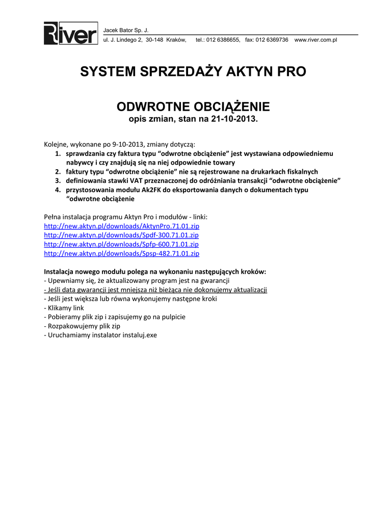 Jacek Bator Sp. J. ul. J. Lindego 2, 30-148 Kraków, tel.: 012 6386655, fax: 012 6369736 www.river.com.pl SYSTEM SPRZEDAŻY AKTYN PRO ODWROTNE OBCIĄŻENIE opis zmian, stan na 21-10-2013. Kolejne, wykonane po 9-10-2013, zmiany dotyczą: 1. sprawdzania czy faktura typu “odwrotne obciążenie” jest wystawiana odpowiedniemu nabywcy i czy znajdują się na niej odpowiednie towary 2. faktury typu “odwrotne obciążenie” nie są rejestrowane na drukarkach fiskalnych 3. definiowania stawki VAT przeznaczonej do odróżniania transakcji “odwrotne obciążenie” 4. przystosowania modułu Ak2FK do eksportowania danych o dokumentach typu “odwrotne obciążenie Pełna instalacja programu Aktyn Pro i modułów - linki: http://new.aktyn.pl/downloads/AktynPro.71.01.zip http://new.aktyn.pl/downloads/Spdf-300.71.01.zip http://new.aktyn.pl/downloads/Spfp-600.71.01.zip http://new.aktyn.pl/downloads/Spsp-482.71.01.zip Instalacja nowego modułu polega na wykonaniu następujących kroków: - Upewniamy się, że aktualizowany program jest na gwarancji - Jeśli data gwarancji jest mniejsza niż bieżąca nie dokonujemy aktualizacji - Jeśli jest większa lub równa wykonujemy następne kroki - Klikamy link - Pobieramy plik zip i zapisujemy go na pulpicie - Rozpakowujemy plik zip - Uruchamiamy instalator instaluj.exe Jacek Bator Sp. J. ul. J. Lindego 2, 30-148 Kraków, tel.: 012 6386655, fax: 012 6369736 www.river.com.pl OPIS ZMIAN WYKONANYCH PO 9-10-2013. Ad 1. Sprawdzania czy faktura typu “odwrotne obciążenie” jest wystawiana odpowiedniemu nabywcy i czy znajdują się na niej odpowiednie towary Zmiany w module Dodatki W tabeli cennika pokazywanej w Dodatki/Towary po naciśnięciu klawisza F9 pokazywane jest okno służące do definiowania dodatkowych parametrów opisujących towar. W oknie tym dodano nowy parametr o nazwie "Towar wrażliwy: T/N". Domyślnie parametr ustawiony jest na “N” i tak powinien być ustawiony dla normalnych towarów. Na “T” trzeba go ustawić dla tych towarów, które mogą się znaleźć na fakturze typu “odwrotne obciążenie”. Są one wymienione w załączniku do Ustawy z dnia 26 lipca 2013 r. o zmianie ustawy o podatku od towarów i usług oraz niektórych innych ustaw . Zmiany w modułach sprzedaży W czasie wystawiania faktury typu "odwrotne obciążenie" program sprawdza, czy jest ona wystawiana dla nabywcy, który może dostawać tego typu dokumenty. 2 Jacek Bator Sp. J. ul. J. Lindego 2, 30-148 Kraków, tel.: 012 6386655, fax: 012 6369736 www.river.com.pl Program sprawdza jak wybrany nabywca ma w swoich danych ustawione pole "Płatnik VAT". Jeśli pole to jest ustawione na "Nie" program pokazuje ostrzeżenie "Nabywca nie jest oznaczony jako Płatnik VAT”. Jeśli pole to jest "Tak" komunikat nie jest pokazywany. Program sprawdza również, czy wszystkie towary znajdujące się na fakturze typu "odwrotne obciążenie" są tzw. towarami wrażliwymi badając parametr towaru opisany w punkcie "Zmiany w module Dodatki". Dla każdej pozycji dokumentu, która nie ma ustawionego tego parametru na "T" program pokazuje komunikat "Towar [kod] nie jest oznaczony jako wrażliwy”. Ad 2. Dla firm, które rejestrują całą sprzedaż na drukarkach fiskalnych wykonano modyfikację polegającą na tym, że faktury typu “odwrotne obciążenie” nie są rejestrowane na drukarkach fiskalnych. 3 Jacek Bator Sp. J. ul. J. Lindego 2, 30-148 Kraków, tel.: 012 6386655, fax: 012 6369736 www.river.com.pl Ad 3. Definiowanie stawki VAT przeznaczonej do odróżniania transakcji “odwrotne obciążenie” – stawka OO. Ze względu na poprawne przenoszenie w/w dokumentów do programów FK oraz KPR, a także ze względu na raporty i rejestrowanie zakupów typu “odwrotne obciążenie” należy w Aktynie, w opcji Konfiguracja i dalej w opcji Stawki VAT zdefiniować stawkę przeznaczona do odróżniania transakcji “odwrotne obciążenie” od innych. Przykład definicji takiej stawki pokazany jest na obrazku poniżej. Wartość stawki musi być koniecznie ustawiona na 0 (zero), Opis na OO (dwie duże litery O jak Olga), Status stawki Aktywna. Jeśli ktoś już wcześniej na potrzeby rejestrowania zakupów typu “odwrotne obciążenie” zdefiniował sobie nową stawkę z opisem NP lub NPL lub innym powinien dokonać edycji tej stawki i zmienić jej opis na OO. Ad 4. Przystosowania modułu Ak2FK do eksportowania danych o dokumentach typu “odwrotne obciążenie. Do poprawnego przenoszenia takich dokumentów do programu finansowo-księgowego konieczne jest zdefiniowanie w Aktynie stawki OO (patrz pkt 3.). 4 Jacek Bator Sp. J. ul. J. Lindego 2, 30-148 Kraków, tel.: 012 6386655, fax: 012 6369736 www.river.com.pl Program Ak2fk tworzy pliki z danymi zapisując dla dokumentów “odwrotne obciążenie” wartości sprzedaży w polach związanych ze stawką OO, a nie w polach oryginalnych stawek VAT pozycji znajdujących się na dokumencie jak to jest dla normalnych faktur i ich korekt. Dla przykładu, jeśli w Aktynie stawka OO została zdefiniowana pod literą G to w pliku będą wypełniane pola: WART_SPR_G – sumaryczna wartość sprzedaży netto towarów, produktów, usług znajdujących się na dokumencie POD_SPR_G – dla dokumentów “odwrotne obciążenie” zawsze 0. Normalnie jest tu sumaryczna wartość podatku od sprzedaży towarów, produktów i usług znajdujących się na dokumencie TOW_SPR_G - sumaryczna wartość sprzedaży netto towarów znajdujących się na dokumencie USL_SPR_G - sumaryczna wartość sprzedaży netto usług znajdujących się na dokumencie PRO_SPR_G - sumaryczna wartość sprzedaży netto produktów znajdujących się na dokumencie Program finansowo-księgowy również musi zostać odpowiednio skonfigurowany i przygotowany do importowania dokumentów typu “odwrotne obciążenie”. Także w tym programie trzeba będzie zdefiniować stawkę OO i wskazać literę pod jaką jest ona ustawiona w Aktynie. Poprawne wskazanie litery z Aktyn