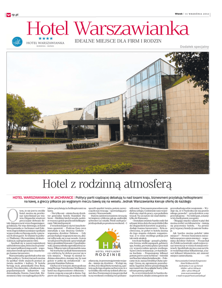 Wtorek | 11 września 2012 ◊ rp .pl Hotel Warszawianka IDEALNE MIEJSCE DLA FIRM I RODZIN MATERIAŁY PRASOWE Dodatek specjalny Hotel z rodzinną atmosferą HOTEL WARSZAWIANKA W JACHRANCE | Politycy partii rządzącej debatują tu nad losami kraju, biznesmeni przylatują helikopterami na kawę, a greccy piłkarze po wygranym meczu bawią się na weselu. Jednak Warszawianka kieruje ofertę do każdego O tym, że nie jest to zwykły hotel, można się przekonać natychmiast po wejściu. Eleganckie wnętrza i precyzyjnie dobrane detale dają poczucie wszechogarniającego luksusu. Nic więc dziwnego, że hotel Warszawianka w Jachrance nad Zalewem Zegrzyńskim na miejsce spotkań i wypoczynku wybierają osoby z pierwszych stron gazet. To właśnie tu politycy Platformy Obywatelskiej dyskutowali m.in. nad sprawami in vitro. – Spotkali się w naszej największej sali konferencyjnej, która może pomieścić nawet półtora tysiąca osób – wspomina kierownik sprzedaży i marketingu Joanna Jaroszewicz. Warszawiankę upodobali sobie nie tylko politycy. Na korytarzach można tu spotkać wiele znanych postaci ze świata mediów i kultury. W hotelu bywają m.in. piosenkarki Ewa Bem, siostry Steczkowskie, członkowie najpopularniejszych kabaretów czy dziennikarka Dorota Gawryluk. Biznesmeni z listy 100 najbogatszych Po- laków przylatują tu helikopterami na kawę. – Nie tylko oni – uśmiecha się dyrektor generalny hotelu Stanisław Dubrow. – Mieliśmy kiedyś wesele, na które wszyscy goście przylecieli helikopterami. Taki mieli pomysł. Z weselem kojarzy się też inna hotelowa opowieść. – Podczas Euro 2012 mieszkała u nas drużyna Greków – wspomina dyrektor Dubrow. – Gdy przyjechali po wygranym meczu, akurat odbywało się u nas wesele. Goście wyszli przed budynek i przywitali piłkarzy gromkimi brawami. Ci podziękowali, a panna młoda zaprosiła ich na zabawę. Piłkarze tańczyli niemal do rana. Nie trzeba być jednak biznesmenem czy celebrytą, by dobrze poczuć się w tym miejscu. – Panuje tu niemal rodzinna atmosfera, staramy się, by nasi goście w pełni się zrelaksowali – zapewnia Stanisław Dubrow. Chyba coś w tym jest, skoro podczas świąt Bożego Narodzenia i Wielkanocy hotel ma stuprocentowe obłożenie. – Goście czują się u nas jak w domu. Najpierw nie dowierzają, że można w taki sposób spędzić święta, potem zazwyczaj do nas wracają – opowiadają pracownicy Warszawianki. Dużym zainteresowaniem cieszą się też imprezy cykliczne, jak np. andrzejki, sylwester czy ostatki. Wiele osób przyjeżdża jednak po prostu na weekend. – I zdarza się, że przesuwają termin wyjazdu – śmieje się dyrektor. – Wydaje się, że dwa, trzy dni pobytu wystarczą, a potem są do tego stopnia zachwyceni, że z tych kilku dni robi się tydzień albo nawet dwa. Pewien mężczyzna przyjechał tu na weekend z rodziną i też postano- wili zostać. Tymczasem pracodawca nie dał mu urlopu. Codziennie rano wyjeżdżał więc stąd do pracy, a po południu wracał. Na szczęście nie miał daleko – tylko do Warszawy. – Dostałam ostatnio bardzo miły list od pani, która dotychczas jeździła tylko do eleganckich kurortów za granicą – dodaje Joanna Jaroszewicz. – Była zachwycona, że pobyt w hotelu można do tego stopnia ciekawie zorganizować, iż w cenie zwykłego pokoju jest tak wiele atrakcji. A tych nie brakuje – ponad 14 hektarów terenu, wielki aquapark, gabinety spa, boiska, prywatna plaża i przystań czy wypożyczalnia sprzętu wodnego. Są też cztery restauracje, a w każdej inna kuchnia. – Proponujemy kilkaset potraw, jest w czym wybierać – twierdzi szef kuchni Adam Kwiatkowski. – Polecamy m.in. naszą Góralską Chatę i pierogi. Cieszą się ogromnym powodzeniem. Są goście, którzy przyjeżdżają do nas i nawet nie chcą oglądać karty, tylko od razu proszą o pierogi. To, co wyróżnia hotel, to bardzo duża przestrzeń, dzięki czemu goście nie przeszkadzają sobie wzajemnie. – Wydaje się, że w budynku nie ma prawie nikogo, prawda? – pyta dyrektor, a my przytakujemy. – No widzi pan, a mamy w tej chwili prawie 200 gości. – Biegając między salami w pięć dni można zrobić 100 kilometrów – śmieją się pracownicy hotelu. – Na pewno przy tej pracy kondycji nam nie brakuje. Jak bardzo można polubić takie miejsce? – Pewien biznesmen mieszkał u nas przez osiem miesięcy – wspomina dyrektor Dubrow. – Przyjechał do Polski na kontrakt, miał rozpoczynać inwestycje w różnych miejscowościach. Spodobało się mu u nas na tyle, że wolał dojeżdżać kilkadziesiąt, a nawet kilkaset kilometrów, niż zmienić miejsce zamieszkania. —rbi Warszawianka Centrum Kongresowe Hotel Wellness & SPA Jachranka 77, 05-140 Serock telefon: +48 22 768 94 50 faks: +48 22 768 94 58 www.warszawianka.pl e-mail: [email protected] 2 Wtorek | 11 września 2012 Hotel Warszawianka rp .pl ◊ Dla aktywnych i chcących poleniuchować NA WEEKEND | Doskonałe położenie, wygodne pokoje, świetna kuchnia, 16 gabinetów spa, 90-metrowa zjeżdżalnia w aquaparku, animatorzy, którzy zajmą się dziećmi, gdy rodzice pójdą na spacer – w hotelu Warszawianka każdy znajdzie coś dla siebie W nieco droższych pokojach znajdziemy również szlafroki czy wannę z jacuzzi. W hotelu znajdują się też pokoje przystosowane do potrzeb osób niepełnosprawnych. MATERIAŁY PRASOWE Restauracje W Warszawiance działają cztery restauracje z kuchniami z różnych stron świata. Największym powodzeniem cieszy się Góralska Chata, w której serwowane jest typowo polskie jedzenie. – Największym powodzeniem cieszą się pierogi, które lepimy tu, na miejscu – opowiada szef kuchni Adam Kwiatkowski. – Nasi goście doceniają to, że kuchnia jest tu typowo domowa, nie używamy półproduktów. W ciepłe dni w ogródku restauracji trudno znaleźć wolne miejsce. – Mamy stałych klientów, którzy nawet nie proszą o menu, tylko za