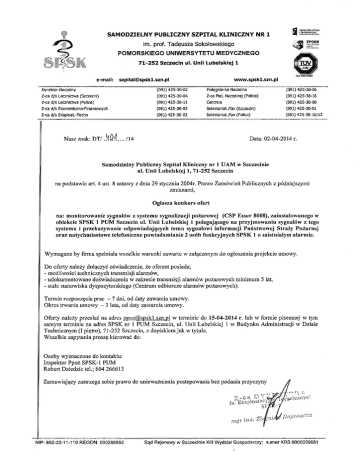 UMOWA O MONITOROWANIU SYSTEMU SYGNALIZACJI POŻARU Nr DT/Z/……/14 Zawarta w dniu ……………… r. w Szczecinie pomiędzy: Samodzielnym Publicznym Szpitalem Klinicznym Pomorskiego Uniwersytetu Medycznego, 71-252 Szczecin, Unii Lubelskiej 1 zwanym dalej „Zamawiającym” reprezentowanym przez: 1. dr n. Med. Marię Ilnicką Mądry - Dyrektora 2. mgr Sabinę Kropielnicką – Głównego Księgowego – Z-cę Dyr. ds. ekonomiczno - finansowych a …………………………………………………………………………………………………………… …………………………………………………………………………………………………………… zwaną dalej „Wykonawcą” reprezentowaną przez: 1. ………………………………………. 2. ………………………………………. Umowę zawarto na podstawie notatki służbowej z wyboru najkorzystniejszej oferty sporządzonej w dniu ……………………. r. w ramach przeprowadzonego konkursu ofert i, uznania oferty Wykonawcy jako najkorzystniejszej. Z uwagi na fakt że zamówienie nie przekracza wyrażonej w złotych polskich równowartości 14 000 Euro, nie podlega ustawie z dnia 29.01.2004 r. Prawo zamówień publicznych (tj. z 2010 r. , Dz.U. nr 113 poz. 759 z poźn. zm) §1 Wykonawca zobowiązuje się do monitorowania sygnałów z systemu sygnalizacji pożaru zainstalowanego w obiekcie w Szczecinie, przy ul. Unii Lubelskiej 1 §2 1. Monitorowanie sygnałów z systemu sygnalizacji pożaru, zainstalowanego w obiekcie wymienionym w § 1 polegać będzie na przyjmowaniu sygnałów z tego systemu i przekazywaniu odpowiadających tym sygnałom informacji Państwowej Straży Pożarnej. Urządzenia transmisji i sposób przekazywania sygnałów będą spełniały aktualne warunki organizacyjno – techniczne wyznaczone przez Komendę Główną Państwowej Straży Pożarnej i będą zgodne ze świadectwami wydanymi przez Centrum Naukowo – Badawcze Ochrony Przeciwpożarowej. Operator zawarł odpowiednią umowę z Komendą Państwowej Straży Pożarnej i upoważniony jest do świadczenia usługi monitorowania systemów ppoż. 2. Wykonawca oświadcza, że a. Zobowiązuje się do monitorowania uzgodnionych sygnałów, przez cały czas trwania umowy, również w dni świąteczne i wolne od pracy, przez całą dobę. b. Zobowiązuje się powiadomić telefonicznie niezwłocznie po wpłynięciu alarmu osoby wymienione w załączniku nr 1. c. Instalowany system transmisji alarmów pożarowych będzie wykonany zgodnie z warunkami technicznymi określonymi przez producenta i będzie spełniał wymogi ochrony przeciwpożarowej. d. Ponosi odpowiedzialność za stan i sprawność techniczną urządzeń transmisji alarmów pożarowych pomiędzy Abonentem a alarmowym centrum odbiorczym PSP i zobowiązuję się, że w przypadku uszkodzenia urządzeń transmisji alarmów przystąpi do ich naprawy w ciągu 24 godzin od powiadomienia o ich uszkodzeniu. e. Zachowa w tajemnicy służbowej wszystkie informacje, które otrzymał i które mają wpływ na stan bezpieczeństwa Abonenta, w czasie obowiązywania umowy oraz po jej rozwiązaniu. §3 rd/MM Umowa………………………………… r. – monitorowanie sygnału p.poż. Strona 1 z 4 Wykonawca zobowiązuje się rejestrować uzgodnione sygnały przyjęte z lokalnego systemu sygnalizacji pożaru i przechowywać je przez okres trzech miesięcy. §4 1. Całkowite wynagrodzenie Wykonawcy wyniesie ………….. zł netto (…………………….. zł.) + obowiązująca stawka podatku VAT. 2. Zamawiający zobowiązany jest od dnia podłączenia do sieci Systemu Monitorowania Sygnałów (SMS) do wnoszenia comiesięcznych opłat w wysokości ………. zł netto (słownie ……………………… zł 00/000) + obowiązująca stawka podatku VAT. 3. Zamawiający ureguluje opłaty wynikające z niniejszej umowy przelewem w terminie 30 dni po otrzymaniu faktury VAT wystawionej przez Wykonawcę na jego rachunek nr ……………………………………………………………. §5 Zamawiający zobowiązuje się do: 1. Utrzymania wewnętrznego systemu sygnalizacji pożaru, przez okres trwania umowy, w stanie pełnej sprawności, dbając o jego bieżącą konserwację; 2. Niezwłocznego zawiadomienia Wykonawcy o ważnych wydarzeniach mogących mieć wpływ na sprawne funkcjonowanie systemu. §6 1. Wykonawca nie odpowiada za szkody spowodowane pożarem, wynikłe z nie wykonania lub nienależytego wykonania usługi monitorowania z powodu: a) nieprawidłowej pracy urządzeń wewnętrznego systemu sygnalizacji pożaru posiadanego przez Zamawiającego; b) innych okoliczności, za które w myśl przepisów Kodeksu Cywilnego zobowiązany do świadczenia nie ponosi odpowiedzialności, a także siły wyższej. 2. Wykonawca nie odpowiada za szkody wynikłe z braku reakcji na przekazaną przez niego informację ze strony Państwowej Straży Pożarnej lub nieskuteczność czy nienależytą skuteczność jej działań. §7 Umowa zostaje zawarta na okres od 01.05.2014 r. do 30.04.2017 r. §8 Wykonawca zastrzega sobie prawo wyłączenia Zamawiającego z sieci monitorowania, w przypadku zwłoki w zapłacie abonamentu, o którym mowa w par. 5 pkt. 1 za dwa pełne okresy płatności. §9 1. Wykonawca zastrzega sobie prawo do rozwiązania umowy w przypadku: a) nie wykonania lub nienależytego wykonania przez Zamawiającego obowiązków, o których mowa w par. 6; b) umyślnego - potwierdzonego w toku postępowania wyjaśniającego - wywołania fałszywych alarmów przez właściciela, bądź osoby za które - w myśl Kodeksu Cywilnego - Zamawiający ponosi odpowiedzialność. 2. W przypadku każdorazowego, stwierdzonego protokołem nienależytego wykonania postanowień umowy Wykonawca zapłaci Zamawiającemu karę umowną w wysokości 200,00 zł brutto. 3. W przypadku każdorazowego stwierdzenia opóźnienia realizacji zapisów § 2 ust 2d niniejszej umowy Wykon
