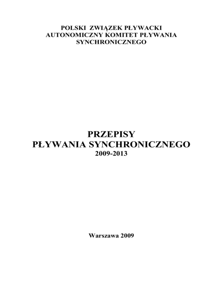 POLSKI ZWIĄZEK PŁYWACKI AUTONOMICZNY KOMITET PŁYWANIA SYNCHRONICZNEGO PRZEPISY PŁYWANIA SYNCHRONICZNEGO 2009-2013 Warszawa 2009 Przepisy Pływania Synchronicznego, 2009-2013 SPIS TREŚCI SS 1 SS 2 SS 3 SS 4 SS 5 SS 6 SS 7 SS 8 SS 9 SS 10 SS 11 SS 12 SS 13 SS 14 SS 15 SS 16 SS 17 SS 18 SS 19 SS 20 SS 21 SS 22 SS 23 SS 24 Przepisy ogólne Konkurencje w Pływaniu Synchronicznym Limity wieku do startu w zawodach FINA Zawody w Pływaniu Synchronicznym Programy zawodów Zgłoszenia Eliminacje i Finały Zawody Figur Komisja Sędziowska w Figurach Ocenianie Figur Kary w Zawodach Figur Obliczanie końcowego rezultatu w Figurach Programy Dowolne Limity czasowe dla Programów dowolnych Akompaniament muzyczny Komisja Sędziowska w Programach Dowolnych Ocenianie Programów Dowolnych Kary w Programach Dowolnych Obliczanie rezultatów w Programach Dowolnych Obliczanie końcowego rezultatu Skład Komisji Sędziowskiej Funkcja Sędziego Głównego Zawodów Funkcja Kierownika Sekretariatu Obowiązki Organizatora Zawodów str. 3 str. 3 str. 3 str. 3 str. 3 str. 4 str. 5 str. 5 str. 6 str. 6 str. 7 str. 7 str. 8 str. 9 str. 11 str. 11 str. 12 str. 14 str. 15 str. 16 str. 17 str. 17 str. 18 str. 19 SS AG Kategorie Wiekowe – Przepisy str. 20 -2- Przepisy Pływania Synchronicznego, 2009-2013 SS 1 Wszystkie międzynarodowe zawody w Pływaniu Synchronicznym winny być rozgrywane w/g przepisów FINA SS 2 Konkurencjami w Pływaniu Synchronicznym są: SOLO, DUET, ZESPÓŁ ( 4 – 8 zaw.) KOMBINACJA (4 - 10 zaw.) SS 3 Zawodniczki młodsze niż 16 lat (w dniu 31.12 roku, w którym rozgrywane są zawody) nie mają prawa startu w Igrzyskach Olimpijskich, Mistrzostwach Świata i Pucharze Świata. SS 4. ZAWODY SS 4.1 Zawody Figur Każda Zawodniczka musi wykonać 4 figury jak opisano w załączniku V do tych przepisów. Figury Seniorek i Juniorek oraz Kat. Wiekowych są wyznaczane przez TSSC co 4 lata i zatwierdzone przez Biuro FINA SS 4.2 Programy Techniczne/ Finały W Programach Technicznych każde SOLO, DUET I ZESPOŁ muszą wykonać elementy opisane w załączniku VI do tych przepisów. Obowiązkowe elementy wyznaczone przez TSSC co 4 lata i zatwierdzone przez Biuro FINA SS 4.3 Programy Dowolne Eliminacje /Finały Każde SOLO, DUET, ZESPÓŁ wykonuje Program Dowolny składający się z kombinacji figur, pływania, „deptania” choreografii rąk przy muzyce. Nie ma ograniczeń w doborze muzyki i choreografii. SS 4.4 Program Kombinowany Eliminacje/Finały Kombinacja składa się w maksymalnie 10 zawodniczek wykonujących kombinację programów. SS 5 PROGRAMY SS 5.1 IO, TEAM: program techniczny oraz program dowolny, losowanie kolejności startowej do programów dowolnych zgodnie z SS 13.4.1. IO, DUETY: program techniczny, program dowolny oraz program dowolny finał SS 5.2 Na MŚ: Programy Techniczne Eliminacje, Programy Techniczne Finały, Programy Dowolne Eliminacje, Programy dowolne Finały, Kombinacje Eliminacje oraz Kombinacje Finały SS 5.3 Na Pucharze Św.- SS BL.9.4.1 Na World Thorphy – SS BL 9.4.2 SS 5.4 Na MŚ Juniorów obowiązuje następująca kolejność konkurencji: Programy Dowolne Eliminacje, Kombinacja eliminacje (względem norm czasowych jak -3- Przepisy Pływania Synchronicznego, 2009-2013 w SSAG 6), Figury junior (załącznik V), Finały Programów Dowolnych oraz Finał Kombinacji SS 5.5 Na wszystkich innych międzynarodowych zawodach w Pływaniu Synchronicznym program może być kombinacją SS 4.1 – SS 4.3, ale w ten sposób, ale by Programy Dowolne zostały włączone. Konkurencja Kombinacji nie musi być włączona w program zawodów. SS 6 ZGŁOSZENIA SS 6.1 Na Igrzyska Olimpijskie, Mistrzostwa Świata Juniorów, Mistrzostwa Kontynentalne i Regionalne oraz inne zawody FINA każda Federacja może zgłosić jedno SOLO, jeden DUET, jeden TEAM oraz jedną KOMBINACJĘ (jeżeli nie podano inaczej) SS 6.1.1 Na Mistrzostwa Świata każdy kraj może zgłosić 1 techniczne i 1 dowolne solo, 1 techniczny i 1 dowolny duet, 1 techniczny team i 1 dowolny team oraz 1 kombinację. Każda zawodniczka ma prawo 7 krotnego startu. SS 6.1.2 Na wszystkich pozostałych zawodach na zasadzie ustaleń uczestniczących Federacji można zgłosić więcej niż 1 solo, 1 duet, 1 team i 1 kombinację, z każdej Federacji. SS 6.1.3 Każda zawodniczka podczas jednych zawodów ma prawo startu w jednym SOLO, jednym DUECIE, jednym ZESPOLE i jednej KOMBINACJI (jeżeli nie ustalono inaczej) SS 6.2 Program TEAM-u oraz KOMBINACJI SS 6.2.1 Na Igrzyskach Olimpijskich ZESPÓŁ musi składać się z 8 zawodniczek., a cała ekipa nie może mieć więcej niż 9 zawodniczek. SS 6.2.2 Na Mistrzostwach Świata i Zawodach FINA Zespół musi liczyć 8 zawodniczek, natomiast Kombinacja 10 zawodniczek. Cała ekipa nie może liczyć więcej niż 12 zawodniczek. SS 6.3 Zgłoszenie na zawody winno wpłynąć do organizatora nie później niż na 7 dni przed rozpoczęciem zawodów. Po tym terminie zgłoszenie nie będzie uwzględnione. SS 6.3.1 W zgłoszeniu należy podać nazwisko i imię: Solistki oraz rezerwę, Duetu oraz maksymalnie 1 rezerwę, Zespołu oraz maksymalnie 2 rezerwy, Kombinacji oraz maksymalnie 2 rezerwy. Na Mistrzostwach Świata: nazwisko i imię solistki technicznej oraz 1 rezerwy, nazwisko imię Solistki występującej w programie dowolnym oraz 1 rezerwy, nazwiska i imiona Duetu technicznego oraz 1 rezerwę, nazwiska i imiona duetu dowolnego oraz 1 rezerwę, nazwiska i imiona Zespołu Technicznego oraz 2 -4- Przepisy Pływania Synchronicznego, 2009-2013 rezerwy, nazwiska i imiona Zespołu dowolnego oraz 2 rezerwy, nazwiska i imiona Kombinacji oraz 2 rezerwy Dla FINA SS World Cup patrz BL 10.4.1 Dla FINA SS World Thophy part BL 10.4.2 SS 7 ELIMINACJE I FINAŁY SS 7.1 Jeżeli do zawodów zgłoszono więcej niż 12 programów dowolnych lub kombinacji to w tej/tych konkurencjach winny odbyć się eliminacje, a 12 najlepszych programów kwalifikuje się do finału. SS 7.1.1 W MŚ powyższy przepis tyczy się także Programów T