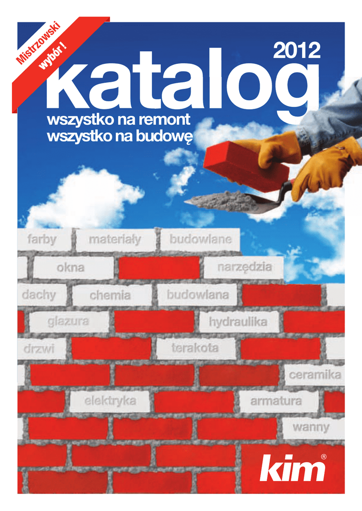 i M katalog o trz is k s w r! ó b wy wszystko na remont wszystko na budowę 2012 wstęp Polska Biało-Czerwoni ! Mistrzostwa Europy w Piłce Nożnej - UEFA EURO 2012 wreszcie w Polsce! Największe piłkarskie sławy zagrają we Wrocławiu, Gdańsku, Poznaniu i... w Warszawie - na nowym, pięknym, biało-czerwonym Stadionie Narodowym. Firma KIM miała zaszczyt czynnie uczestniczyć w budowie tej inwestycji, będąc od początku jej realizacji poważnym dostawcą wielu materiałów budowlanych i wykończeniowych. Mamy nadzieję, że również Państwo zaufacie naszej polskiej biało-czerwonej firmie, a wszechstronna oferta zaspokoi potrzeby każdego wykonawcy. Zachęcamy do zapoznania się z nowym katalogiem KIM „Wszystko na remont, wszystko na budowę”, który prezentuje mistrzowski wybór produktów na rok 2012. Specjalnie na dni trwania Piłkarskich Mistrzostw Euro 2012 przygotowaliśmy dla Naszych Klientów: - Mistrzowskie Ceny na wybrane produkty, - Mistrzowskie Konkursy z nagrodami, - oraz Złoty Skarb Kibica ! Już od 8 czerwca odbierzesz w naszej firmie wyjątkową gazetkę pt. Mistrzowskie Okazje ! Zostań kibicem KIM ! Wygrywaj razem z nami ! Ważne daty w KIM na 2012: Nie przegap mistrzowskich okazji ! - szczegóły na www.kim24.pl Konkurs Mistrz Euro Konkurs Hymn Kibica Wyprzedaż do -80% Bartycka 114 Mistrzowskie okazje! superniskie ceny na wybrane produkty - spis treści 62 06 / architektura ogrodowa, narzędzia ogrodowe 14 / narzędzia, elektronarzędzia 18 / materiały budowlane i maszyny 06 33 / pokrycia dachowe i okna dachowe 41 38 / okna i systemy drzwiowe 41 / chemia budowlana 18 38 52 / glazura, terakota 58 / drzwi 78 33 60 / elektryka 62 / farby, środki ochronne 68 / wszystko do łazienki 68 78 / materiały instalacyjne, grzewcze, odwodnienia 52 Przedstawiona oferta ważna jest od 10.04.2012 do wyczerpania zapasów. Ceny podane są jako brutto. Oferta ma charakter wyłącznie informacyjny polegający na wyróżnieniu artykułów z asortymentu poprzez ich prezentacje w niniejszym katalogu i nie stanowi oferty handlowej w rozumieniu przepisów art. 66 i nast. kodeksu cywilnego. Podane ceny są cenami wyjściowymi i mogą ulec zmianie w trakcie ważności niniejszej informacji produktowej bez obo-wiązku podawania ich do publicznej wiadomości. Przedstawiona oferta jest tylko częściową ofertą firmy KIM i nie stanowi jej pełnej oferty handlowej. 03 / KATALOG 2012 Mistrzowskie ceny! 173 139,- Miska wisząca ECCO IDEAL STANDARD 6450 39,- Mineralna zaprawa klejąca MUREXIN FLEX KGF 65 25 kg Wysoko elastyczna, modyfikowana 6 59 883 SUPERROCK płyta ze skalnej wełny mineralnej do izolacji termicznej i akustycznej gr. 5 cm 42 42 7057 R-KER Żywica winyloestrowa bez styrenu 3423 5695 R-KEM+ Żywica poliestrowa bez styrenu 249 199,- Kompakt typ uniwersalny z deską 3/6 litra WIDIMA IDEAL STANDARD 04 / KATALOG 2012 560 499,- zestaw: stelaż wc z miską wiszącą ECCO + wsporniki + przycisk chrom 3/6 litra + deska twarda Superniskie ceny na wybrane produkty tylko w dniach trwania mistrzostw Euro 2012! Promocja ważna w dniach 8.06-1.07.2012 lub do wyczerpania zapasów. 11 77 MPI 25 Fine Tynk cementowo -wapienny wewnętrzny gładki 125,- 105,- Dyroton 6 Lateksowa farba do ścian wewnętrz, kolor biały, pojemność 10 l nowość 9450 40 82 CT 17 Grunt głęboko penetrujący 10 l 409 499 Weber TD330 cienkowarstwowy tynk silikatowy, dostępny w 20 kolorach 1 kg 2450 22,- Piana pistoletowa O2 65 niskoprężna, wysoka wydajność 65 l 349 419 Weber TD320 Cienkowarstwowy tynk akrylowy, bogata kolorystyka, 1 kg 05 / KATALOG 2012 architektura ogrodowa F kostki szlachetne/płyty tarasowe/kamień naturalny aniu Przy brukow y mieszać leż zawsze na różnych kostkę z 3-4 c ją era palet pobi ymi ow on pi ał ri mate iknąć un aby i, słupkam nia ie ch różnic w odc hni. zc r ie w koloru na MODENA - PIĘKNO UNIWERSALNE Prostota i funkcjonalny szyk, to cechy pożądane w każdej dziedzinie sztuki użytkowej. Szlachetny, geometryczny kształt, wyważona kolorystyka sprawdzają się zawsze, na każdej płaszczyźnie. Klasyka nigdy nie wychodzi z mody. Symetryczne kompozycje ułożone z kostek Modena perfekcyjnie wypełniają przestrzeń o regularnych kształtach, tworząc piękno dostrzegalne przez lata. 06 / KATALOG 2012 TERRANO - RÓŻNORODNE FORMY W JEDNORODNEJ BARWIE VIA TRIO - NASTRÓJ DOTĄD NIEZNANY Parametry, które wyróżniają kostkę Terrano, to jej niewielka grubość i jednorodna barwa w całej masie. Specyficzne własności dają ogromny potencjał aranżacyjny. Niezwykłe zdolności dodatkowo wzmacnia możliwość zastosowania w jednej kompozycji kostki o dwóch różnych długościach. Przestrzenne formy wykonane przy użyciu kostki terrano kształtują stanowczy temperament otoczenia. Kostka Via Trio wprowadza do ogrodu niezwykły klimat Prowansji. Zestawienie trzech różnej wielkości prostokątów tworzy prosty, geometryczny wzór. Nasycone barwy idealnie harmonizują z ciemnymi elewacjami budynków, a jasnym nadają wyrazistości. Głęboki kolor Tabacco doskonale sprawdza się wszędzie tam, gdzie przewidywana jest duża intensywność ruchu. W asortymencie dostępne także wszystkie inne kostki z kolekcji LIBET architektura ogrodowa kostki szlachetne/płyty tarasowe/kamień naturalny F MONZA PASTELLO - NAJNOWSZE ODCIENIE Gładka faktura i piękny, pastelowy kolor cechują płyty Monza. Neutralna barwa pozostaje w zgodzie z elewacjami budynków w odcieniach żółci, beży i brązów, najchętniej wykorzystywanymi w budownictwie jednorodzinnym. Zestawienie ze sobą równej wielkości, kwadratowych form pozwala stworzyć spokojny, klasyczny, lecz niebanalny układ. KAMIENIE OZDOBNE UROK TKWI W SZCZEGÓŁACH Dekoracyjne kamienie ogrodowe to oryginalny włoski marmur. Dzięki jego zastosowaniu w ciekawy sposób możemy uzupełnić aranżację naszego ogrodu.Kamienie Patio doskonale wpisują się w otoczenie, podkreślają charakter posesji i naturalne piękno r
