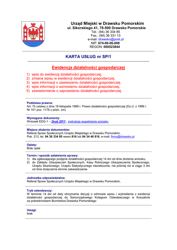 Urząd Miejski w Drawsku Pomorskim ul. Sikorskiego 41, 78-500 Drawsko Pomorskie Tel.: (94) 36 334 85 Fax.: (94) 36 331 13 e-mail :[email protected] NIP: 674-00-06-008 REGON: 000523844 ____________________________________________________________________________________________________ KARTA USŁUG nr SP/1 ____________________________________________________________________________________________ Ewidencja działalności gospodarczej 1) 2) 3) 4) 5) wpis do ewidencji działalności gospodarczej, zmiana wpisu w ewidencji działalności gospodarczej, wpis informacji o zawieszeniu działalności gospodarczej, wpis informacji o wznowieniu działalności gospodarczej, zawiadomienie o zaprzestaniu działalności gospodarczej. Podstawa prawna: Art. 7b ustawy z dnia 19 listopada 1999 r. Prawo działalności gospodarczej (Dz.U. z 1999 r. Nr 101 poz. 1178 z późn. zm) Wymagane dokumenty: Wniosek EDG-1 – Druk SP/1 , instrukcja wypełniania wniosku Miejsce złożenia dokumentów: Referat Spraw Społecznych Urzędu Miejskiego w Drawsku Pomorskim, Pok. 213, tel. 94 36 334 85 wewn.816 lub 94 34 46 816, e-mail: [email protected] Opłaty: Brak opłat Termin i sposób załatwienia sprawy: 1) dla zgłaszającego podjęcie działalności gospodarczej 14 dni od dnia złożenia wniosku, 2) do Zakładu Ubezpieczeń Społecznych, Kasy Rolniczego Ubezpieczenia Społecznego, Urzędu Skarbowego, Urzędu Statystycznego niezwłocznie, nie później niż w ciągu 3 dni od dnia doręczenia stronie zaświadczenia. Jednostka odpowiedzialna: Referat Spraw Społecznych Urzędu Miejskiego w Drawsku Pomorskim, Tryb odwoławczy: W terminie 14 dni od daty otrzymania decyzji o odmowie wpisu i wykreślenia z ewidencji działalności gospodarczej do Samorządowego Kolegium Odwoławczego w Koszalinie za pośrednictwem Burmistrza Drawska Pomorskiego Uwagi: brak