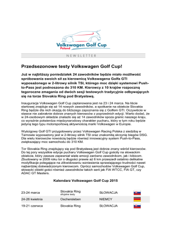 Przedsezonowe testy Volkswagen Golf Cup! Już w najbliższy poniedziałek 24 zawodników będzie miało możliwość spróbowania swoich sił za kierownicą Volkswagena Golfa GTI wyposażonego w 2-litrowy silnik TSI, którego moc dzięki systemowi Pushto-Pass jest podnoszona do 310 KM. Kierowcy z 10 krajów rozpoczną tegoroczne zmagania od dwóch sesji testowych tradycyjnie odbywających się na torze Slovakia Ring pod Bratysławą. Inauguracja Volkswagen Golf Cup zaplanowana jest na 23 i 24 marca. Na liście startowej znajduje się aż 14 nowych zawodników, a spotkanie na obiekcie Slovakia Ring będzie dla nich okazją do bliższego zapoznania się z Golfem GTI. Oczywiście w stawce nie zabraknie dobrze znanych kierowców z poprzednich edycji. Warto dodać, że w 24-osobowym składzie znalazło się aż 14 zawodników spoza granic naszego kraju, co wyraźnie potwierdza międzynarodowy charakter pucharu, który w tym roku będzie jedyną tego typu motorsportową aktywnością marki Volkswagen w Europie. Wyścigowy Golf GTI przygotowany przez Volkswagen Racing Polska z siedzibą w Tarnowie wyposażony jest w 2-litrowy silnik TSI oraz znakomitą skrzynię biegów DSG. Dla wielu kierowców nowością będzie również innowacyjny system Push-to-Pass, zwiększający moc samochodu do 310 KM. Tor Slovakia Ring znajdujący się pod Bratysławą jest dobrze znany wśród kierowców. Do tej pory wszystkie edycje pucharu Volkswagen Golf Cup gościły na słowackim obiekcie, który zawsze zapewniał wiele emocji zarówno zawodnikom, jak i kibicom. Zbudowany w 2009 roku tor o długości prawie aż 6 km przeszedł ostatnio delikatne modyfikacje polegające na zlikwidowaniu wzniesienia sprawiającego trudności nawet najbardziej doświadczonym kierowcom. Oprócz samochodów Volkswagen Golf Cup, słowacki obiekt gości również zawodników takich serii jak FIA WTCC, FIA GT, czy ADAC GT Masters. Kalendarz Volkswagen Golf Cup 2015 23-24 marca Slovakia Ring 24-26 kwietnia Oschersleben NIEMCY 19-21 czerwca Slovakia Ring SŁOWACJA oficjalne testy SŁOWACJA 03-05 lipca Lausitzring NIEMCY 28-30 sierpnia Sachsenring NIEMCY 18-20 września Automotodrom Brno CZECHY 02-03 października Tor Poznań POLSKA Lista startowa w sezonie 2015 1. ARRIOLA Sebastian GWATEMALA 2. ARTEMYEV Alexandr KAZACHSTAN 3. DUDEK Jerzy POLSKA 4. EGOROV Artur ROSJA 5. FAHNAUER Manuel NIEMCY 6. FLUCH Marcus SZWECJA 7. GADOMSKI Michał POLSKA 8. GIES Andre NIEMCY 9. HOFFMANN Pascal NIEMCY 10. IBRAGIMOV Ilshat ROSJA 11. JAROS Marcin POLSKA 12. KOTARBA-MAJKUTEWICZ Dominik POLSKA 13. KRAMER Alfred AUSTRIA 14. KRUGER Jeffrey RPA 15. LARSSON Simon NIEMCY 16. METZNER Kevin NIEMCY 17. MUHONEN Simo FINLANDIA 18. PALUSKO Bartosz POLSKA 19. PARYS Piotr POLSKA 20. PEREIRA Dylan LUKSEMBURG 21. RDEST Gosia POLSKA 22. RZEPECKI Adam POLSKA 23. STRZESAK Patryk POLSKA 24. SZCZEŚNIAK Jędrzej POLSKA Nowy logotyp pucharu Volkswagen Golf Cup: Do pobrania plik JPG RGB i plik EPS CMYK Kontakt dla mediów: Koordynacja PR (WRC Public Relations): Wojciech Garbarz, tel. 606 221 000, e-mail: [email protected]