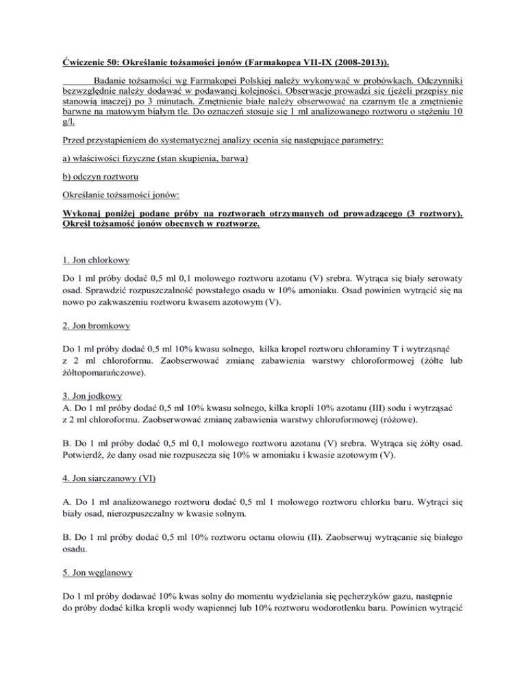 Ćwiczenie 50: Określanie tożsamości jonów (Farmakopea VII-IX (2008-2013)). Badanie tożsamości wg Farmakopei Polskiej należy wykonywać w probówkach. Odczynniki bezwzględnie należy dodawać w podawanej kolejności. Obserwacje prowadzi się (jeżeli przepisy nie stanowią inaczej) po 3 minutach. Zmętnienie białe należy obserwować na czarnym tle a zmętnienie barwne na matowym białym tle. Do oznaczeń stosuje się 1 ml analizowanego roztworu o stężeniu 10 g/l. Przed przystąpieniem do systematycznej analizy ocenia się następujące parametry: a) właściwości fizyczne (stan skupienia, barwa) b) odczyn roztworu Określanie tożsamości jonów: Wykonaj poniżej podane próby na roztworach otrzymanych od prowadzącego (3 roztwory). Określ tożsamość jonów obecnych w roztworze. 1. Jon chlorkowy Do 1 ml próby dodać 0,5 ml 0,1 molowego roztworu azotanu (V) srebra. Wytrąca się biały serowaty osad. Sprawdzić rozpuszczalność powstałego osadu w 10% amoniaku. Osad powinien wytrącić się na nowo po zakwaszeniu roztworu kwasem azotowym (V). 2. Jon bromkowy Do 1 ml próby dodać 0,5 ml 10% kwasu solnego, kilka kropel roztworu chloraminy T i wytrząsnąć z 2 ml chloroformu. Zaobserwować zmianę zabawienia warstwy chloroformowej (żółte lub żółtopomarańczowe). 3. Jon jodkowy A. Do 1 ml próby dodać 0,5 ml 10% kwasu solnego, kilka kropli 10% azotanu (III) sodu i wytrząsać z 2 ml chloroformu. Zaobserwować zmianę zabawienia warstwy chloroformowej (różowe). B. Do 1 ml próby dodać 0,5 ml 0,1 molowego roztworu azotanu (V) srebra. Wytrąca się żółty osad. Potwierdź, że dany osad nie rozpuszcza się 10% w amoniaku i kwasie azotowym (V). 4. Jon siarczanowy (VI) A. Do 1 ml analizowanego roztworu dodać 0,5 ml 1 molowego roztworu chlorku baru. Wytrąci się biały osad, nierozpuszczalny w kwasie solnym. B. Do 1 ml próby dodać 0,5 ml 10% roztworu octanu ołowiu (II). Zaobserwuj wytrącanie się białego osadu. 5. Jon węglanowy Do 1 ml próby dodawać 10% kwas solny do momentu wydzielania się pęcherzyków gazu, następnie do próby dodać kilka kropli wody wapiennej lub 10% roztworu wodorotlenku baru. Powinien wytrącić się biały osad. 6. Jon azotanowy (V) 1. Do 1 ml próby dodać 3 ml świeżo przyrządzonego 2% roztworu siarczanu żelaza (II), następnie podwarstwić (dodać i nie mieszać) 3 ml stężonego kwasu siarkowego (IV). Na granicy warstw powstanie ciemnobrunatny pierścień. 7. Jon octanowy A. Do 1 ml próby dodać 3 krople 10% roztworu chlorku żelaza (III) – powstaje ciemnoczerwone zabarwienie. B. Do 1 ml próby dodać równą objętość stężonego kwasu siarkowego (VI), 1 ml etanolu (metanolu) i ogrzać – z roztworu wydziela się zapach octanu etylu. C. 1 ml próby ogrzewać z 0,5 ml stężonego kwasu siarkowego (VI) – wydziela się zapach kwasu octowego. 8. Jon fosforanowy A. Do 1 ml próby dodać kilka kropli azotanu (V) srebra – powstaje żółty osad rozpuszczalny w kwasie azotowym (V) i amoniaku. B. Do 1 ml próby dodać 1 – 2 krople stężonego kwasu azotowego (V), kilka kropli molibdenianu amonowego i ogrzać – powstaje żółty osad. 9. Jon sodowy Do 1 ml próby dodać 1 ml roztworu heksahydroksoantymonianu potasowego – powstaje biały, krystaliczny osad. 10. Jony potasu Do 1 ml próby dodać 0,5 ml przygotowanego na świeżo roztworu heksanitrokobaltanu (III) sodu o stężeniu 2% – powstaje żółty osad. 11. Jon wapniowy Do 1 ml próby dodać 0,5 ml 4% roztworu szczawianu amonowego; powstaje biały, krystaliczny osad, rozpuszczalny w kwasie solnym. 12. Jon żelaza (II) A. Do 1 ml próby dodać 0,5 ml 15% roztworu wodorotlenku sodu – powstaje zielony osad, przyjmujący szybko zabarwienie brunatne. B. Do 1 ml próby dodać 0,5 ml 10% kwasu solnego i trzy krople 1% roztworu heksacjanożelazianu (III) potasu – powstaje ciemnoniebieski osad. 13. Jony cynku A. Do 1 ml próby dodać 0,5 ml AKT w środowisku zasadowym i 0,5 ml 2M kwasu octowego – powstaje biały osad nierozpuszczalny w kwasie octowym. B. Do 1 ml próby dodać 0,5 ml kwasu solnego (20%) i 0,5 ml roztworu heksacyjanożelazianu (II) potasu – powstaje biały osad zmieniający barwę na żółtobrunatną, nierozpuszczalny w kwasie solnym. Ćwiczenie 51: Określanie tożsamości jonów w preparatach farmaceutycznych (Farmakopea VII-IX (2008-2013)). Wykonaj analizę podanych prepartów farmaceutycznych podobnie jak w podanym przykładzie: Kalium iodatum – stosowany w płynach ifuzyjnych Postać i właściwości: bezbarwne kryształy lub biały proszek, bez zapachu pH 10% roztworu 5,0 – 7,0 Rozpuszczalność: substancja bardzo łatwo rozpuszcza się w wodzie Określenie tożsamości A. Substancja daje reakcje na jon potasowy – żółty osad B. Substancja daje reakcje na jon jodkowy - różowe zabarwienie warstwy chloroformowej Sól Karlsbardzka - Sal Carolinum artificiale Postać i właściwości: Określenie tożsamości jonów: Sól Emska – Sal Ems artificiale Postać i właściwości: Określenie tożsamości jonów: Sól Vichy – Sal Vichy artificiale Postać i właściwości: Określenie tożsamości jonów: Zincum sulfuricum - preparat ściągający Postać i właściwości: Określenie tożsamości: A. 0,125 g substancji rozpuścić w 2,5 ml wody, dodać 3 krople 15% roztworu wodorotlenku sodowego; powstaje biały, bezpostaciowy osad, rozpuszczalny w nadmiarze odczynnika; następnie dodać 3 krople roztworu siarczku sodowego – powstaje biały osad. B. Potwierdzenie tożsamości jonów Magesium sulfuricum – preparat przeczyszczający Postać i właściwości: Określenie tożsamości: A. 0,05 g substancji rozpuścić w 2,5 ml wody, dodać 1,5 ml 10% amoniaku - powstaje biały osad. Następnie dodawać 10% roztwór chlorku amonowego do rozpuszczenia osadu i dodać 1 ml 10% roztworu wodorofosforanu sodowego; powstaje biały osad. B. Potwierdzenie tożsamości jonów Magnesium oxydatum – preparat alkalizujący sok żołądkowy Postać 