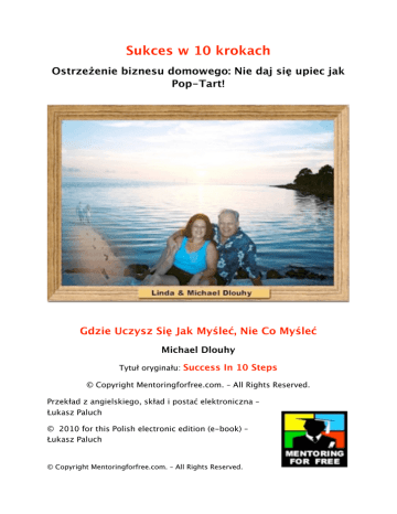 Sukces w 10 krokach Ostrzeżenie biznesu domowego: Nie daj się upiec jak Pop-Tart! Gdzie Uczysz Się Jak Myśleć, Nie Co Myśleć Michael Dlouhy Tytuł oryginału: Success In 10 Steps © Copyright Mentoringforfree.com. – All Rights Reserved. Przekład z angielskiego, skład i postać elektroniczna – Łukasz Paluch © 2010 for this Polish electronic edition (e-book) – Łukasz Paluch © Copyright Mentoringforfree.com. – All Rights Reserved. Mentoringforfree.com, Inc. Michael Dlouhy Dave Cones Richard Dennis Życząc ci dużo sukcesu i świetnego wykorzystania tego e-booka! Dużo pracy zostało włożone w tę książkę; jej wartość jest ponad miarę. Marcel Schmidt 870-275-4322 [email protected] http://bigmlmlies.colortosuccess.com http://bigmlmlies.mentoringforfree.com http://bigmlmlies.powerfulnetworkingsecrets.com © Copyright Mentoringforfree.com. – All Rights Reserved. Spis treści Wprowadzenie 2 #1 Bottom-Fishing dla Heavy Hitters 2 #2 „Spójrz mi głęboko, głęboko, głęboko w oczy!” 2 #3 Wielka Niespodzianka badawcza. 2 # 4 „Padnij na ziemię i ubrudź się” w MLM 2 #5 Zrób jedyną rzecz, która ma znaczenie! 2 #6 Perspektywy są jak pudełko czekoladek 2 #7 Twój biznes MLM od zupy do orzechów 2 #8 Bogate złoże! Zdobądź i trzymaj swoich ludzi. 2 #9 Jak ocenić okazję 2 #10 Skup się dopóki twoje oczy nie zbiegną się w jednym punkcie 2 © Copyright Mentoringforfree.com. – All Rights Reserved. Wprowadzenie Żaden dobry uczynek nie uchodzi bezkarnie: Część 1 Posłuchaj uważnie. Zdaję sobie sprawę dobrze, że twoje zamiary były mężne: dać swojej rodzinie wszystkie te rzeczy, których sam nigdy nie miałeś, spędzić więcej czasu przeznaczonego dla rodziny z nimi, pomóc innym tak jak i sobie wzrastać i prosperować. I pamiętasz co stało się dalej? Okłamano cię. Wywierano na tobie nacisk. Ludzie z ciężką ręką (tzw. Heavy Hitters) wykorzystali cię byś odbijał praktykę. Zostałeś wrzucony w nawóz, nieprzyuczony do zawodu, nieprzygotowany. Twój rachunek bankowy był pusty. Limity na twoich kartach kredytowych zostały przekroczone. Przyjaciele i krewni oddzielali twoje rozmowy telefoniczne. Wtedy spojrzałeś w lustro i nazwałeś siebie „przegranym”. Wiem, wiem. Wszystko to zaczęło się ponieważ chcesz tego samego, czego ja chciałem. Chcesz być szefem dla siebie samego, nie odpowiadając przed nikim… i osiągnąć spokojne życie robiąc to. Chcesz pojechać gdziekolwiek zapragniesz, kiedy tylko zechcesz. Chcesz wydać 200 dolarów na obiad w restauracji bez mrugnięcia okiem. Chcesz móc poświęcić ten cenny czas dla tych, których kochasz właśnie teraz. Chcesz pieniędzy i wolności by wziąć dzień wolnego lub dwa tygodnie i polecieć na jakąś odległą wyspę, bo masz taki kaprys. Chcesz pracować i utrzymywać kontakty towarzyskie z ludźmi, których lubisz i podziwiasz, którzy podzielają twój pogląd na życie i na twoje cele. Chcesz samozadowolenia z osiągania zamierzonych przez siebie celów oraz samospełnienia pomagając innym osiągnąć ich cele. Chcesz finansowej niezależności. Nie chcesz więcej słyszeć odmów. Nie chcesz musieć niczego nikomu sprzedawać. I na pewno nie chcesz kolejnego MLM. © Copyright Mentoringforfree.com. – All Rights Reserved. Słuszna rzecz. A niech to licho, brzmi dokładnie jakbym to był ja. Więc oto jestem. Nie mam innego wyboru, jak tylko napisać tę książkę. Naprawdę, nie mam nad tym kontroli. O tym dlaczego przeczytasz w rozdziale drugim. Ale oto nad czym mam kontrolę: ta książka jest darmowa. Nie wymienia się tu żadnej firmy ani nie promuje się jej. Nie wymienia się tu żadnej okazji ani nie promuje się jej. W Internecie znajdziesz całe mnóstwo e-booków pełnych linków sponsorskich. Zaufaj im na własne ryzyko ponieważ czerpią oni korzyści na każdej rekomendacji jakiej uda im się dokonać. Moim celem jest podzielić się tym, czego nauczyłem się przez niemalże 30 lat działań w marketingu sieciowym i przedstawić ci plan 10-ciu kroków do sukcesu, który możesz wykorzystać przy każdej okazji związanej z marketingiem sieciowym. Plan nie jest łatwy. Ale jest prosty. To nie jest coś w stylu: „Wykonam całą pracę za ciebie.” To działa tylko wtedy, gdy ty to wykonasz. To nie jest coś w stylu: „Stań się natychmiast bogaty.” Ale możesz stworzyć dożywotni dochód pasywny. Zapytasz co ja będę z tego miał? Odpowiedź na to pytanie znajduje się w rozdziale drugim i piątym. Nie martw się. Pomagając tobie pomagam sobie. To część tego co chcę oddać tej wspaniałej branży. Życzę ci absolutnie wszystkiego co najlepsze i mam nadzieję, że umiejętnie wykorzystasz tę informacje. To może odmienić twoje życie. Jesteś gotowy? Zatem czytaj dalej. Żaden dobry uczynek nie uchodzi bezkarnie, część 2. Ludzie pytają mnie: „Twój e-book jest świetny. Dlaczego rozdajesz go za darmo?” © Copyright Mentoringforfree.com. – All Rights Reserved. „Twój trening przez telefon jest świetny. Dlaczego jest za darmo?” „Twoje CD pod tytułem „Kolory” jest świetne. Dlaczego jest takie tanie?” „Dlaczego pomagasz mi za darmo skoro nie jestem w tej samej firmie co ty?” … i tuzin innych różnych. W początkach lat 90-tych, dołączyłem do ponad 100 różnych okazji MLM. Śledziłem, katalogowałem, analizowałem i sprawdzałem wszystko co robili: produkty, plany marketingowe, marketing, wsparcie dla dystrybutorów, zyskowność, itp. Paskudne rezultaty Jestem lubiącym się bawić, bezproblemowym facetem. Ale moje zęby i palce zacisnęły się tworząc pięści wściekłości. Byłem zdziwiony przez to jak wiele firm i „Heavy Hitters” osiągają olbrzymie korzyści nie na sprzedaży produktów, lecz zamiast tego na sprzedaży ogromu bezwartościowych materiałów marketingowych dystrybutorom, którzy ufają i w nie wierzą. Wściekam się na samą myśl o tym. Właśnie dlatego znajdz