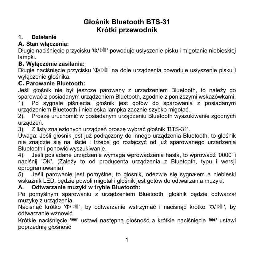 Głośnik Bluetooth BTS-31 Krótki przewodnik