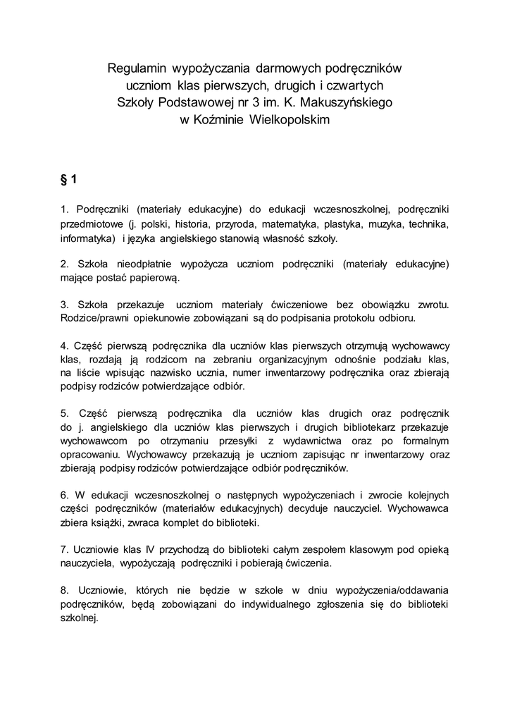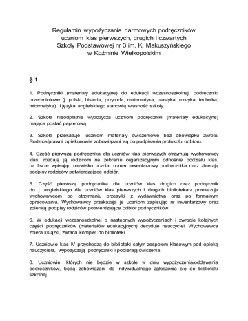 Regulamin wypożyczania darmowych podręczników uczniom klas pierwszych, drugich i czwartych Szkoły Podstawowej nr 3 im. K. Makuszyńskiego w Koźminie Wielkopolskim §1 1. Podręczniki (materiały edukacyjne) do edukacji wczesnoszkolnej, podręczniki przedmiotowe (j. polski, historia, przyroda, matematyka, plastyka, muzyka, technika, informatyka) i języka angielskiego stanowią własność szkoły. 2. Szkoła nieodpłatnie wypożycza uczniom podręczniki (materiały edukacyjne) mające postać papierową. 3. Szkoła przekazuje uczniom materiały ćwiczeniowe bez obowiązku zwrotu. Rodzice/prawni opiekunowie zobowiązani są do podpisania protokołu odbioru. 4. Część pierwszą podręcznika dla uczniów klas pierwszych otrzymują wychowawcy klas, rozdają ją rodzicom na zebraniu organizacyjnym odnośnie podziału klas, na liście wpisując nazwisko ucznia, numer inwentarzowy podręcznika oraz zbierają podpisy rodziców potwierdzające odbiór. 5. Część pierwszą podręcznika dla uczniów klas drugich oraz podręcznik do j. angielskiego dla uczniów klas pierwszych i drugich bibliotekarz przekazuje wychowawcom po otrzymaniu przesyłki z wydawnictwa oraz po formalnym opracowaniu. Wychowawcy przekazują je uczniom zapisując nr inwentarzowy oraz zbierają podpisy rodziców potwierdzające odbiór podręczników. 6. W edukacji wczesnoszkolnej o następnych wypożyczeniach i zwrocie kolejnych części podręczników (materiałów edukacyjnych) decyduje nauczyciel. Wychowawca zbiera książki, zwraca komplet do biblioteki. 7. Uczniowie klas IV przychodzą do biblioteki całym zespołem klasowym pod opieką nauczyciela, wypożyczają podręczniki i pobierają ćwiczenia. 8. Uczniowie, których nie będzie w szkole w dniu wypożyczenia/oddawania podręczników, będą zobowiązani do indywidualnego zgłoszenia się do biblioteki szkolnej. 9. W zależności od potrzeb uczeń powinien mieć zapewnioną możliwość korzystania z podręcznika zarówno w szkole jak i w domu. 10. Podręczniki wypożycza się na okres nie dłuższy niż 10 miesięcy. Należy je zwrócić tydzień przed zakończeniem roku szkolnego. §2 1. Uczeń jest zobowiązany do szanowania podręczników będących własnością szkoły. 2. Uczeń zobowiązany jest do przechowywania podręczników w okładce, chronienia go przed zniszczeniem lub utratą. 3. W podręczniku nie wolno niczego pisać ani zaznaczać. 4. Na bieżąco należy dokonywać drobnych napraw lub ewentualnej wymiany okładki. 5. Za uszkodzenie uznaje się: zalanie książki napojem, podarcie kartki, wyrwanie kartki, rozerwanie książki, wydarcie z obwoluty, popisanie książki lub brak dodatkowego wyposażenia (mapa, płyta). Dołączona do podręcznika lub materiałów edukacyjnych płyta CD stanowi integralną część podręczników lub materiałów edukacyjnych i należy ją zwrócić wraz podręcznikiem lub materiałem edukacyjnym. Zagubienie płyty CD skutkuje koniecznością zwrotu kosztów całego podręcznika lub materiałów edukacyjnych. §3 1. Za szkody wynikłe z zagubienia lub zniszczenia podręcznika odpowiada rodzic/prawny opiekun. 2. Uczeń zalegający ze zwrotem podręczników nie może wypożyczyć następnej części. 3. Niezwrócenie wypożyczonych jest równoznaczne z ich zagubieniem. podręczników w określonym terminie 4. Rodzic/prawny opiekun, którego dziecko zgubiło lub uszkodziło podręcznik, uniemożliwiając jego dalsze wypożyczenie zobowiązany jest do poniesienia kosztów zakupu nowego podręcznika (według obowiązującego cennika w momencie rozliczenia). 5. W przypadku, gdy uczeń odchodzi ze szkoły w trakcie trwania roku szkolnego, zobowiązany jest do oddania do biblioteki szkolnej wszystkich wypożyczonych podręczników (materiałów edukacyjnych). §4 1. Rodzic/prawny opiekun zostaje zapoznany z regulaminem, zobowiązuje się do przestrzegania niniejszych procedur, co potwierdza podpisem. 2. Za zebranie od rodziców podpisanych oświadczeń odpowiedzialny jest wychowawca klasy, który podpisane przez rodziców oświadczenia przekazuje bibliotece szkolnej.