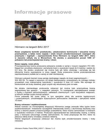 Hörmann na targach BAU 2017 Nowe urządzenia techniki przeładunku, udoskonalone technicznie i wizualnie bramy przemysłowe, a także nowe napędy i wiele innych zmodernizowanych rozwiązań dla przemysłu i logistyki – zaprezentowała firma Hörmann na targach BAU 2017, które w styczniu odbyły się w Monachium. Na stoisku o powierzchni ponad 1400 m² pokazano też przeciwpożarowe bramy i drzwi. Nowe napędy, nowe piloty Przeciwpożarowa brama przesuwna pokazana została w wersji z nowym napędem ITO 400. Napęd ten umożliwia otwieranie i zamykanie bram o wysokości nawet do 9 metrów i wadze do 2,5 tony. Na stoisku przekonać się można było jak lekko otwierają i zamykają się tak olbrzymie bramy wyposażone w nowy napęd. Duża przesuwna brama przeciwpożarowa zaprezentowana została też w wersji ze stali nierdzewnej. Hörmann pokazał również nową wersję niedrogiego napędu do bram segmentowych – WA 300 S4. To napęd o szerszym niż dotąd zastosowaniu, przewidziany do różnego rodzaju prowadzeń oraz maksymalnej szerokości i wysokości 6 oraz 4,5 metra. Nie wymaga on fotokomórek ani kraty świetlnej, gdyż czujnik siły wbudowany jest na wale. Na stoisku niemieckiego producenta zobaczyć też można było przemysłową bramę segmentową bez sprężyn - z napędem osiowym. To rozwiązanie zaprojektowane zostało z myślą o myjniach samochodowych, zakładach chemicznych i tych wszystkich miejscach, w których istnieje ryzyko korozji sprężyn. Firma pokazała też nowe piloty, w tym specjalne piloty dla centrów logistycznych i przemysłowych, umożliwiające dyspozytorom jednoczesne otwieranie i zamykanie nawet 15 bram. Bramy rolowane i szybkorolowane Wśród nowości na monachijskiej ekspozycji Hörmanna uwagę zwracało kilka typów bram szybkorolowanych. Inwestorów szczególnie interesowały bramy z aluminiową obudową oraz bramy z dwoma pasami przezroczystego przeszklenia, które można zamontować w bramach o wysokości minimum 3 metrów. Producent zaprezentował też ciekawostkę: bramę, w której pasy z tworzywa sztucznego zostały zadrukowane. To nowa propozycja dla firm, które na płaszczu takiej bramy chciałyby umieścić reklamę. Wśród targowych propozycji zobaczyć też można było zmodernizowane bramy i kraty rolowane. Hörmann Polska /Tekst PEM_3/2017 / Strona 1 z 3 Segmentowe bramy przemysłowe Segmentowe bramy przemysłowe pokazane zostały wraz z drzwiami bocznymi, które odtąd producent oferować będzie z wyposażeniem przeciwwłamaniowym w klasie RC 2. Zobaczyć też można było bramy z wbudowanymi drzwiami z prawdziwego szkła. Duże zainteresowanie budziła bardzo elegancka, przeszklona na całej powierzchni, zbudowana z aluminiowych profili, brama Vitraplan, którą zaprezentowano w udoskonalonej wersji – z zakończeniami segmentów w kolorze bramy, a także brama segmentowa z podwójną kratą świetlną. Specjalne rozwiązanie dla spedycji paczek W dobie handlu internetowego przyszłością są centra logistyczne, w których taśmociągi z paczkami sterowane są komputerowo, a przesyłki dostarczane wprost np. do paczkomatu. Na stoisku firmy Hörmann obejrzeć można było film o tym, jak działają nowoczesne centra logistyczne. Pokazano też nowe zaprojektowane przez firmę Hörmann rozwiązanie usprawniające spedycję paczek. To specjalne doki z nowym uszczelnieniem BBS o wymiarach zbliżonych do samochodu dostawczego. Podczas załadunku samochód szczelnie okala poduszka uszczelnienia, a paczki z taśmociągu trafiają wprost do sprintera. Niemiecki producent zaprezentował też zintegrowane sterowanie bramą i rampą. Na jego stoisku przekonać się również można było jak działa nowy odbojnik oraz blokada zabezpieczająca przed zbyt szybkim odjazdem samochodu z doku przeładunkowego. Fot. 2 Przeciwpożarowa brama przesuwna pokazana została na targach BAU 2017 w wersji z nowym napędem ITO 400, który umożliwia płynne otwieranie nawet bardzo dużych bram. Hörmann Polska /Tekst PEM_3/2017 / Strona 2 z 3 Fot. 3, 4, 5 Hörmann pokazał w Monachium kilka typów bram szybkorolowanych, w tym nowe bramy z podwójnym pasem przeszklenia, także z możliwością wykorzystania tego miejsca na reklamę. Fot. 6 Segmentowa brama Vitraplan prezentowała się w nowej, jeszcze bardziej eleganckiej wersji. Fot. 7 i 8 Prezes firmy Hörmann Polska sp. z o.o. omówił zalety drzwi przejściowych z prawdziwego szkła w bramie segmentowej; zademonstrował też jak działa blokada zabezpieczająca przed zbyt szybkim odjazdem samochodu z doku przeładunkowego. Hörmann Polska /Tekst PEM_3/2017 / Strona 3 z 3