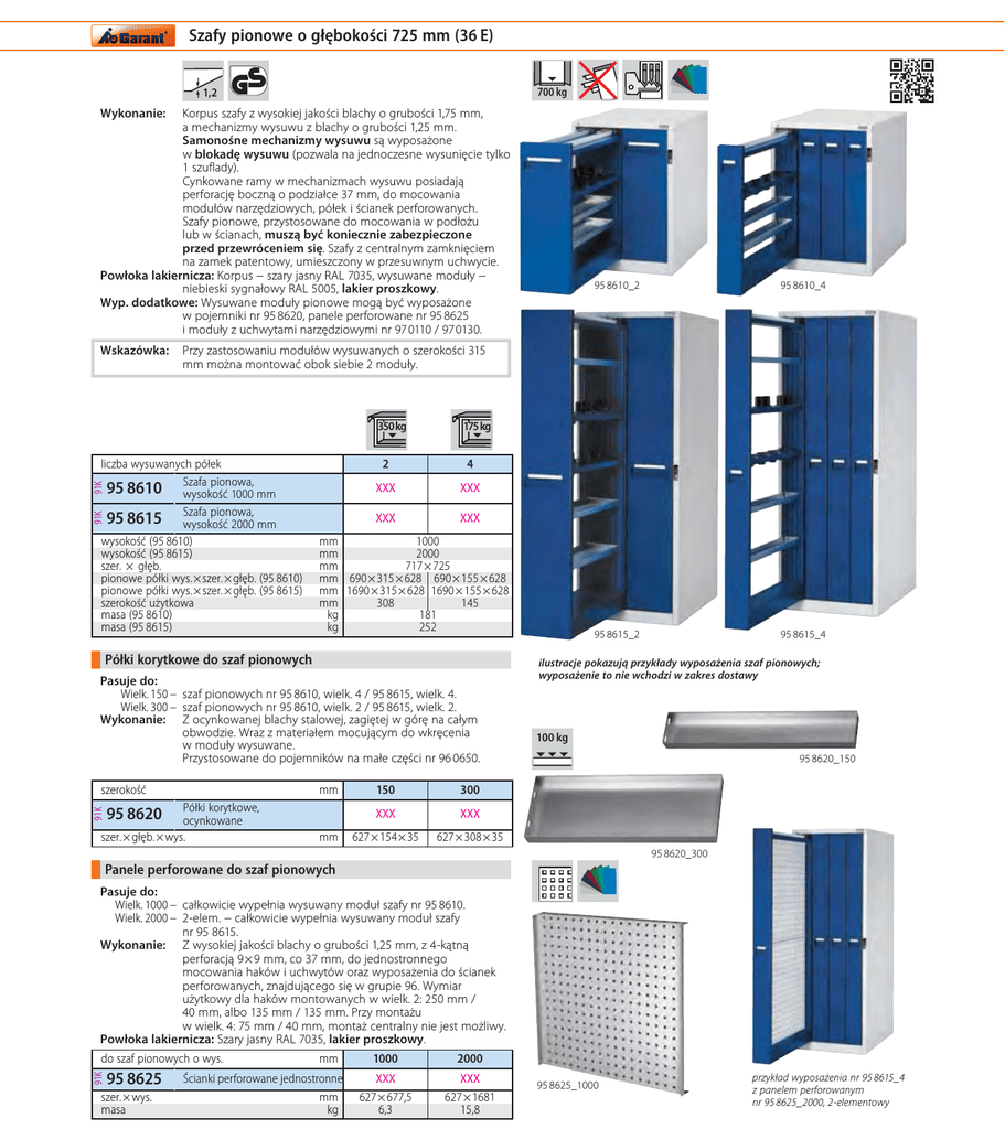 Szafy pionowe o głębokości 725 mm (36 E) 700 kg 1,2 Wykonanie: Korpus szafy z wysokiej jakości blachy o grubości 1,75 mm, a mechanizmy wysuwu z blachy o grubości 1,25 mm. Samonośne mechanizmy wysuwu są wyposażone w blokadę wysuwu (pozwala na jednoczesne wysunięcie tylko 1 szuflady). Cynkowane ramy w mechanizmach wysuwu posiadają perforację boczną o podziałce 37 mm, do mocowania modułów narzędziowych, półek i ścianek perforowanych. Szafy pionowe, przystosowane do mocowania w podłożu lub w ścianach, muszą być koniecznie zabezpieczone przed przewróceniem się. Szafy z centralnym zamknięciem na zamek patentowy, umieszczony w przesuwnym uchwycie. Powłoka lakiernicza: Korpus − szary jasny RAL 7035, wysuwane moduły − niebieski sygnałowy RAL 5005, lakier proszkowy. Wyp. dodatkowe: Wysuwane moduły pionowe mogą być wyposażone w pojemniki nr 95 8620, panele perforowane nr 95 8625 i moduły z uchwytami narzędziowymi nr 970110 / 970130. Wskazówka: 95 8610_2 95 8610_4 95 8615_2 95 8615_4 Przy zastosowaniu modułów wysuwanych o szerokości 315 mm można montować obok siebie 2 moduły. 350 kg 91K 91K liczba wysuwanych półek pionowa, 95 8610 Szafa wysokość 1000 mm pionowa, 95 8615 Szafa wysokość 2000 mm wysokość (95 8610) wysokość (95 8615) szer. × głęb. pionowe półki wys.×szer.×głęb. (95 8610) pionowe półki wys.×szer.×głęb. (95 8615) szerokość użytkowa masa (95 8610) masa (95 8615) 175 kg 2 4 XXX XXX XXX XXX mm 1000 mm 2000 mm 717×725 mm 690×315×628 690×155×628 mm 1690×315×628 1690×155×628 mm 308 145 kg 181 kg 252 Półki korytkowe do szaf pionowych Pasuje do: Wielk. 150 – szaf pionowych nr 95 8610, wielk. 4 / 95 8615, wielk. 4. Wielk. 300 – szaf pionowych nr 95 8610, wielk. 2 / 95 8615, wielk. 2. Wykonanie: Z ocynkowanej blachy stalowej, zagiętej w górę na całym obwodzie. Wraz z materiałem mocującym do wkręcenia w moduły wysuwane. Przystosowane do pojemników na małe części nr 96 0650. mm 150 korytkowe, 95 8620 Półki ocynkowane szer.×głęb.×wys. XXX XXX mm 627×154×35 627×308×35 91K szerokość ilustracje pokazują przykłady wyposażenia szaf pionowych; wyposażenie to nie wchodzi w zakres dostawy 100 kg 95 8620_150 300 95 8620_300 Panele perforowane do szaf pionowych Pasuje do: Wielk. 1000 – całkowicie wypełnia wysuwany moduł szafy nr 95 8610. Wielk. 2000 – 2-elem. − całkowicie wypełnia wysuwany moduł szafy nr 95 8615. Wykonanie: Z wysokiej jakości blachy o grubości 1,25 mm, z 4-kątną perforacją 9×9 mm, co 37 mm, do jednostronnego mocowania haków i uchwytów oraz wyposażenia do ścianek perforowanych, znajdującego się w grupie 96. Wymiar użytkowy dla haków montowanych w wielk. 2: 250 mm / 40 mm, albo 135 mm / 135 mm. Przy montażu w wielk. 4: 75 mm / 40 mm, montaż centralny nie jest możliwy. Powłoka lakiernicza: Szary jasny RAL 7035, lakier proszkowy. 91K do szaf pionowych o wys. 95 8625 szer.×wys. masa mm Ścianki perforowane jednostronne mm kg 1000 2000 XXX 627×677,5 6,3 XXX 627×1681 15,8 95 8625_1000 przykład wyposażenia nr 95 8615_4 z panelem perforowanym nr 95 8625_2000, 2-elementowy