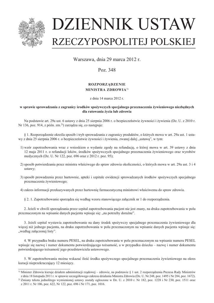 DZIENNIK USTAW RZECZYPOSPOLITEJ POLSKIEJ Warszawa, dnia 29 marca 2012 r. Poz. 348 ROZPORZĄDZENIE MINISTRA ZDROWIA 1) z dnia 14 marca 2012 r. w sprawie sprowadzania z zagranicy środków spożywczych specjalnego przeznaczenia żywieniowego niezbędnych dla ratowania życia lub zdrowia Na podstawie art. 29a ust. 6 ustawy z dnia 25 sierpnia 2006 r. o bezpieczeństwie żywności i żywienia (Dz. U. z 2010 r. Nr 136, poz. 914, z późn. zm.2)) zarządza się, co następuje: § 1. Rozporządzenie określa sposób i tryb sprowadzania z zagranicy produktów, o których mowa w art. 29a ust. 1 ustawy z dnia 25 sierpnia 2006 r. o bezpieczeństwie żywności i żywienia, zwanej dalej „ustawą”, w tym: 1) wzór zapotrzebowania wraz z wnioskiem o wydanie zgody na refundację, o której mowa w art. 39 ustawy z dnia 12 maja 2011 r. o refundacji leków, środków spożywczych specjalnego przeznaczenia żywieniowego oraz wyrobów medycznych (Dz. U. Nr 122, poz. 696 oraz z 2012 r. poz. 95); 2) sposób potwierdzania przez ministra właściwego do spraw zdrowia okoliczności, o których mowa w art. 29a ust. 3 i 4 ustawy; 3) sposób prowadzenia przez hurtownie, apteki i szpitale ewidencji sprowadzanych środków spożywczych specjalnego przeznaczenia żywieniowego; 4) zakres informacji przekazywanych przez hurtownię farmaceutyczną ministrowi właściwemu do spraw zdrowia. § 2. 1. Zapotrzebowanie sporządza się według wzoru stanowiącego załącznik nr 1 do rozporządzenia. 2. Jeżeli w chwili sporządzania przez szpital zapotrzebowania pacjent nie jest znany, na druku zapotrzebowania w polu przeznaczonym na wpisanie danych pacjenta wpisuje się: „na potrzeby doraźne”. 3. Jeżeli szpital wystawia zapotrzebowanie na dany środek spożywczy specjalnego przeznaczenia żywieniowego dla więcej niż jednego pacjenta, na druku zapotrzebowania w polu przeznaczonym na wpisanie danych pacjenta wpisuje się: „według załączonej listy”. 4. W przypadku braku numeru PESEL, na druku zapotrzebowania w polu przeznaczonym na wpisanie numeru PESEL wpisuje się nazwę i numer dokumentu potwierdzającego tożsamość, a w przypadku dziecka – nazwę i numer dokumentu potwierdzającego tożsamość jego przedstawiciela ustawowego. 5. W zapotrzebowaniu można wskazać ilość środka spożywczego specjalnego przeznaczenia żywieniowego na okres kuracji nieprzekraczający 12 miesięcy. inister Zdrowia kieruje działem administracji rządowej – zdrowie, na podstawie § 1 ust. 2 rozporządzenia Prezesa Rady Ministrów M z dnia 18 listopada 2011 r. w sprawie szczegółowego zakresu działania Ministra Zdrowia (Dz. U. Nr 248, poz. 1495 i Nr 284, poz. 1672). 2) Zmiany tekstu jednolitego wymienionej ustawy zostały ogłoszone w Dz. U. z 2010 r. Nr 182, poz. 1228 i Nr 230, poz. 1511 oraz z 2011 r. Nr 106, poz. 622, Nr 122, poz. 696 i Nr 171, poz. 1016. 1) Dziennik Ustaw –2– Poz. 348 6. Wniosek o wydanie zgody na refundację, o której mowa w art. 39 ustawy z dnia 12 maja 2011 r. o refundacji leków, środków spożywczych specjalnego przeznaczenia żywieniowego oraz wyrobów medycznych, sporządza się według wzoru stanowiącego załącznik nr 2 do rozporządzenia. § 3. 1. Szpital albo lekarz prowadzący leczenie poza szpitalem, który wystawia zapotrzebowanie, zwany dalej „wystawiającym zapotrzebowanie”, dołącza do zapotrzebowania informację dotyczącą choroby pacjenta. 2. Wystawiający zapotrzebowanie odnotowuje wystawienie zapotrzebowania w dokumentacji medycznej, podając nazwę, postać, dawkę i sposób dawkowania środka spożywczego specjalnego przeznaczenia żywieniowego, okres kuracji z zastosowaniem tego środka oraz uzasadnienie zapotrzebowania. 3. Zapotrzebowanie wystawione przez lekarza prowadzącego leczenie w szpitalu podpisuje również kierownik podmiotu leczniczego prowadzącego szpital lub osoba przez niego upoważniona. 4. Do zapotrzebowania, o którym mowa w § 2 ust. 2, należy dołączyć uzasadnienie: 1) wskazujące, jakiego rodzaju potrzeby doraźne zabezpieczy zapotrzebowanie; 2) dotyczące wnioskowanej ilości środka spożywczego specjalnego przeznaczenia żywieniowego. 5. Do zapotrzebowania, o którym mowa w § 2 ust. 3, należy dołączyć listę zawierającą dane pacjentów, których dotyczy zapotrzebowanie, obejmujące: imię i nazwisko, adres zamieszkania, numer PESEL oraz ilość środka spożywczego specjalnego przeznaczenia żywieniowego przeznaczonego dla danego pacjenta. Przepis § 2 ust. 4 stosuje się odpowiednio. § 4. 1. W celu potwierdzenia zasadności wystawienia zapotrzebowania: 1) szpital, w przypadku gdy jest on wystawiającym zapotrzebowanie, kieruje zapotrzebowanie do konsultanta wojewódzkiego z danej dziedziny medycyny, właściwego ze względu na miejsce siedziby podmiotu prowadzącego szpital, albo konsultanta krajowego z danej dziedziny medycyny; 2) pacjent albo osoba przez niego upoważniona, w przypadku gdy wystawiającym zapotrzebowanie jest lekarz prowadzący leczenie poza szpitalem, kieruje zapotrzebowanie do konsultanta wojewódzkiego z danej dziedziny medycyny, właściwego ze względu na miejsce zamieszkania pacjenta, konsultanta wojewódzkiego z danej dziedziny medycyny, właściwego ze względu na miejsce leczenia pacjenta, albo konsultanta krajowego z danej dziedziny medycyny. 2. Konsultant, o którym mowa w ust. 1, potwierdza zasadność albo nie potwierdza zasadności wystawienia zapotrzebowania, nie później niż w terminie 7 dni od dnia jego otrzymania. 3. Wystawiający zapotrzebowanie albo pacjent kieruje zapotrzebowanie, potwierdzone przez konsultanta, o którym mowa w ust. 1, do ministra właściwego do spraw zdrowia w celu potwierdzenia, że wobec tego środka spożywczego specjalnego przeznaczenia żywieniowego nie zachodzą okoliczności, o których mowa w art. 29a ust. 3 i 4 ustawy, nie później niż w terminie 60 dni od dnia jego wystawienia, pod rygorem utraty ważności zapotrzebowania. 4. Zapotrzebowanie może być prz