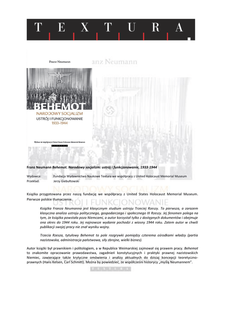 Franz Neumann Behemot. Narodowy socjalizm: ustrój i funkcjonowanie, 1933˗1944 Wydawca: Przekład: Fundacja Wydawnictwo Naukowe Textura we współpracy z United Holocaust Memorial Museum Jerzy Giebułtowski Książka przygotowana przez naszą fundację we współpracy z United States Holocaust Memorial Museum. Pierwsze polskie tłumaczenie. Książka Franza Neumanna jest klasycznym studium ustroju Trzeciej Rzeszy. To pierwsza, a zarazem klasyczna analiza ustroju politycznego, gospodarczego i społecznego III Rzeszy. Jej fenomen polega na tym, że książka powstała poza Niemcami, a autor korzystał tylko z dostępnych dokumentów i obejmuje ona okres do 1944 roku. Jej najnowsze wydanie pochodzi z wiosny 1944 roku. Zatem autor w chwili publikacji swojej pracy nie znał wyniku wojny. Trzecia Rzesza, tytułowy Behemot to pole rozgrywki pomiędzy czterema ośrodkami władzy (partia nazistowska, administracja państwowa, siły zbrojne, wielki biznes). Autor książki był prawnikiem i politologiem, a w Republice Weimarskiej zajmował się prawem pracy. Behemot to znakomite opracowanie prawodawstwa, zagadnień konstytucyjnych i praktyki prawnej nazistowskich Niemiec, zawierające także krytyczne omówienia i analizy aktualnych do dzisiaj koncepcji teoretycznoprawnych (Hans Kelsen, Carl Schmitt). Można by powiedzieć, że współcześni historycy „myślą Neumannem”. Ze wstępu Petera Hayesa: Bezpośrednio po wojnie, gdy Neumann był członkiem zespołu prokuratorskiego przygotowującego procesy głównych zbrodniarzy wojennych w Norymberdze, Behemot wywarł wpływ zarówno na koncepcję amerykańskiej części aktu oskarżenia, jak i na sposób uporządkowania dokumentów procesowych. „Spisek” w celu popełnienia zbrodni przeciw pokojowi i przeciw ludzkości. (…) W 1948 r. Franz Neumann rozpoczął pracę na Uniwersytecie Columbia w Nowym Jorku, gdzie spotkał młodego studenta Raula Hilberga, na którym ogromne wrażenie zrobił fakt, iż Behemot skupiał się na machinie władzy nazistowskiej i sposobach, w jakie istniejące wcześniej struktury oddały swoje zdolności i doświadczenie służbie zbrodni. Po ukończeniu pracy magisterskiej, której promotorem był Neumann, opisującej rolę administracji niemieckiej w eksterminacji Żydów europejskich, Hilberg poprosił go, by został też promotorem jego rozprawy doktorskiej, która miała być jeszcze obszerniejszym studium, obejmującym partię nazistowską, biznes oraz siły zbrojne. Profesor Neumann wyraził zgodę, przestrzegając, że podjęcie tego tematu oznacza zawodowe samobójstwo, nie ma bowiem zbyt wielu zainteresowanych tą kwestią. Neumann zginął w wypadku samochodowym w 1954 r., rok przed zakończeniem przez Hilberga pracy nad doktoratem, nigdy więc nie dowiedział się, że Behemot stał się inspiracją monografii opublikowanej pod tytułem Zagłada Żydów europejskich — monumentalnego dzieła, wydanego pierwotnie w 1961 r., które ostatecznie przyjęto jako podstawowy tekst w historiografii Zagłady. Neumann nie dożył również innych dzieł o trwałej wartości inspirowanych Behemotem: Timothy Mason wykazał „prymat polityki” w nazizmie (formuła, na którą Neumann zwrócił uwagę jako pierwszy), William Sheridan Allen użył Neumannowskiej definicji pojęcia atomizacji, by wyjaśnić nazyfikację społeczeństwa niemieckiego, Martin Broszat opisał brak spójności w ideologii nazistowskiej, Hans Mommsen rozwinął funkcjonalistyczne wyjaśnienie polityki nazistowskiej, Peter Huttenberger akcentował „polikratyczny” charakter rządów nazistowskich itd. (…) Urodził się w 1900 r. w niezamożnej rodzinie żydowskiej z klasy średniej w Katowicach, niedaleko wschodniej granicy Niemiec. Jako nastolatek został działaczem socjaldemokratycznym, w 1923 r. uzyskał doktorat z prawa i rozpoczął karierę adwokacką, specjalizując się w prawie pracy. Głownie reprezentował związki zawodowe — najpierw we Frankfurcie, a później w Berlinie. Jako zwolennik Republiki Weimarskiej i marksista niemal od chwili dojścia Hitlera do władzy w styczniu 1933 r. był prześladowany. Miesiąc w celi wystarczył, by postanowił uciec do Anglii, gdzie podjął studia politologiczne w London School of Economics. W 1936 r. uzyskał tam swój drugi doktorat, którego promotorem był profesor Harold Laski, uznana postać wśród intelektualistów brytyjskich. Tematem rozprawy było powstawanie i upadek praworządności [rule of law]. Laski następnie rekomendował Neumanna do pracy w Instytucie Badań Społecznych [Institute for Social Research], skupiającym heterodoksyjnych myślicieli marksistowskich, który zapobiegliwy Max Horkheimer przeniósł z Frankfurtu do Nowego Jorku krótko przed przejęciem przez nazistów władzy w Niemczech. Instytut pozostał intelektualnym domem Neumanna do 1942 r. i w tym okresie napisał Behemota. Fundacja Textura zajmuje się przekładami klasycznej literatury humanistycznej: historycznej i filozoficznej. Naszym celem jest udostępnianie polskiemu czytelnikowi klasycznych pozycji naukowych światowej humanistyki oraz upowszechnianie dorobku nauk humanistycznych poprzez tłumaczenie, opracowywanie i wydawanie klasycznych dzieł w przekładzie na język polski. Książka założycielską Fundacji było wybitne dzieło Raula Hilberga Zagłada Żydów europejskich. Uznaliśmy bowiem, że w Polsce powinny ukazywać się pozycje klasyczne tej rangi, co dzieło R. Hilberga. W czerwcu 2016 r. na polskim rynku wydawniczym ukaże ważna książka przygotowana przez naszą fundację we współpracy z United States Holocaust Memorial Museum Behemot. Narodowy socjalizm: ustrój i funkcjonowanie, 1933–1945. Książka Franza Neumanna jest klasycznym studium ustroju Trzeciej Rzeszy. Autor książki był prawnikiem i politologiem, a w Republice Weimarskiej zajmował się prawem pracy. Behemot to znakomite opracowanie prawodawstwa, zagadnień konstytucyjnych i praktyki prawnej nazi