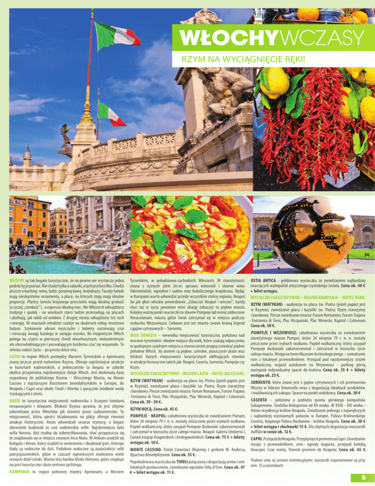 włochy WCZASY rzym na wyciągnięcie ręKi! WŁoChY są tak bogate turystycznie, że na pewno nie wystarczy jedna podróż by je poznać. nie chodzi tylko o zabytki, a tych jest bez liku. chodzi jeszcze o kuchnię, wino, ludzi, poranną kawę, krajobrazy. fasady katedr mają nieskazitelne ornamenty, a place, na których stoją mają idealne proporcje. plastry świeżo krojonego prosciutto mają idealną grubość (a raczej „cienkość”), a espresso idealną moc. We Włoszech odnajdziesz tradycję i spokój - na wioskach starsi ludzie przesiadują na placach i plotkują, jak robili od wieków. z drugiej strony odnajdziesz też ruch i energię. W miastach młodzież szaleje na skuterach robiąc mnóstwo hałasu. szykownie ubrani mężczyźni i kobiety rozsiewają czar i zwracają uwagę każdego w zasięgu wzroku. Bo magnetyzm Włoch polega na czymś w pierwszej chwili nieuchwytnym, niekonkretnym ale obezwładniającym i pozwalającym każdemu czuć się wspaniale. to włoska radość życia – po prostu dolce vita. LAZIo to region Włoch pomiędzy morzem tyrreńskim a apeninami, znany jeszcze przed rozkwitem rzymu. oferuje najróżniejsze atrakcje w kurortach nadmorskich, a jednocześnie ta bogata w zabytki okolica przypomina najsłynniejsze dzieje Włoch. jest doskonałą bazę wypadową do pobliskiego rzymu – Wiecznego miasta, na monte cassino z najstarszym klasztorem benedyktyńskim w europie, do neapolu i capri oraz okolic tivoli i Viterba z gorącymi źródłami wody tryskającymi z ziemi. AnZIo to turystyczna miejscowość nadmorska z licznymi hotelami, restauracjami i sklepami. Bliskość rzymu sprawia, że jest chętnie odwiedzana przez Włochów jak również przez cudzoziemców. to miejscowość, która oprócz leżakowania na plaży oferuje również atrakcje historyczne. anzio odwiedzali cesarze rzymscy, a bogaci obywatele budowali tu swe nadmorskie wille. najsłynniejsza była willa nerona, dziś trudna do zidentyfikowania, choć przypuszcza się, że znajdowała się w miejscu zwanym arco muto. W antium urodzili się Kaligula i neron, który osadził tu weteranów i zbudował port, którego ślady są widoczne do dziś. podobnie widoczne są pozostałości willi patrycjuszowskich, gdzie w czasach najnowszych znaleziono wiele cennych dzieł sztuki. miasto leży bardzo blisko nettuno, gdzie znajduje się port turystyczny i duże centrum jachtingu. KAMPAnIA to region położony między apeninami, a morzem tyrreńskim, w południowo-zachodnich Włoszech. W starożytności znana z żyznych ziem (m.in. uprawa winorośli i sławne wino falerneńskie), ogrodów i sadów oraz bukolicznego krajobrazu. Będąc w Kampanii warto odwiedzić przede wszystkim stolicę regionu, neapol, bo jak głosi włoskie powiedzenie „zobaczyć neapol i umrzeć”, każdy, choć raz w życiu powinien mieć okazję zobaczyć to piękne miasto. Kolejny ważny punkt wycieczki to sławne pompeje lub mniej zatłoczone heraculanum, miasta gdzie świat zatrzymał się w miejscu podczas wybuchu Wezuwiusza. ciekawe jest też miasto zwane krainą legend i gajów cytrusowych – sorrento. BAIA doMIZIA – niewielka miejscowość turystyczna, położona nad morzem tyrreńskim. idealne miejsce dla osób, które szukają odpoczynku w spokojnym i pięknym miejscu a równocześnie pragną zwiedzać piękne południe Włoch. jej atutem są piękne, szerokie, piaszczyste plaże oraz bliskość dużych miejscowości turystycznych obfitujących również w atrakcje historyczne takich jak: neapol, caserta, sorrento, pompeje czy rzym. WYCIECZKI fAKuLtAtYWnE – REGIon LAZIo – hotEL dEI CESARI: RZYM (WAtYKAn) - audiencja na placu św. piotra (jeżeli papież jest w rzymie), zwiedzanie placu i bazyliki św. piotra; rzym starożytny i barokowy. piesze zwiedzanie miasta: forum romanum, forum trajana - fontanna di trevi, plac hiszpański, plac Wenecki, Kapitol i coloseum. Cena ok. 39 - 59 €. RZYM noCĄ. Cena ok. 45 €. PoMPEJE - nEAPoL: całodniowa wycieczka ze zwiedzaniem pompei, które 24 sierpnia 79 r. n. e. zostały zniszczone przez wybuch wulkanu. popiół wulkaniczny, który zasypał pompeje doskonale zakonserwował i zatrzymał w bezruchu życie całego miasta. neapol: Galeria umberta i, zamek książąt aragońskich i andegaweńskich. Cena ok. 75 € + bilety wstępu ok. 18 €. MontE CASSIno. polski cmentarz Wojenny z grobem W. andersa, opactwo Benedyktynów. Cena ok. 55 €. popołudniowa wycieczka do tIVoLI połączona z degustacją serów i win lokalnych producentów, zwiedzanie ogrodów Villa d’este. Cena ok. 47 € + bilet wstępu ok. 11 €. oStIA AntICA - półdniowa wycieczka ze zwiedzaniem najbardziej znaczących wykopalisk antycznego rzymskiego świata. Cena ok. 40 € + bilet wstępu. WYCIECZKI fAKuLtAtYWnE – REGIon KAMPAnIA – hotEL PARK: RZYM (WAtYKAn) - audiencja na placu św. piotra (jeżeli papież jest w rzymie), zwiedzanie placu i bazyliki św. piotra; rzym starożytny i barokowy. piesze zwiedzanie miasta: forum romanum, forum trajana - fontanna di trevi, plac hiszpański, plac Wenecki, Kapitol i coloseum. Cena ok. 50 €. PoMPEJE I WEZuWIuSZ: całodniowa wycieczka ze zwiedzaniem starożytnego miasta pompei, które 24 sierpnia 79 r. n. e. zostały zniszczone przez wybuch wulkanu. popiół wulkaniczny, który zasypał pompeje doskonale zakonserwował i zatrzymał w bezruchu życie całego miasta. Wstęp na teren muzeum archeologicznego – zwiedzanie ruin z lokalnym przewodnikiem. przejazd pod najsłynniejszy stożek wulkaniczny, wyjazd autokarem na Wezuwiusz - parking górny, następnie indywidualny spacer do krateru. Cena ok. 35 € + bilety wstępu ok. 23 €. SoRREnto, które znane jest z gajów cytrynowych i ich przetworów. Wizyta w fabryce limoncello wraz z degustacją lokalnych produktów i możliwością ich zakupu. spacer na punkt widokowy. Cena ok. 30 € CASERtA – położona u podnóża pasma górskiego kampańska subapennine. siedziba biskupstwa od Xii wieku. W XViii - Xi