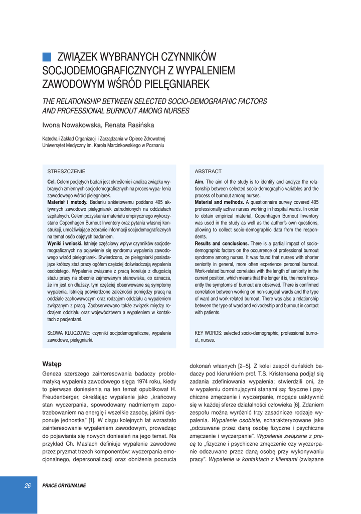 ZWIĄZEK WYBRANYCH CZYNNIKÓW SOCJODEMOGRAFICZNYCH Z WYPALENIEM ZAWODOWYM WŚRÓD PIELĘGNIAREK THE RELATIONSHIP BETWEEN SELECTED SOCIO-DEMOGRAPHIC FACTORS AND PROFESSIONAL BURNOUT AMONG NURSES Iwona Nowakowska, Renata Rasińska Katedra i Zakład Organizacji i Zarządzania w Opiece Zdrowotnej Uniwersytet Medyczny im. Karola Marcinkowskiego w Poznaniu STRESZCZENIE ABSTRACT Cel. Celem podjętych badań jest określenie i analiza związku wybranych zmiennych socjodemograficznych na proces wypa- lenia zawodowego wśród pielęgniarek. Materiał i metody. Badaniu ankietowemu poddano 405 aktywnych zawodowo pielęgniarek zatrudnionych na oddziałach szpitalnych. Celem pozyskania materiału empirycznego wykorzystano Copenhagen Burnout Inventory oraz pytania własnej konstrukcji, umożliwiające zebranie informacji socjodemograficznych na temat osób objętych badaniem. Wyniki i wnioski. Istnieje częściowy wpływ czynników socjodemograficznych na pojawienie się syndromu wypalenia zawodowego wśród pielęgniarek. Stwierdzono, że pielęgniarki posiadające krótszy staż pracy ogółem częściej doświadczają wypalenia osobistego. Wypalenie związane z pracą koreluje z długością stażu pracy na obecnie zajmowanym stanowisku, co oznacza, że im jest on dłuższy, tym częściej obserwowane są symptomy wypalenia. Istnieją potwierdzone zależności pomiędzy pracą na oddziale zachowawczym oraz rodzajem oddziału a wypaleniem związanym z pracą. Zaobserwowano także związek między rodzajem oddziału oraz województwem a wypaleniem w kontaktach z pacjentami. Aim. The aim of the study is to identify and analyze the relationship between selected socio-demographic variables and the process of burnout among nurses. Material and methods. A questionnaire survey covered 405 professionally active nurses working in hospital wards. In order to obtain empirical material, Copenhagen Burnout Inventory was used in the study as well as the author’s own questions, allowing to collect socio-demographic data from the respondents. Results and conclusions. There is a partial impact of sociodemographic factors on the occurrence of professional burnout syndrome among nurses. It was found that nurses with shorter seniority in general, more often experience personal burnout. Work-related burnout correlates with the length of seniority in the current position, which means that the longer it is, the more frequently the symptoms of burnout are observed. There is confirmed correlation between working on non-surgical wards and the type of ward and work-related burnout. There was also a relationship between the type of ward and voivodeship and burnout in contact with patients. SŁOWA KLUCZOWE: czynniki socjodemograficzne, wypalenie zawodowe, pielęgniarki. KEY WORDS: selected socio-demographic, professional burnout, nurses. Wstęp Geneza szerszego zainteresowania badaczy problematyką wypalenia zawodowego sięga 1974 roku, kiedy to pierwsze doniesienia na ten temat opublikował H. Freudenberger, określając wypalenie jako „krańcowy stan wyczerpania, spowodowany nadmiernym zapotrzebowaniem na energię i wszelkie zasoby, jakimi dysponuje jednostka” [1]. W ciągu kolejnych lat wzrastało zainteresowanie wypaleniem zawodowym, prowadząc do pojawiania się nowych doniesień na jego temat. Na przykład Ch. Maslach definiuje wypalenie zawodowe przez pryzmat trzech komponentów: wyczerpania emocjonalnego, depersonalizacji oraz obniżenia poczucia 26 PRACE ORYGINALNE dokonań własnych [2–5]. Z kolei zespół duńskich badaczy pod kierunkiem prof. T.S. Kristensena podjął się zadania zdefiniowania wypalenia; stwierdzili oni, że w wypaleniu dominującymi stanami są: fizyczne i psychiczne zmęczenie i wyczerpanie, mogące uaktywnić się w każdej sferze działalności człowieka [6]. Zdaniem zespołu można wyróżnić trzy zasadnicze rodzaje wypalenia. Wypalenie osobiste, scharakteryzowane jako „odczuwane przez daną osobę fizyczne i psychiczne zmęczenie i wyczerpanie”. Wypalenie związane z pracą to „fizyczne i psychiczne zmęczenie czy wyczerpanie odczuwane przez daną osobę przy wykonywaniu pracy”. Wypalenie w kontaktach z klientami (związane z klientami) stanowi „fizyczne i psychiczne zmęczenie czy wyczerpanie odczuwane przez daną osobę przy kontaktach z klientami” [6, 7, 8]. Doniesienia naukowe, obejmujące swym zasięgiem tematykę wypalenia zawodowego, dostarczają m.in. informacji na temat przyczyn powstawania syndromu burnout. Wśród nich znaleźć można tezę, że za pojawienie się symptomów wypalenia wśród pracowników w głównej mierze odpowiada obecność tych czynników, których źródła związane są bezpośrednio ze środowiskiem pracy. Dotyczą one zarówno sfery psychospołecznej, jak i czynników fizycznych [9, 10] czy organizacyjnych. Jednak nie bez znaczenia (choć nie chodzi o ich nasilenie, a raczej o występowanie – przyp. aut.) są cechy osobowościowe czy demograficzne [4]. Cel pracy Celem podjętych badań jest określenie i analiza wzajemnych relacji pomiędzy wybranymi danymi socjodemograficznymi respondentek a wstępowaniem symptomów wypalenia zawodowego w trzech zdefiniowanych obszarach. Materiał i metody Materiał badawczy pozyskano od 405 aktywnych zawodowo pielęgniarek, różniących się wiekiem (wyodrębniono 5 grup wiekowych), stanem cywilnym, wykształceniem, stażem pracy ogółem i obecnie zajmowanym stanowiskiem (również wyodrębniono 5 grup stażowych). Część respondentek zajmowała stanowiska kierownicze w podsystemie pielęgniarstwa oraz była zatrudniona w systemie pracy zmianowej. Osoby objęte badaniem różniły się także miejscem zatrudnienia (oddział szpitalny i województwo). Na rycinie 1 (a–j) przedstawiono wykresy kołowe wraz z procentowymi wskaźnikami struktury, przedstawiającymi, jaki jest procentowy udział osób z rozważaną cechą socjodemograficzną w całej badanej grupie. W celu pozyskania materiału em