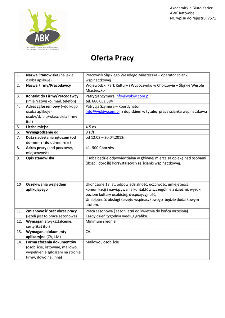 Akademickie Biuro Karier AWF Katowice Nr. wpisu do rejestru: 7571 Oferta Pracy 1. 2. 3. 4. 5. 6. 7. 8. 9. 10 Nazwa Stanowiska (na jakie osoba aplikuje) Nazwa Firmy/Pracodawcy Kontakt do Firmy/Pracodawcy (Imię Nazwisko, mail, telefon) Adres zgłoszeniowy (+do kogo osoba aplikujeosoby/działu/właściciela firmy itd.) Liczba miejsc Wynagrodzenie od Data nadsyłania zgłoszeń (od dd-mm-rrr do dd-mm-rrrr) Adres pracy (kod pocztowy, miejscowość) Opis stanowiska Oczekiwania względem aplikującego 11. Zmianowość oraz okres pracy (jeżeli jest to praca sezonowa) 12. Wymagania(wykształcenie, certyfikat itp.) 13. Wymagane dokumenty aplikacyjne (CV, LM) 14. Forma złożenia dokumentów (osobiście, listownie, mailowo, wypełnienie zgłoszeni na stronie firmy, dowolna, inna) Pracownik Śląskiego Wesołego Miasteczka – operator ścianki wspinaczkowej Wojewódzki Park Kultury i Wypoczynku w Chorzowie – Śląskie Wesołe Miasteczko Patrycja Szymura [email protected] tel. 666 031 384 Patrycja Szymura – Koordynator [email protected] z dopiskiem w tytule: praca ścianka wspinaczkowa 4-5 os 8 zł/H od 12.03 – 30.04.2012r 41- 500 Chorzów Osoba będzie odpowiedzialna w głównej mierze za opiekę nad osobami (dzieci, dorośli) korzystających ze ścianki wspinaczkowej. Ukończone 18 lat, odpowiedzialność, uczciwość, umiejętność komunikacji i nawiązywania kontaktów szczególnie z dziećmi, wysoki poziom kultury osobistej, dyspozycyjność, Umiejętność obsługi sprzętu wspinaczkowego będzie dodatkowym atutem. Praca sezonowa ( sezon letni od kwietnia do końca września) Każdy dzień tygodnia według grafiku. Minimum średnie CV. Mailowo , osobiście