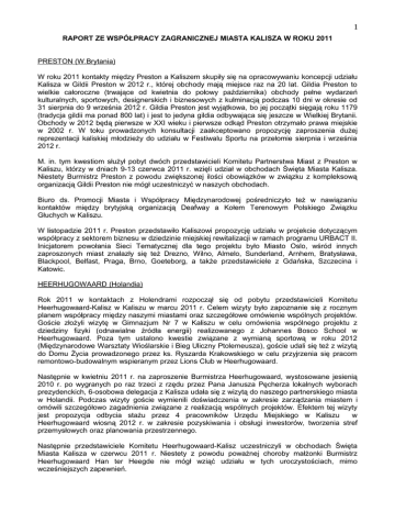 1 RAPORT ZE WSPÓŁPRACY ZAGRANICZNEJ MIASTA KALISZA W ROKU 2011 PRESTON (W.Brytania) W roku 2011 kontakty między Preston a Kaliszem skupiły się na opracowywaniu koncepcji udziału Kalisza w Gildii Preston w 2012 r., której obchody mają miejsce raz na 20 lat. Gildia Preston to wielkie całoroczne (trwające od kwietnia do połowy października) obchody pełne wydarzeń kulturalnych, sportowych, designerskich i biznesowych z kulminacją podczas 10 dni w okresie od 31 sierpnia do 9 września 2012 r. Gildia Preston jest wyjątkowa, bo jej początki sięgają roku 1179 (tradycja gildii ma ponad 800 lat) i jest to jedyna gildia odbywająca się jeszcze w Wielkiej Brytanii. Obchody w 2012 będą pierwsze w XXI wieku i pierwsze odkąd Preston otrzymało prawa miejskie w 2002 r. W toku prowadzonych konsultacji zaakceptowano propozycję zaproszenia dużej reprezentacji kaliskiej młodzieży do udziału w Festiwalu Sportu na przełomie sierpnia i września 2012 r. M. in. tym kwestiom służył pobyt dwóch przedstawicieli Komitetu Partnerstwa Miast z Preston w Kaliszu, którzy w dniach 9-13 czerwca 2011 r. wzięli udział w obchodach Święta Miasta Kalisza. Niestety Burmistrz Preston z powodu zwiększonej ilości obowiązków w związku z kompleksową organizacją Gildii Preston nie mógł uczestniczyć w naszych obchodach. Biuro ds. Promocji Miasta i Współpracy Międzynarodowej pośredniczyło też w nawiązaniu kontaktów między brytyjską organizacją Deafway a Kołem Terenowym Polskiego Związku Głuchych w Kaliszu. W listopadzie 2011 r. Preston przedstawiło Kaliszowi propozycję udziału w projekcie dotyczącym współpracy z sektorem biznesu w dziedzinie miejskiej rewitalizacji w ramach programu URBACT II. Inicjatorem powołania Sieci Tematycznej dla tego projektu było Miasto Oslo, wśród innych zaproszonych miast znalazły się też Drezno, Wilno, Almelo, Sunderland, Arnhem, Bratysława, Blackpool, Belfast, Praga, Brno, Goeteborg, a także przedstawiciele z Gdańska, Szczecina i Katowic. HEERHUGOWAARD (Holandia) Rok 2011 w kontaktach z Holendrami rozpoczął się od pobytu przedstawicieli Komitetu Heerhugowaard-Kalisz w Kaliszu w marcu 2011 r. Celem wizyty było zapoznanie się z rocznym planem współpracy między naszymi miastami oraz szczegółowe omówienie wspólnych projektów. Goście złożyli wizytę w Gimnazjum Nr 7 w Kaliszu w celu omówienia wspólnego projektu z dziedziny fizyki (odnawialne źródła energii) realizowanego z Johannes Bosco School w Heerhugowaard. Poza tym ustalono kwestie związane z wymianą sportową w roku 2012 (Międzynarodowe Warsztaty Wioślarskie i Bieg Uliczny Ptolemeusza), goście udali się też z wizytą do Domu Życia prowadzonego przez ks. Ryszarda Krakowskiego w celu przyjrzenia się pracom remontowo-budowalnym wspieranym przez Lions Club w Heerhugowaard. Następnie w kwietniu 2011 r. na zaproszenie Burmistrza Heerhugowaard, wystosowane jesienią 2010 r. po wygranych po raz trzeci z rzędu przez Pana Janusza Pęcherza lokalnych wyborach prezydenckich, 6-osobowa delegacja z Kalisza udała się z wizytą do naszego partnerskiego miasta w Holandii. Podczas wizyty goście wymienili doświadczenia w zakresie zarządzania miastem i omówili szczegółowo zagadnienia związane z realizacją wspólnych projektów. Efektem tej wizyty jest propozycja odbycia stażu przez 4 pracowników Urzędu Miejskiego w Kaliszu w Heerhugowaard wiosną 2012 r. w zakresie pozyskiwania i obsługi inwestorów, tworzenia stref przemysłowych oraz planowania przestrzennego. Następnie przedstawiciele Komitetu Heerhugowaard-Kalisz uczestniczyli w obchodach Święta Miasta Kalisza w czerwcu 2011 r. Niestety z powodu poważnej choroby małżonki Burmistrz Heerhugowaard Han ter Heegde nie mógł wziąć udziału w tych uroczystościach, mimo wcześniejszych zapewnień. 2 Z kolei w dniach 25-26 czerwca 2011 r. doszło do wymiany kulturalnej między naszymi miastami – kaliskie chóry Canticum i Cantate Deo miały okazję zaprezentować swój repertuar podczas imprezy Amateur Cultural Event w Heerhugowaard na zaproszenie Komitetu HeerhugowaardKalisz. Natomiast we wrześniu 2011 r. przedstawiciele holenderskiej organizacji „18-24” przywieźli do Kalisza 1000 cebulek tulipanów „Calisia” podarowanych przez Burmistrza Heerhugowaard” – odmiany specjalnie wyhodowanej dla uczczenia współpracy partnerskiej naszych miast w 2001 r. Zostały one przekazane do Wydziału Środowiska w celu udekorowania reprezentacyjnych miejsc w Kaliszu i podkreślenia naszej owocnej współpracy. W październiku po raz trzeci w tym roku gościliśmy przedstawicieli Komitetu HeerhugowaardKalisz, którzy przywieźli smutną wiadomość o cięciach budżetowych w Heerhugowaard i zakończeniu finansowania przez tamtejszą Radę Miejską działalności Komitetu HeerhugowaardKalisz z dniem 31 grudnia 2012 r. Nie wpłynęło to jednak w znacznym stopniu na wspólne działania w 2012 r. – w toku rozmów zaplanowano organizację warsztatów autystycznych z udziałem holenderskich specjalistów w marcu 2012 r. w Zespole Szkół Nr 10, wyjazd ok. 20osobowej grupy młodzieży szkolnej z Gimnazjum Nr 7 wraz z kilkoma nauczycielami do Heerhugowaard w maju 2012 r. (w ramach projektu z dziedziny fizyki realizowanego z Johannes Bosco School) oraz przedstawiono nowe propozycje wspólnych projektów – Wielkie nagrody oraz model kolejki, których realizację zaplanowano na 2012 rok. HAUTMONT (Francja) Kontakty Kalisza z Hautmont w 2011 r. zaowocowały wizytą 5-osobowej delegacji francuskiego miasta w Kaliszu podczas obchodów Święta Miasta w dniach 9-12 czerwca. Natomiast do rewizyty doszło w grudniu 2011 r. kiedy to na zaproszenie Mera Joel Wilmotte 6-osobowa delegacja z Kalisza udała się do Hautmont, by wziąć udział w uroczystościach związanych z Jarmarkiem Bożonarodzeniowym. Przy okazji nawiązano kontakt między Stowarzyszeniem Amazonek w Kaliszu a podobną organizacją w Maubeuge. W
