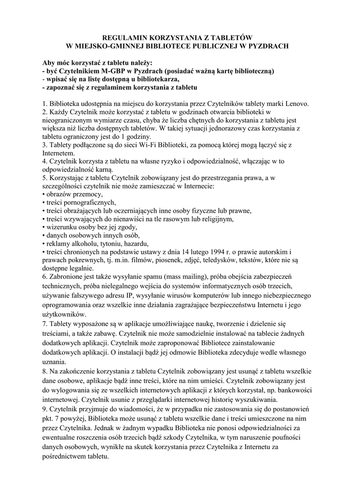 REGULAMIN KORZYSTANIA Z TABLETÓW W MIEJSKO-GMINNEJ BIBLIOTECE PUBLICZNEJ W PYZDRACH Aby móc korzystać z tabletu należy: - być Czytelnikiem M-GBP w Pyzdrach (posiadać ważną kartę biblioteczną) - wpisać się na listę dostępną u bibliotekarza, - zapoznać się z regulaminem korzystania z tabletu 1. Biblioteka udostępnia na miejscu do korzystania przez Czytelników tablety marki Lenovo. 2. Każdy Czytelnik może korzystać z tabletu w godzinach otwarcia biblioteki w nieograniczonym wymiarze czasu, chyba że liczba chętnych do korzystania z tabletu jest większa niż liczba dostępnych tabletów. W takiej sytuacji jednorazowy czas korzystania z tabletu ograniczony jest do 1 godziny. 3. Tablety podłączone są do sieci Wi-Fi Biblioteki, za pomocą której mogą łączyć się z Internetem. 4. Czytelnik korzysta z tabletu na własne ryzyko i odpowiedzialność, włączając w to odpowiedzialność karną. 5. Korzystając z tabletu Czytelnik zobowiązany jest do przestrzegania prawa, a w szczególności czytelnik nie może zamieszczać w Internecie: • obrazów przemocy, • treści pornograficznych, • treści obrażających lub oczerniających inne osoby fizyczne lub prawne, • treści wzywających do nienawiści na tle rasowym lub religijnym, • wizerunku osoby bez jej zgody, • danych osobowych innych osób, • reklamy alkoholu, tytoniu, hazardu, • treści chronionych na podstawie ustawy z dnia 14 lutego 1994 r. o prawie autorskim i prawach pokrewnych, tj. m.in. filmów, piosenek, zdjęć, teledysków, tekstów, które nie są dostępne legalnie. 6. Zabronione jest także wysyłanie spamu (mass mailing), próba obejścia zabezpieczeń technicznych, próba nielegalnego wejścia do systemów informatycznych osób trzecich, używanie fałszywego adresu IP, wysyłanie wirusów komputerów lub innego niebezpiecznego oprogramowania oraz wszelkie inne działania zagrażające bezpieczeństwu Internetu i jego użytkowników. 7. Tablety wyposażone są w aplikacje umożliwiające naukę, tworzenie i dzielenie się treściami, a także zabawę. Czytelnik nie może samodzielnie instalować na tablecie żadnych dodatkowych aplikacji. Czytelnik może zaproponować Bibliotece zainstalowanie dodatkowych aplikacji. O instalacji bądź jej odmowie Biblioteka zdecyduje wedle własnego uznania. 8. Na zakończenie korzystania z tabletu Czytelnik zobowiązany jest usunąć z tabletu wszelkie dane osobowe, aplikacje bądź inne treści, które na nim umieści. Czytelnik zobowiązany jest do wylogowania się ze wszelkich internetowych aplikacji z których korzystał, np. bankowości internetowej. Czytelnik usunie z przeglądarki internetowej historię wyszukiwania. 9. Czytelnik przyjmuje do wiadomości, że w przypadku nie zastosowania się do postanowień pkt. 7 powyżej, Biblioteka może usunąć z tabletu wszelkie dane i treści umieszczone na nim przez Czytelnika. Jednak w żadnym wypadku Biblioteka nie ponosi odpowiedzialności za ewentualne roszczenia osób trzecich bądź szkody Czytelnika, w tym naruszenie poufności danych osobowych, wynikłe na skutek korzystania przez Czytelnika z Internetu za pośrednictwem tabletu.