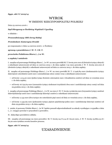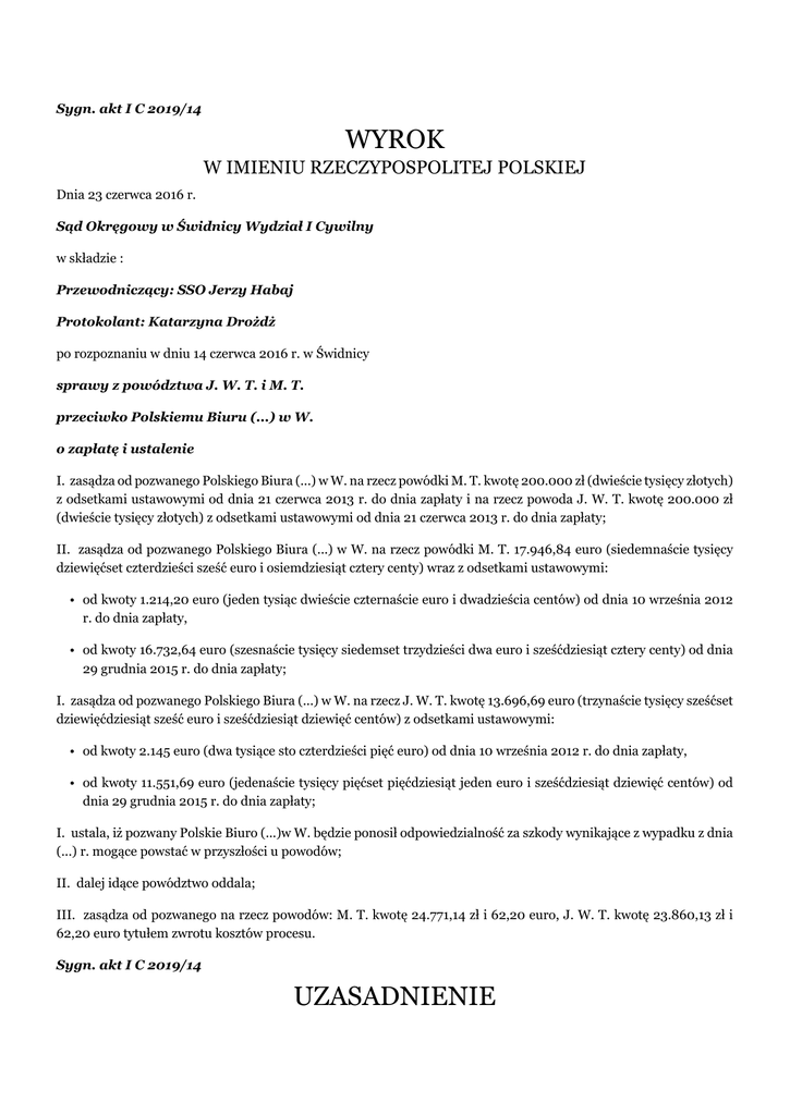 Sygn. akt I C 2019/14 WYROK W IMIENIU RZECZYPOSPOLITEJ POLSKIEJ Dnia 23 czerwca 2016 r. Sąd Okręgowy w Świdnicy Wydział I Cywilny w składzie : Przewodniczący: SSO Jerzy Habaj Protokolant: Katarzyna Drożdż po rozpoznaniu w dniu 14 czerwca 2016 r. w Świdnicy sprawy z powództwa J. W. T. i M. T. przeciwko Polskiemu Biuru (...) w W. o zapłatę i ustalenie I. zasądza od pozwanego Polskiego Biura (...) w W. na rzecz powódki M. T. kwotę 200.000 zł (dwieście tysięcy złotych) z odsetkami ustawowymi od dnia 21 czerwca 2013 r. do dnia zapłaty i na rzecz powoda J. W. T. kwotę 200.000 zł (dwieście tysięcy złotych) z odsetkami ustawowymi od dnia 21 czerwca 2013 r. do dnia zapłaty; II. zasądza od pozwanego Polskiego Biura (...) w W. na rzecz powódki M. T. 17.946,84 euro (siedemnaście tysięcy dziewięćset czterdzieści sześć euro i osiemdziesiąt cztery centy) wraz z odsetkami ustawowymi: • od kwoty 1.214,20 euro (jeden tysiąc dwieście czternaście euro i dwadzieścia centów) od dnia 10 września 2012 r. do dnia zapłaty, • od kwoty 16.732,64 euro (szesnaście tysięcy siedemset trzydzieści dwa euro i sześćdziesiąt cztery centy) od dnia 29 grudnia 2015 r. do dnia zapłaty; I. zasądza od pozwanego Polskiego Biura (...) w W. na rzecz J. W. T. kwotę 13.696,69 euro (trzynaście tysięcy sześćset dziewięćdziesiąt sześć euro i sześćdziesiąt dziewięć centów) z odsetkami ustawowymi: • od kwoty 2.145 euro (dwa tysiące sto czterdzieści pięć euro) od dnia 10 września 2012 r. do dnia zapłaty, • od kwoty 11.551,69 euro (jedenaście tysięcy pięćset pięćdziesiąt jeden euro i sześćdziesiąt dziewięć centów) od dnia 29 grudnia 2015 r. do dnia zapłaty; I. ustala, iż pozwany Polskie Biuro (...)w W. będzie ponosił odpowiedzialność za szkody wynikające z wypadku z dnia (...) r. mogące powstać w przyszłości u powodów; II. dalej idące powództwo oddala; III. zasądza od pozwanego na rzecz powodów: M. T. kwotę 24.771,14 zł i 62,20 euro, J. W. T. kwotę 23.860,13 zł i 62,20 euro tytułem zwrotu kosztów procesu. Sygn. akt I C 2019/14 UZASADNIENIE Powodowie M. T. oraz J. T. wnieśli przeciwko Polskiemu Biuru (...) z siedzibą w W. o: 1. zasądzenie od strony pozwanej na rzecz powódki kwoty 200.000 zł tytułem dopłaty do dotychczas przyznanego zadośćuczynienia wraz z odsetkami ustawowymi od dnia 21 czerwca 2013 r. do dnia zapłaty, 2. zasądzenie od strony pozwanej na rzecz powoda kwoty 200.000 zł tytułem dopłaty do dotychczas przyznanego zadośćuczynienia wraz z odsetkami ustawowymi od dnia 21 czerwca 2013 r. do dnia zapłaty, 3. zasądzenia od strony pozwanej na rzecz powódki kwoty 1.214,20 euro wraz z ustawowymi odsetkami od dnia 10 września 2012 r. tytułem zwrotu kosztów leczenia i rehabilitacji, 4. zasądzenia od strony pozwanej na rzecz powoda kwoty 2.145 euro wraz z ustawowymi odsetkami od dnia 10 września 2012 r. tytułem zwrotu kosztów leczenia i rehabilitacji, 5. ustalenie odpowiedzialności strony pozwanej za szkody mogące powstać w przyszłości. Pismem z dnia 27 listopada 2015 roku powodowie zmienili żądanie pozwu w ten sposób, że: 1. w miejsce żądania zasądzenia od strony pozwanej na rzecz powódki kwoty 1.214,20 euro wraz z ustawowymi odsetkami od dnia 10 września 2012 r. tytułem zwrotu kosztów leczenia i rehabilitacji, zawartego w punkcie 3 pozwu z dnia 2 października 2014 r. wniosła o zasądzenie od strony pozwanej na jej rzecz tytułem zwrotu kosztów leczenia i rehabilitacji kwoty 17.946,84 euro wraz z ustawowymi odsetkami liczonymi w następujący sposób: 1. od kwoty 1.214,20 euro od dnia 10 września 2012 r. do dnia zapłaty, 2. od kwoty 16.732,64 euro od dnia doręczenia stronie pozwanej pisma do dnia zapłaty; 2. w miejsce żądania zasądzenia od strony pozwanej na rzecz powoda kwoty 2.145 euro wraz z ustawowymi odsetkami od dnia 10 września 2012 r. tytułem zwrotu kosztów leczenia i rehabilitacji, zawartego w punkcie 4 pozwu z dnia 2 października 2014 r., wniósł o zasądzenie od strony pozwanej na jego rzecz tytułem zwrotu kosztów leczenia i rehabilitacji kwoty 13.696,69 euro wraz z ustawowymi odsetkami liczonymi w następujący sposób: 1. od kwoty 2.145 euro od dnia 10 września 2012 r. do dnia zapłaty, 2. od kwoty 11.551,69 euro od dnia doręczenia stronie pozwanej pisma do dnia zapłaty. Strona pozwana wniosła o oddalenie powództwa w całości, a ponadto o zasądzenie od powodów na rzecz pozwanego zwrotu kosztów procesu, w tym zwrotu kosztów zastępstwa procesowego według norm przepisanych zł oraz opłaty skarbowej od pełnomocnictwa w kwocie 17 zł. Sąd ustalił następujący stan faktyczny: Powódka i powód są małżeństwem. Przed dniem(...) roku powód przed dniem (...) roku prowadził przedsiębiorstwo świadczące usługi (...), zatrudniającą około 90 pracowników. Nie miał większych problemów zdrowotnych, poza tym, że cierpiał na wysokie ciśnienie krwi i wysoki poziom cholesterolu. Około 2000 roku powód miał operowany dysk, jednak nie miało to wpływu na jego aktywność zawodową i pozazawodową. Powódka natomiast nie cierpiała na żadne choroby. M. T. była zatrudniona w powyższej firmie w dziale administracyjnym i finansowym. W tym czasie powodowie aktywnie spędzali czas wolny, chodzili na długie spacery, jeździli na rowerach, nartach, grali w golfa, część wolnego czasu spędzali także w swoim prywatnym domu w zachodniej I.. Ich życie towarzyskie rozwijało się prawidłowo, przyjmowali znajomych u siebie w domu. Powódka samodzielnie zajmowała się gospodarstwem domowym wykonując w nim wszystkie czynności związane z jego bieżącym utrzymaniem. Z uwagi na swój wiek oraz stabilną sytuację materialną powodowie planowali jednak ograniczenie aktywności zawodowej i poświęcenie więcej wolnego czasu na wypoczynek. Dowód: 1. przesłuchanie powódki M. T. – k. 652 (zapis rozprawy z dnia 27 lutego 2015) 2. przesłuchanie 