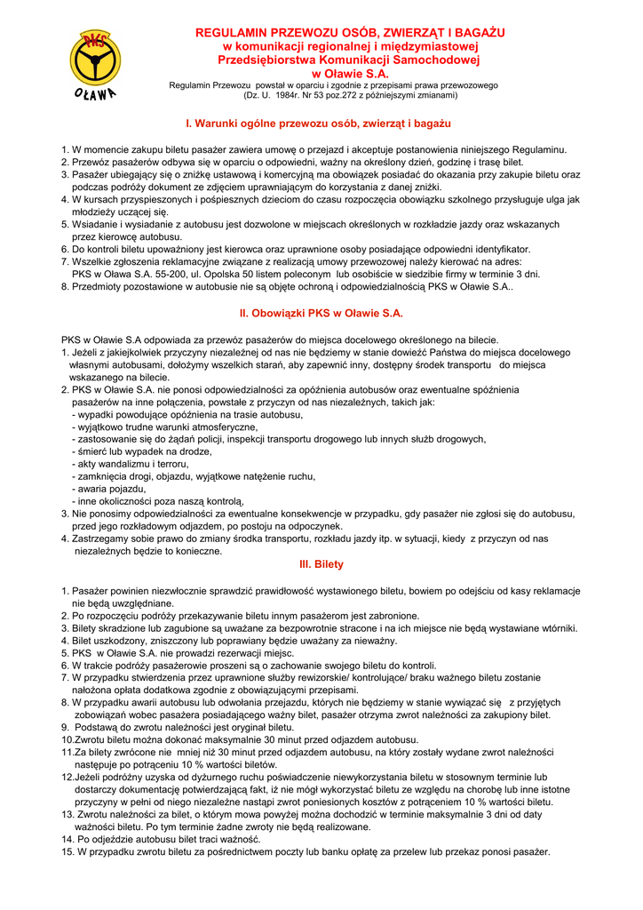 REGULAMIN PRZEWOZU OSÓB, ZWIERZĄT I BAGAŻU w komunikacji regionalnej i międzymiastowej Przedsiębiorstwa Komunikacji Samochodowej w Oławie S.A. Regulamin Przewozu powstał w oparciu i zgodnie z przepisami prawa przewozowego (Dz. U. 1984r. Nr 53 poz.272 z późniejszymi zmianami) I. Warunki ogólne przewozu osób, zwierząt i bagażu 1. W momencie zakupu biletu pasażer zawiera umowę o przejazd i akceptuje postanowienia niniejszego Regulaminu. 2. Przewóz pasażerów odbywa się w oparciu o odpowiedni, ważny na określony dzień, godzinę i trasę bilet. 3. Pasażer ubiegający się o zniżkę ustawową i komercyjną ma obowiązek posiadać do okazania przy zakupie biletu oraz podczas podróży dokument ze zdjęciem uprawniającym do korzystania z danej zniżki. 4. W kursach przyspieszonych i pośpiesznych dzieciom do czasu rozpoczęcia obowiązku szkolnego przysługuje ulga jak młodzieży uczącej się. 5. Wsiadanie i wysiadanie z autobusu jest dozwolone w miejscach określonych w rozkładzie jazdy oraz wskazanych przez kierowcę autobusu. 6. Do kontroli biletu upoważniony jest kierowca oraz uprawnione osoby posiadające odpowiedni identyfikator. 7. Wszelkie zgłoszenia reklamacyjne związane z realizacją umowy przewozowej należy kierować na adres: PKS w Oława S.A. 55-200, ul. Opolska 50 listem poleconym lub osobiście w siedzibie firmy w terminie 3 dni. 8. Przedmioty pozostawione w autobusie nie są objęte ochroną i odpowiedzialnością PKS w Oławie S.A.. II. Obowiązki PKS w Oławie S.A. PKS w Oławie S.A odpowiada za przewóz pasażerów do miejsca docelowego określonego na bilecie. 1. Jeżeli z jakiejkolwiek przyczyny niezależnej od nas nie będziemy w stanie dowieźć Państwa do miejsca docelowego własnymi autobusami, dołożymy wszelkich starań, aby zapewnić inny, dostępny środek transportu do miejsca wskazanego na bilecie. 2. PKS w Oławie S.A. nie ponosi odpowiedzialności za opóźnienia autobusów oraz ewentualne spóźnienia pasażerów na inne połączenia, powstałe z przyczyn od nas niezależnych, takich jak: - wypadki powodujące opóźnienia na trasie autobusu, - wyjątkowo trudne warunki atmosferyczne, - zastosowanie się do żądań policji, inspekcji transportu drogowego lub innych służb drogowych, - śmierć lub wypadek na drodze, - akty wandalizmu i terroru, - zamknięcia drogi, objazdu, wyjątkowe natężenie ruchu, - awaria pojazdu, - inne okoliczności poza naszą kontrolą, 3. Nie ponosimy odpowiedzialności za ewentualne konsekwencje w przypadku, gdy pasażer nie zgłosi się do autobusu, przed jego rozkładowym odjazdem, po postoju na odpoczynek. 4. Zastrzegamy sobie prawo do zmiany środka transportu, rozkładu jazdy itp. w sytuacji, kiedy z przyczyn od nas niezależnych będzie to konieczne. III. Bilety 1. Pasażer powinien niezwłocznie sprawdzić prawidłowość wystawionego biletu, bowiem po odejściu od kasy reklamacje nie będą uwzględniane. 2. Po rozpoczęciu podróży przekazywanie biletu innym pasażerom jest zabronione. 3. Bilety skradzione lub zagubione są uważane za bezpowrotnie stracone i na ich miejsce nie będą wystawiane wtórniki. 4. Bilet uszkodzony, zniszczony lub poprawiany będzie uważany za nieważny. 5. PKS w Oławie S.A. nie prowadzi rezerwacji miejsc. 6. W trakcie podróży pasażerowie proszeni są o zachowanie swojego biletu do kontroli. 7. W przypadku stwierdzenia przez uprawnione służby rewizorskie/ kontrolujące/ braku ważnego biletu zostanie nałożona opłata dodatkowa zgodnie z obowiązującymi przepisami. 8. W przypadku awarii autobusu lub odwołania przejazdu, których nie będziemy w stanie wywiązać się z przyjętych zobowiązań wobec pasażera posiadającego ważny bilet, pasażer otrzyma zwrot należności za zakupiony bilet. 9. Podstawą do zwrotu należności jest oryginał biletu. 10.Zwrotu biletu można dokonać maksymalnie 30 minut przed odjazdem autobusu. 11.Za bilety zwrócone nie mniej niż 30 minut przed odjazdem autobusu, na który zostały wydane zwrot należności następuje po potrąceniu 10 % wartości biletów. 12.Jeżeli podróżny uzyska od dyżurnego ruchu poświadczenie niewykorzystania biletu w stosownym terminie lub dostarczy dokumentację potwierdzającą fakt, iż nie mógł wykorzystać biletu ze względu na chorobę lub inne istotne przyczyny w pełni od niego niezależne nastąpi zwrot poniesionych kosztów z potrąceniem 10 % wartości biletu. 13. Zwrotu należności za bilet, o którym mowa powyżej można dochodzić w terminie maksymalnie 3 dni od daty ważności biletu. Po tym terminie żadne zwroty nie będą realizowane. 14. Po odjeździe autobusu bilet traci ważność. 15. W przypadku zwrotu biletu za pośrednictwem poczty lub banku opłatę za przelew lub przekaz ponosi pasażer. IV. Bagaż 1. Pasażerowie są odpowiedzialni za umieszczenie swojego bagażu i zajęcie miejsca we właściwym autobusie. 2. Kierowca pomaga przy załadunku bagażu na wyrażaną prośbę pasażera. PKS w Oławie S.A. nie ponosi odpowiedzialności za jego nadzór i zaginięcie lub kradzież. 3. Bagaż powinien być bezpiecznie zapakowany. 4. Na pokład autobusu można wziąć bagaż podręczny, którego rozmiary pozwalają na umieszczenie go na półkach nad głowami pasażerów. 5. Ze względu na bezpieczeństwo zabrania się zabierania na pokład autobusu dużych sztuk bagażu - taki bagaż musi być ładowany do luków bagażowych. 6. PKS w Oławie S.A. zastrzega sobie prawo do odmowy przewozu bagażu o dużych rozmiarach, rzeczy niebezpiecznych mogących wyrządzić szkodę osobom lub mieniu, bądź, których przewóz jest prawnie zabroniony. 7. Rzeczy szczególne cenne / gotówka, papiery wartościowe, biżuteria, elektronika, klucze domowe i biurowe /oraz posiadające wartość naukową winny być przewożone wyłącznie jako bagaż podręczny. 8. W przypadku składania reklamacji dotyczącej uszkodzenia bagażu należy przedstawić potwierdzenie kierowcy sporządzone
