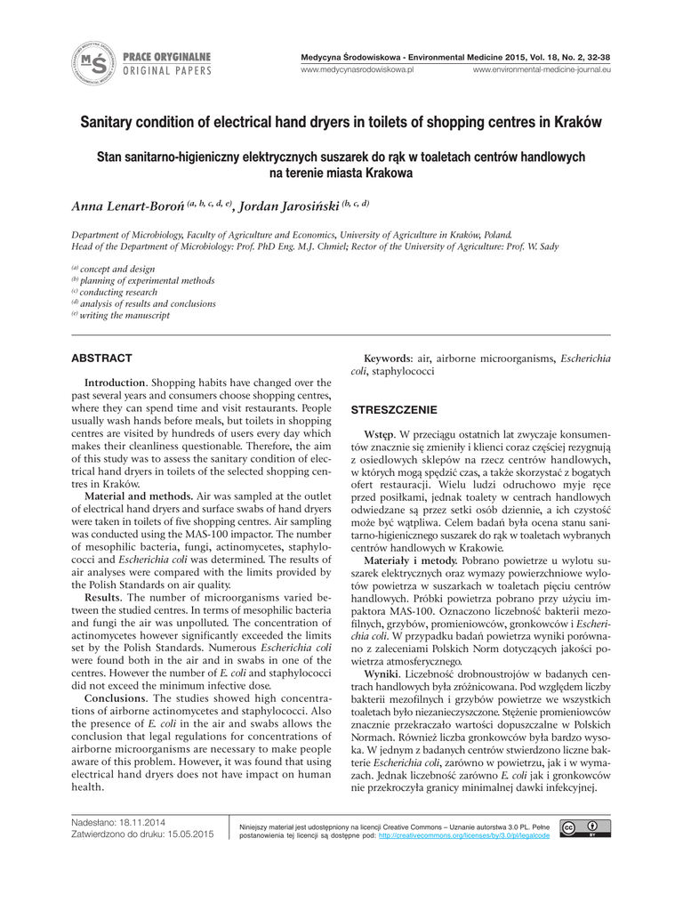 Medycyna Środowiskowa - Environmental Medicine 2015, Vol. 18, No. 2, 32-38 www.environmental-medicine-journal.eu www.medycynasrodowiskowa.pl Sanitary condition of electrical hand dryers in toilets of shopping centres in Kraków Stan sanitarno-higieniczny elektrycznych suszarek do rąk w toaletach centrów handlowych na terenie miasta Krakowa Anna Lenart-Boroń (a, b, c, d, e), Jordan Jarosiński (b, c, d) Department of Microbiology, Faculty of Agriculture and Economics, University of Agriculture in Kraków, Poland. Head of the Department of Microbiology: Prof. PhD Eng. M.J. Chmiel; Rector of the University of Agriculture: Prof. W. Sady concept and design planning of experimental methods (c) conducting research (d) analysis of results and conclusions (e) writing the manuscript (a) (b) AbstrAct Introduction. Shopping habits have changed over the past several years and consumers choose shopping centres, where they can spend time and visit restaurants. People usually wash hands before meals, but toilets in shopping centres are visited by hundreds of users every day which makes their cleanliness questionable. Therefore, the aim of this study was to assess the sanitary condition of electrical hand dryers in toilets of the selected shopping centres in Kraków. Material and methods. Air was sampled at the outlet of electrical hand dryers and surface swabs of hand dryers were taken in toilets of five shopping centres. Air sampling was conducted using the MAS-100 impactor. The number of mesophilic bacteria, fungi, actinomycetes, staphylococci and Escherichia coli was determined. The results of air analyses were compared with the limits provided by the Polish Standards on air quality. Results. The number of microorganisms varied between the studied centres. In terms of mesophilic bacteria and fungi the air was unpolluted. The concentration of actinomycetes however significantly exceeded the limits set by the Polish Standards. Numerous Escherichia coli were found both in the air and in swabs in one of the centres. However the number of E. coli and staphylococci did not exceed the minimum infective dose. Conclusions. The studies showed high concentrations of airborne actinomycetes and staphylococci. Also the presence of E. coli in the air and swabs allows the conclusion that legal regulations for concentrations of airborne microorganisms are necessary to make people aware of this problem. However, it was found that using electrical hand dryers does not have impact on human health. Nadesłano: 18.11.2014 Zatwierdzono do druku: 15.05.2015 Keywords: air, airborne microorganisms, Escherichia coli, staphylococci strEszczENiE Wstęp. W przeciągu ostatnich lat zwyczaje konsumentów znacznie się zmieniły i klienci coraz częściej rezygnują z osiedlowych sklepów na rzecz centrów handlowych, w których mogą spędzić czas, a także skorzystać z bogatych ofert restauracji. Wielu ludzi odruchowo myje ręce przed posiłkami, jednak toalety w centrach handlowych odwiedzane są przez setki osób dziennie, a ich czystość może być wątpliwa. Celem badań była ocena stanu sanitarno-higienicznego suszarek do rąk w toaletach wybranych centrów handlowych w Krakowie. Materiały i metody. Pobrano powietrze u wylotu suszarek elektrycznych oraz wymazy powierzchniowe wylotów powietrza w suszarkach w toaletach pięciu centrów handlowych. Próbki powietrza pobrano przy użyciu impaktora MAS-100. Oznaczono liczebność bakterii mezofilnych, grzybów, promieniowców, gronkowców i Escherichia coli. W przypadku badań powietrza wyniki porównano z zaleceniami Polskich Norm dotyczących jakości powietrza atmosferycznego. Wyniki. Liczebność drobnoustrojów w badanych centrach handlowych była zróżnicowana. Pod względem liczby bakterii mezofilnych i grzybów powietrze we wszystkich toaletach było niezanieczyszczone. Stężenie promieniowców znacznie przekraczało wartości dopuszczalne w Polskich Normach. Również liczba gronkowców była bardzo wysoka. W jednym z badanych centrów stwierdzono liczne bakterie Escherichia coli, zarówno w powietrzu, jak i w wymazach. Jednak liczebność zarówno E. coli jak i gronkowców nie przekroczyła granicy minimalnej dawki infekcyjnej. Niniejszy materiał jest udostępniony na licencji Creative Commons – Uznanie autorstwa 3.0 PL. Pełne postanowienia tej licencji są dostępne pod: http://creativecommons.org/licenses/by/3.0/pl/legalcode Medycyna Środowiskowa - Environmental Medicine 2015, Vol. 18, No. 2 Anna Lenart-Boroń, Jordan Jarosiński: Sanitary condition of electrical hand dryers in toilets of shopping centres in Kraków 33 Wnioski. W badaniach stwierdzono wysokie stężenia promieniowców i gronkowców. Obecność E. coli w powietrzu i w suszarkach daje podstawę do stwierdzenia, że normy prawne regulujące stężenie mikroorganizmów w powietrzu są potrzebne, aby podkreślić znaczenie pro- blemu. Stwierdzono jednakże, że korzystanie z elektrycznych suszarek do rąk nie zagraża zdrowiu użytkowników. iNtroductioN The sampled air volume was 100 litres. Both air and swab samples were collected on Petri dishes containing microbiological media used for enumeration of mesophilic bacteria (Trypticasein Soy Lab Agar, BTL, Poland), fungi (Malt Extract Agar, Oxoid, Great Britain), actinomycetes (Actinomycete Isolation Lab Agar, Biocorp, Poland), mannitol-positive and mannitol-negative Staphylococcus spp. (Mannitol Salt Agar, BTL, Poland), Escherichia coli (EndoLes Agar, BTL, Poland). All samples were collected in three replications and data were presented as mean values of those. The air temperature and humidity was recorded using and HT-9213 Thermohydrometer (ATM, China). After sampling Petri dishes were incubated at 37°C for 48 hrs (mesophilic bacteria, Staphylococcus spp., Escherichia coli) or at 25°C for 3–5 days (fungi) and for 5–7 days (actinomycetes). After incubation, the number of colonies characteristic for each of the examined microbial grou