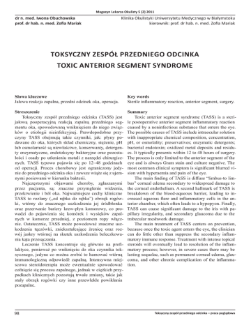 Magazyn Lekarza Okulisty 5 (2) 2011 dr n. med. Iwona Obuchowska prof. dr hab. n. med. Zofia Mariak Klinika Okulistyki Uniwersytetu Medycznego w Białymstoku kierownik: prof. dr hab. n. med. Zofia Mariak Toksyczny zespół przedniego odcinka Toxic anterior segment syndrome Słowa kluczowe Jałowa reakcja zapalna, przedni odcinek oka, operacja. Key words Sterile inflammatory reaction, anterior segment, surgery. Streszczenie Toksyczny zespół przedniego odcinka (TASS) jest jałową pooperacyjną reakcją zapalną przedniego segmentu oka, spowodowaną wniknięciem do niego związków o etiologii nieinfekcyjnej. Prawdopodobne przyczyny TASS obejmują takie czynniki, jak: płyny podawane do oka, których skład chemiczny, stężenie, pH lub osmolarność są niewłaściwe, konserwanty, detergenty enzymatyczne, endotoksyny bakteryjne oraz pozostałości i osady po utlenieniu metali z narzędzi chirurgicznych. TASS typowo pojawia się po 12–48 godzinach od operacji. Proces chorobowy jest ograniczony jedynie do przedniego odcinka oka i zawsze wiąże się z ujemnymi posiewami w kierunku bakterii. Najczęstszymi objawami choroby, zgłaszanymi przez pacjenta, są: znaczne przymglenie widzenia, przekrwienie i ból oka. Najważniejsze cechy kliniczne TASS to rozlany („od rąbka do rąbka”) obrzęk rogówki, wtórny do znacznego uszkodzenia jej śródbłonka oraz przerwanie bariery krew-płyn komorowy, co prowadzi do pojawienia się komórek i wysięków zapalnych w komorze przedniej, z poziomem ropy włącznie. Ostatecznie, TASS może powodować znaczne uszkodzenia tęczówki, zniekształcające źrenicę oraz rozwój jaskry wtórnej na skutek uszkodzenia beleczkowania kąta przesączania. Leczenie TASS koncentruje się głównie na profilaktyce, ponieważ po wniknięciu do oka czynnika toksycznego, jedyne co można zrobić to hamować wtórną immunologiczną odpowiedź zapalną. Intensywna miejscowa steroidoterapia może ewentualnie spowodować cofnięcie się procesu zapalnego, jednak w ciężkich przypadkach klinicznych pozostają trwałe zmiany, takie jak stały obrzęk rogówki czy inne przewlekłe powikłania pozapalne. Summary Toxic anterior segment syndrome (TASS) is a sterile postoperative anterior segment inflammatory reaction caused by a noninfectious substance that enters the eye. The possible causes of TASS include intraocular solution with inappropriate chemical composition, concentration, pH, or osmolality; preservatives; enzymatic detergents; bacterial endotoxin; oxidized metal deposits and residues. It typically presents within 12 to 48 hours of surgery. The process is only limited to the anterior segment of the eye and is always Gram stain and culture negative. The most common clinical symptom is significant blurred vision with hyperaemia and pain of the eye. The main finding of TASS is diffuse “limbus-to limbus” corneal edema secondary to widespread damage to the corneal endothelium. A second hallmark of TASS is breakdown of the blood-aqueous barrier, leading to increased aqueous flare and inflammatory cells in the anterior chamber, which often leads to a hypopyon. Finally, TASS can cause significant damage to the iris with papillary irregularity, and secondary glaucoma due to the trabecular meshwork damage. The main treatment of TASS centers on prevention, because once the toxic agent enters the eye, the clinician can do little other than suppress the secondary inflammatory immune response. Treatment with intense topical steroids will eventually lead to resolution of the inflammatory process; however, in severe cases there may be lasting sequelae, such as permanent corneal edema, glaucoma, and other chronic complication of the inflammation. 98 Toksyczny zespół przedniego odcinka – praca poglądowa